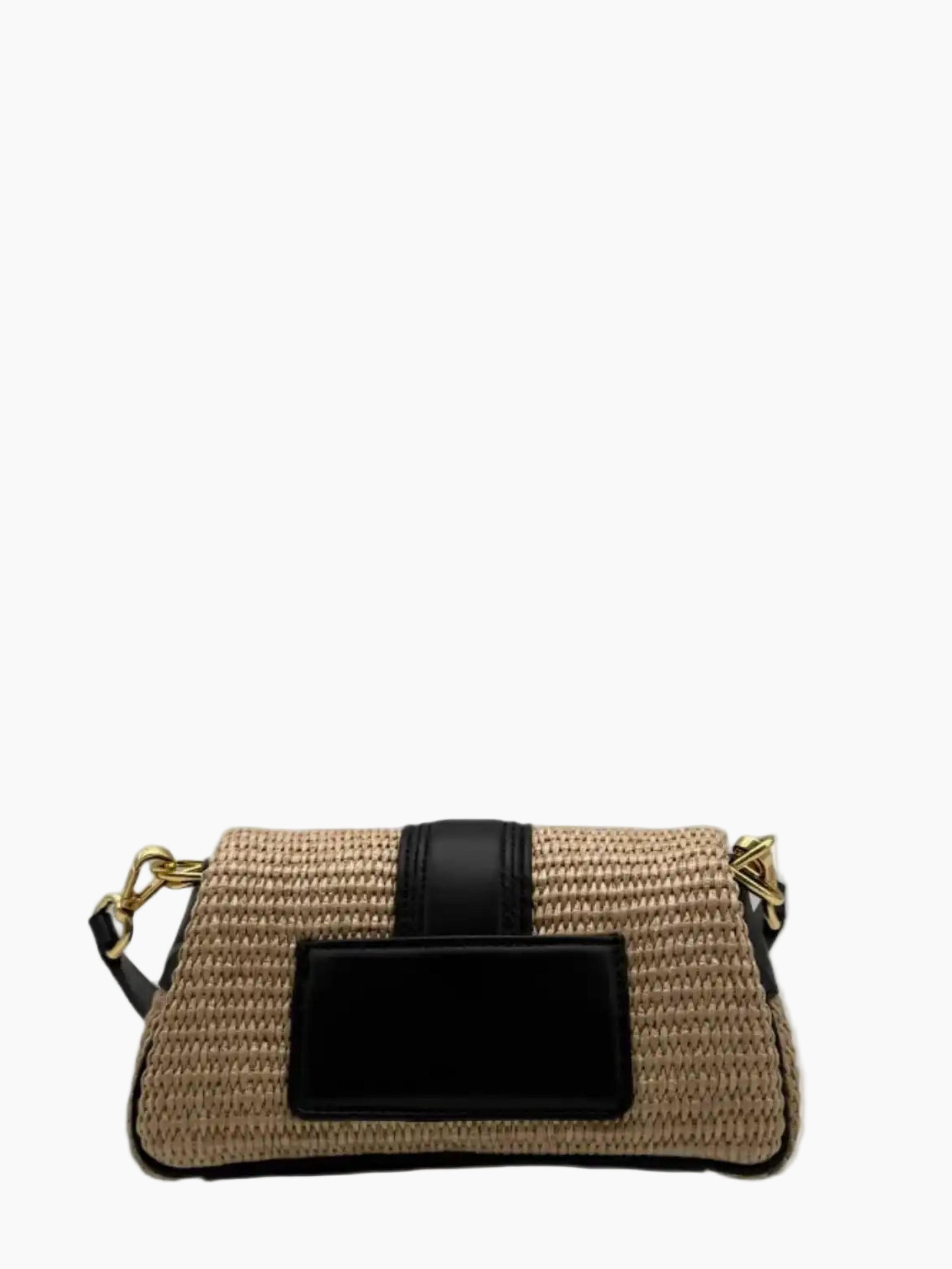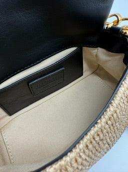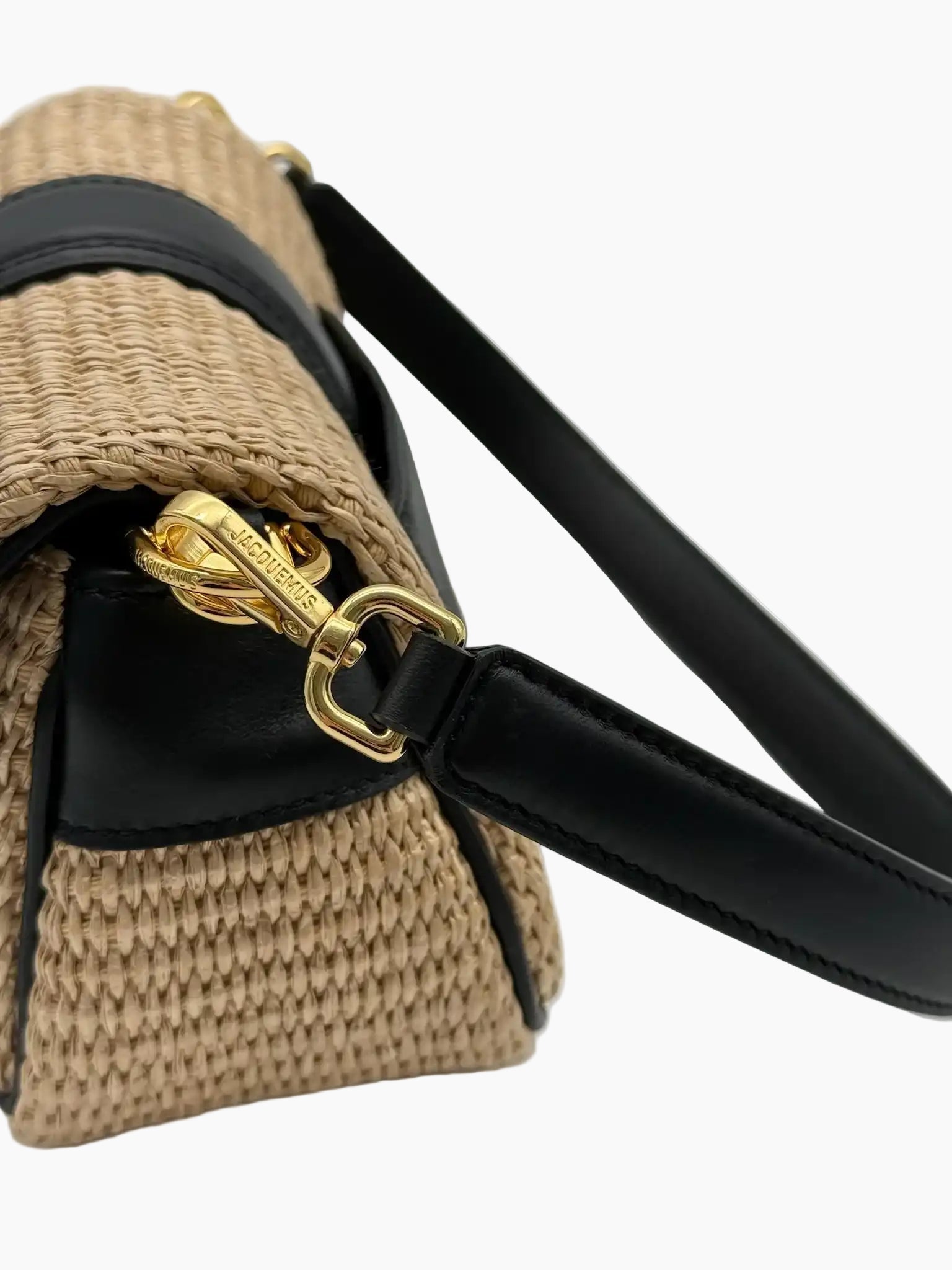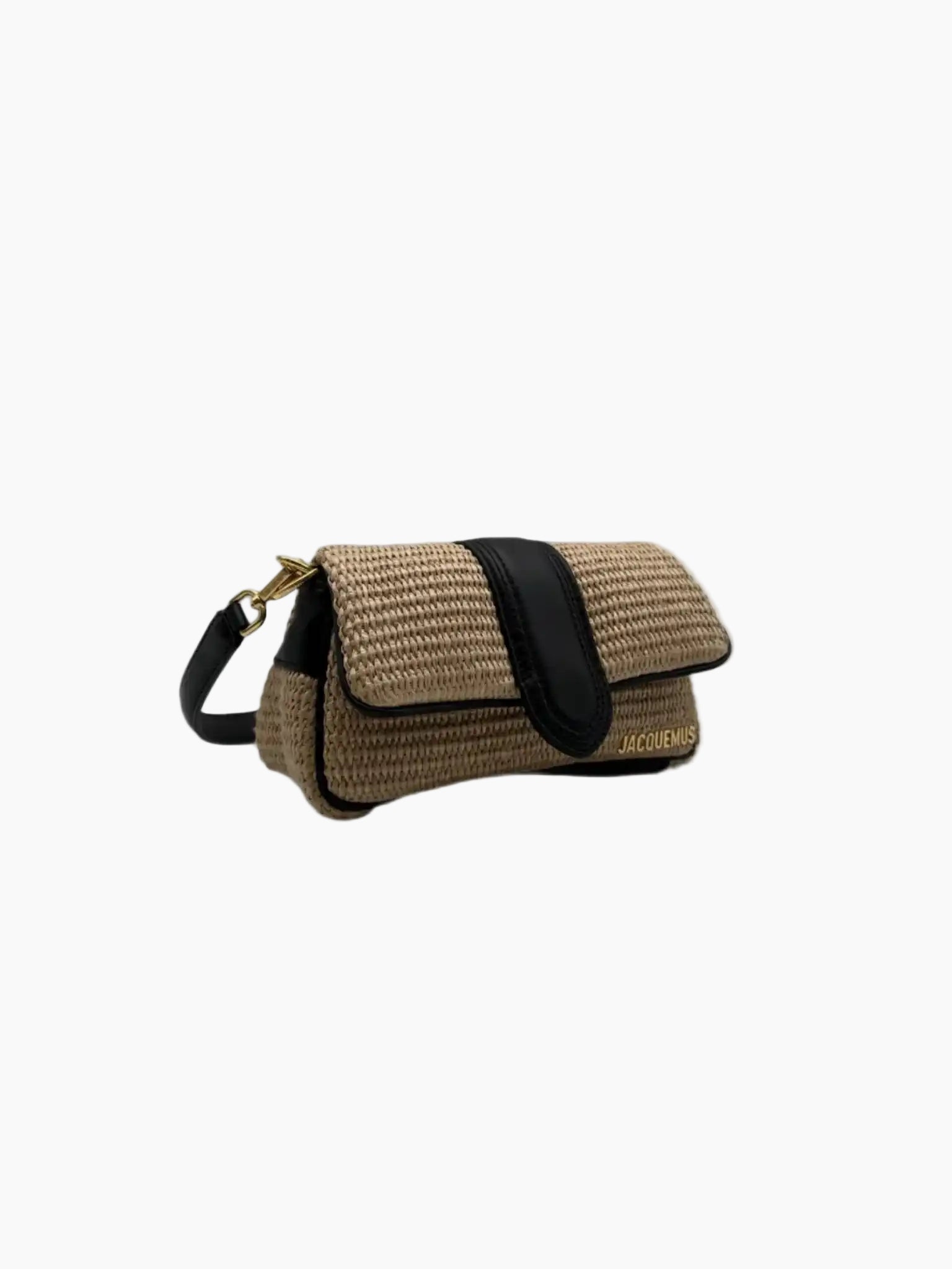 The Le Petit Bambimou bag by Jacquemus is an elegant mini bag made of woven straw, with black leather details that enhance its silhouette. The gold logo applique and adjustable shoulder strap make this accessory the perfect combination of rustic style and modern design. Compact and refined, it's ideal for completing your summer looks with a distinctive touch.