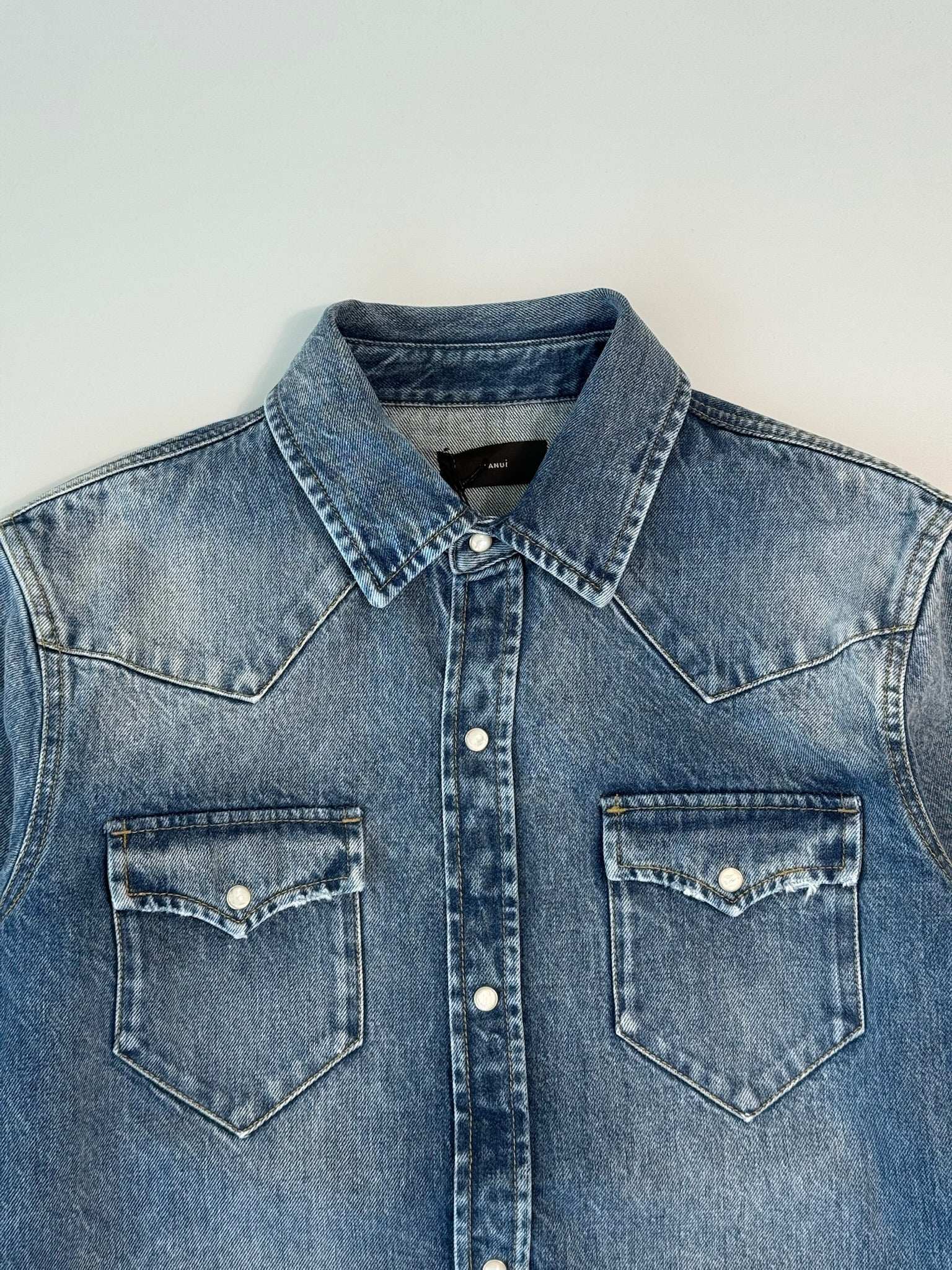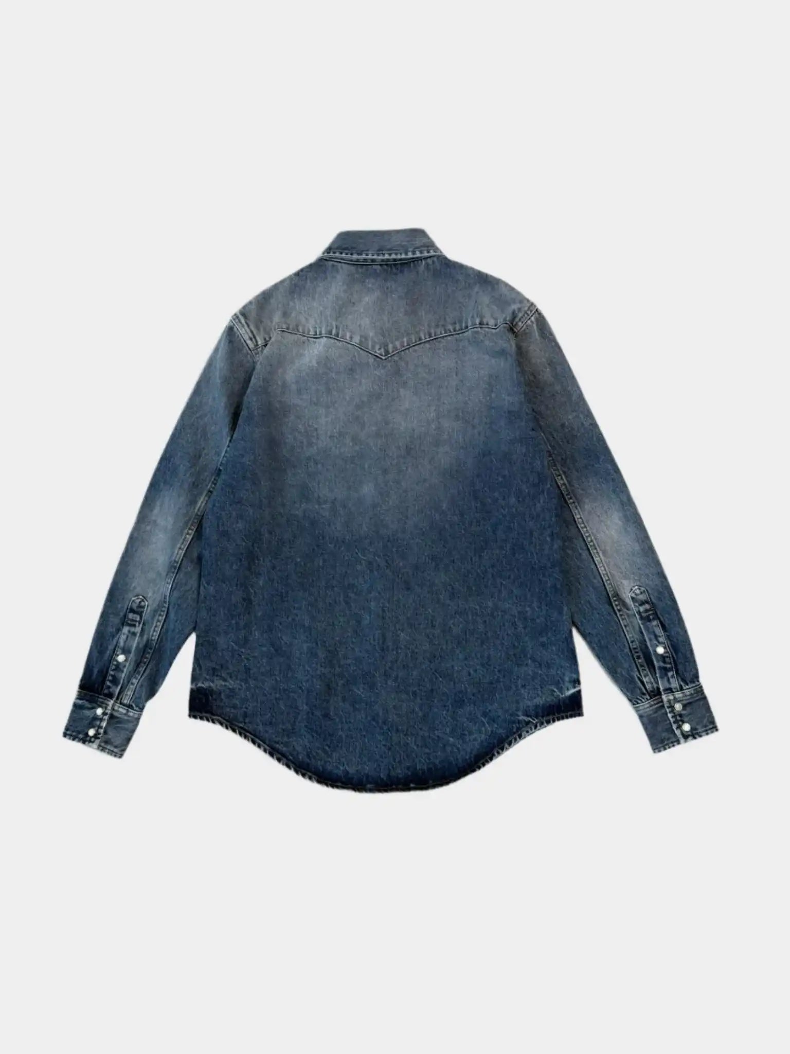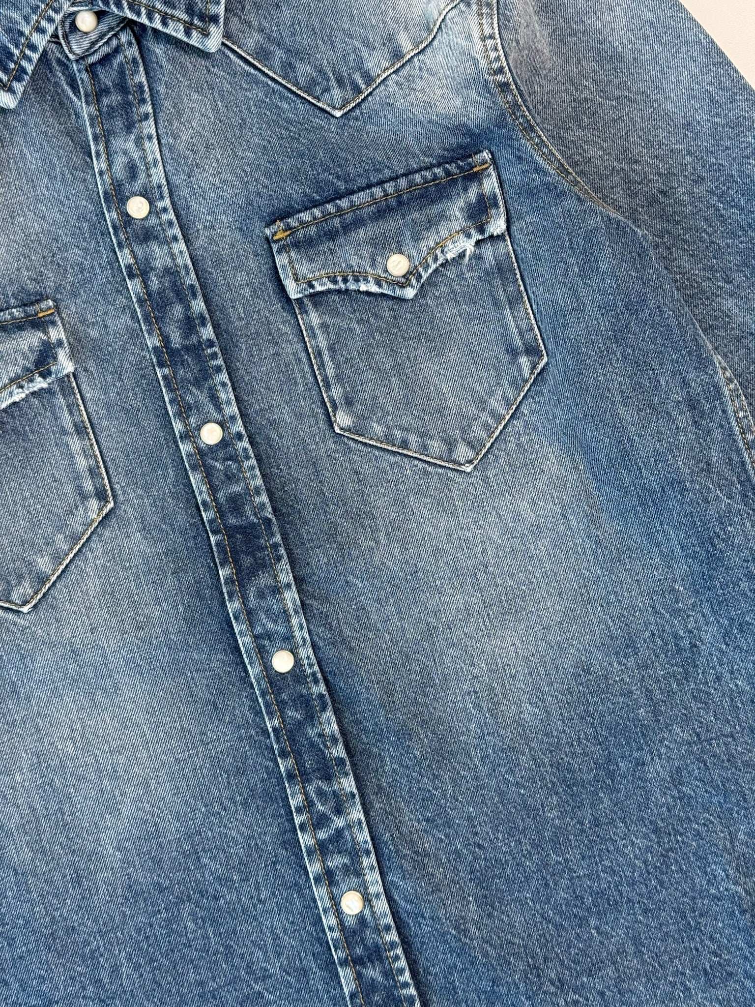 The medium wash denim shirt offers a classic western-inspired style with a contemporary twist. The two front pockets with flaps and pearl buttons, together with the contrasting stitching, give character and authenticity to the garment. Made from durable and soft cotton denim, it is perfect for casual, layered or streetwear looks.