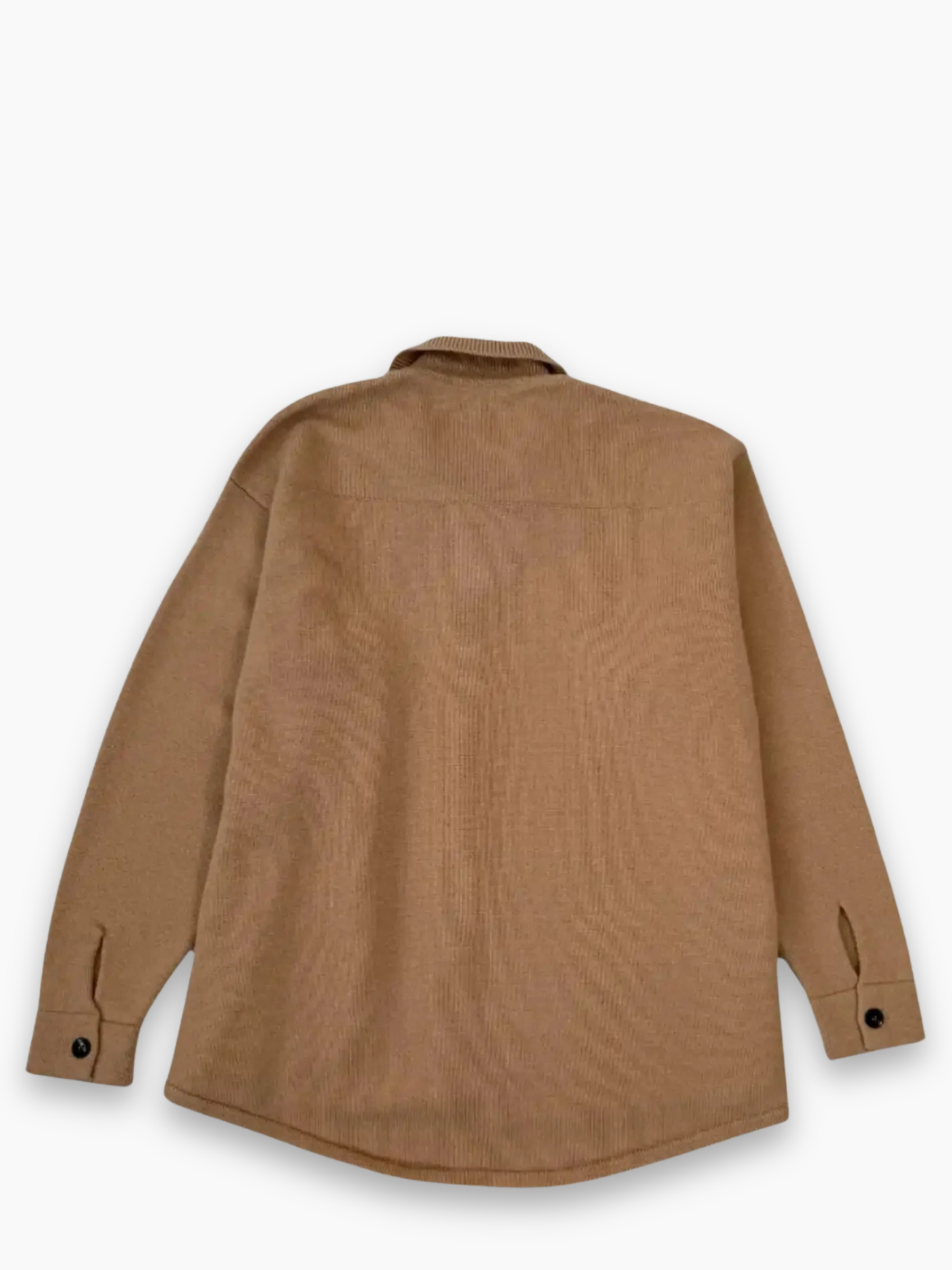 Beige knitted shirt by Laneus, made of a soft and warm yarn. The model features an essential design with a classic collar, a patch pocket on the chest and a front closure with contrasting buttons. The regular cut and asymmetrical length make the garment perfect to wear both as a shirt and as a light over-shirt.