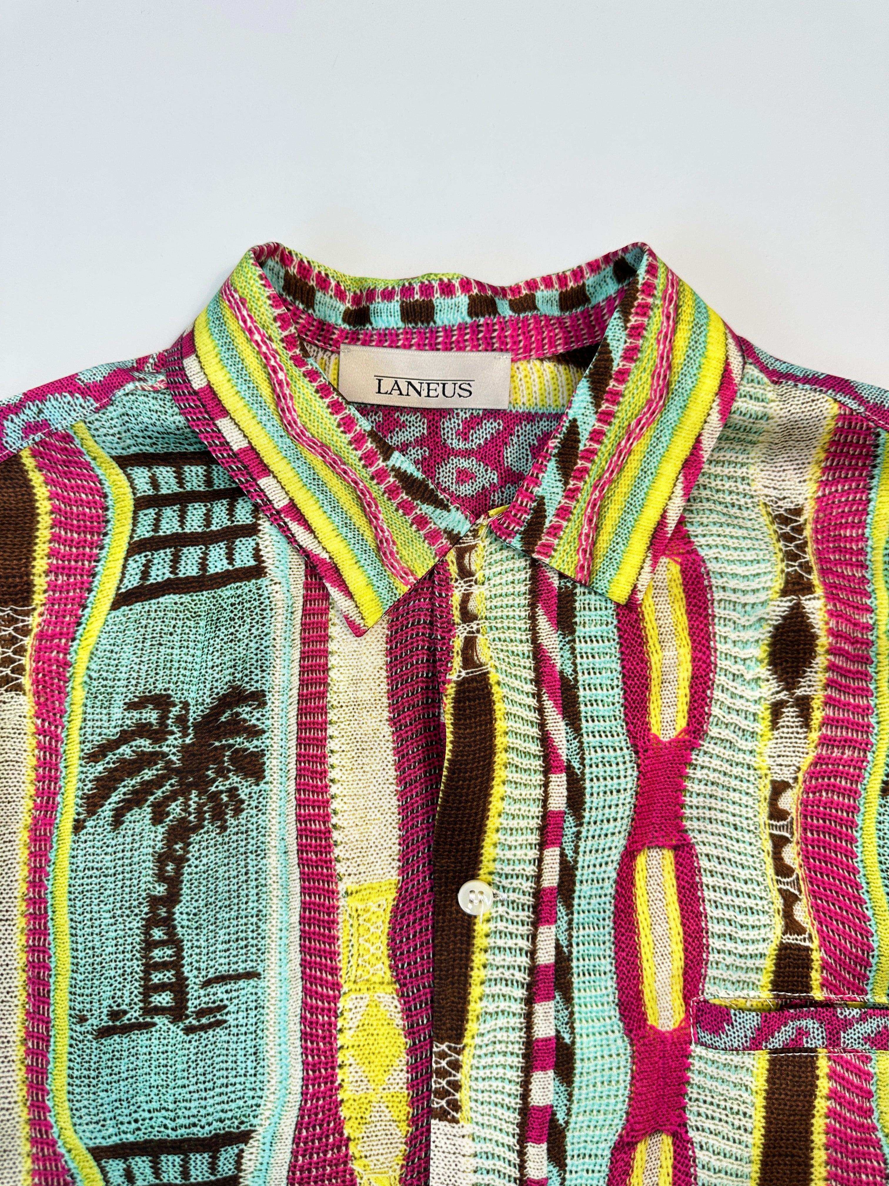 Summer shirt by Laneus, made of multicolor viscose with a vibrant tropical pattern. Featuring a classic collar, front buttoning and short sleeves, it combines a holiday spirit with a sophisticated aesthetic. Perfect for bold summer looks or to add a graphic twist to everyday clothing.