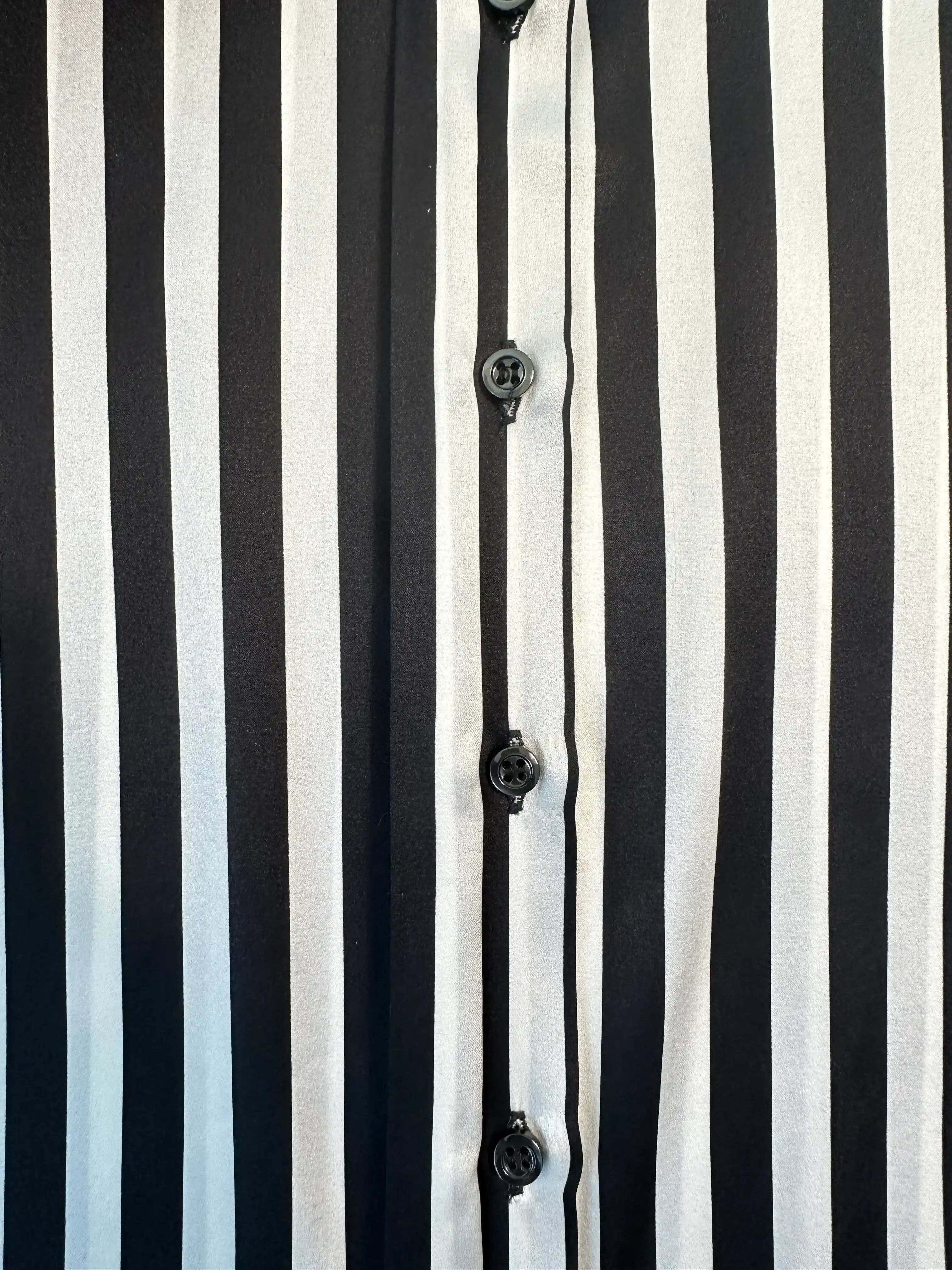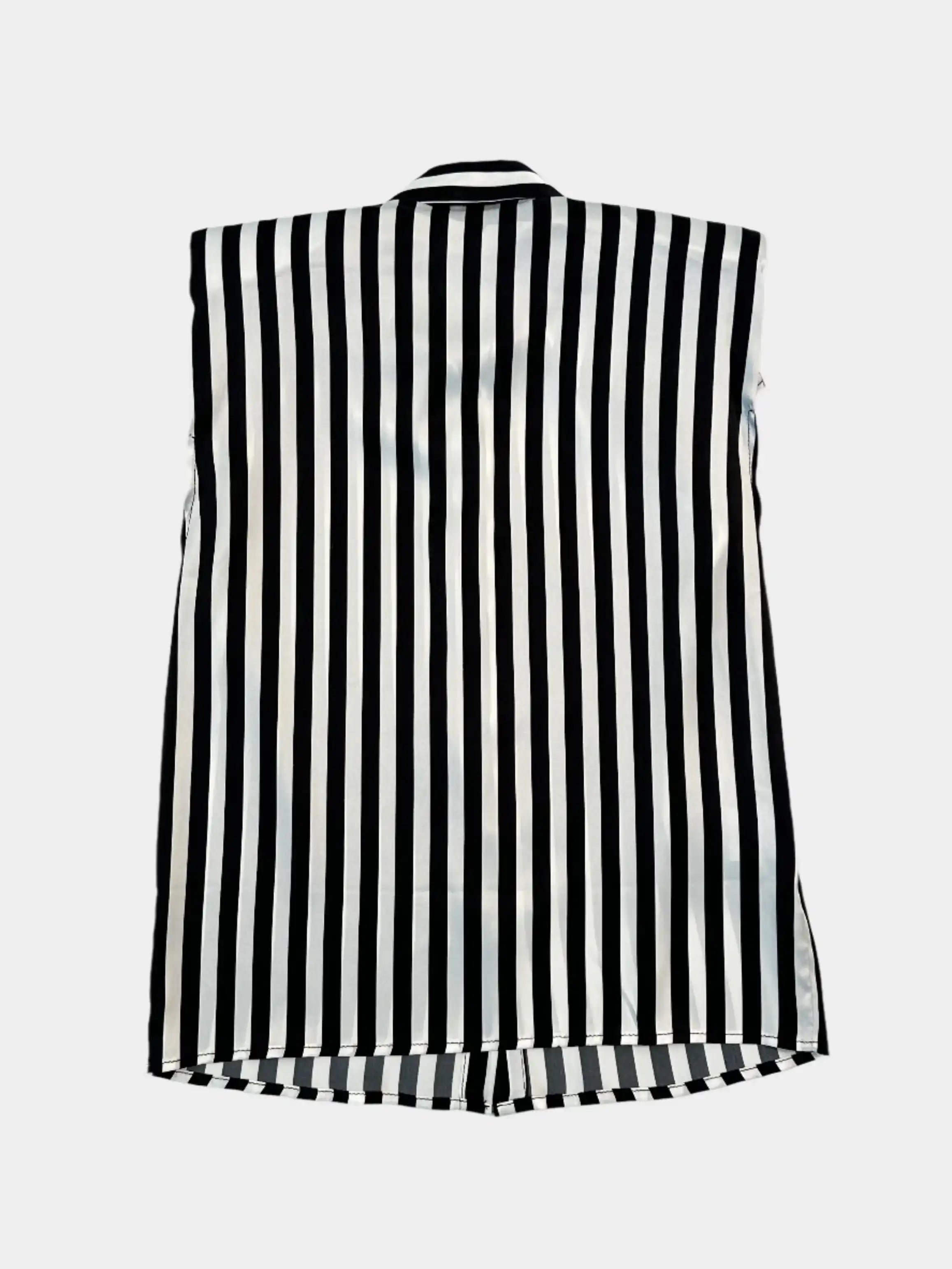 Sleeveless shirt with black and white vertical stripes, characterized by padded shoulders that give structure to the garment. The classic collar and front closure with buttons complete a strong and contemporary look, perfect for bold outfits with a sophisticated touch.