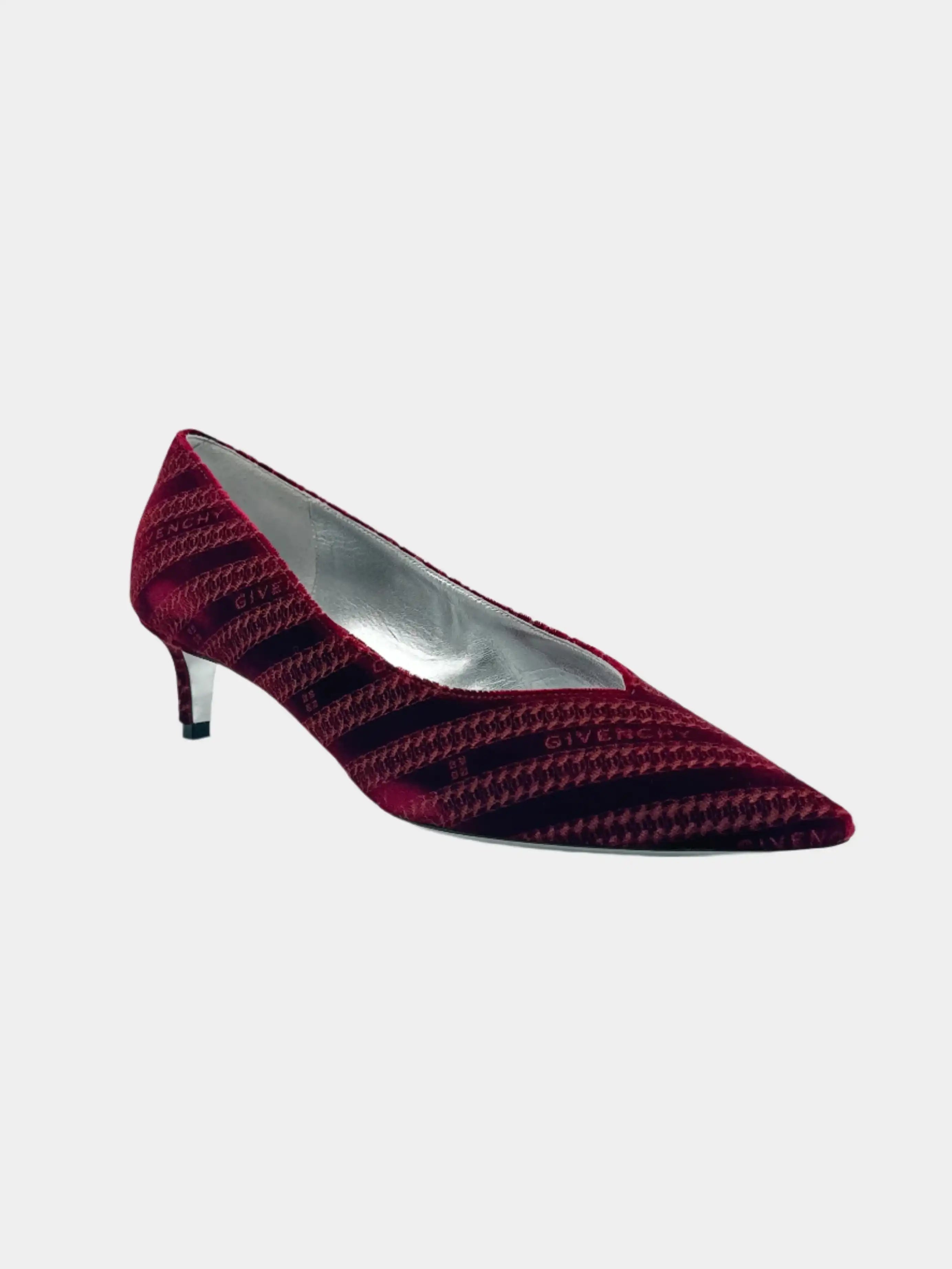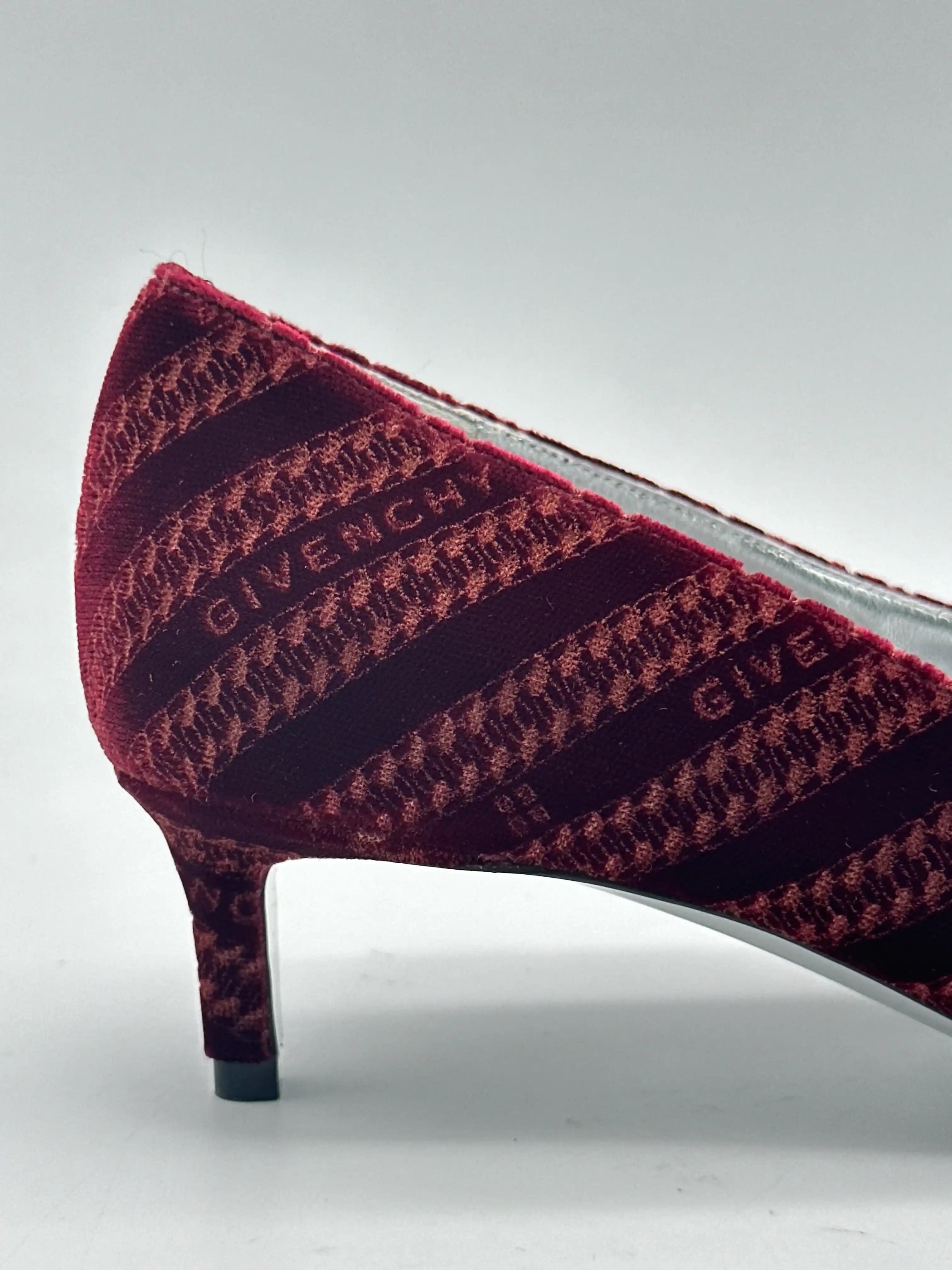 Red pumps by Givenchy, made of diagonal velvet with allover logo. The tapered silhouette and thin low heel give a refined and versatile elegance, perfect for adding a touch of style even to the most essential outfits.