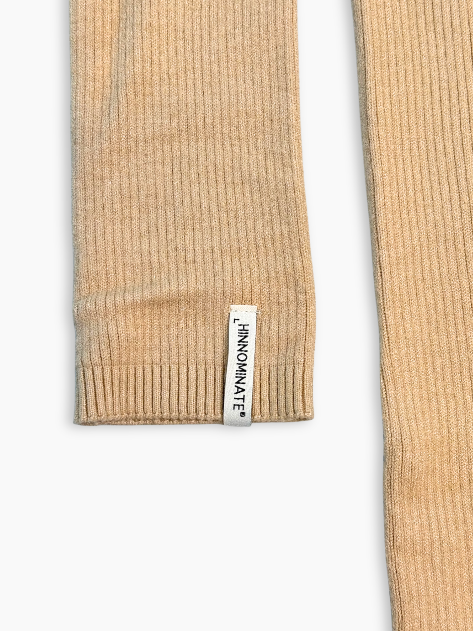 Long, hazelnut-colored ribbed knit dress with a fitted design and a soft neckline that can be worn off the shoulders or slightly dropped. The matching sleeves add a contemporary and refined touch, perfect for an elegant and feminine look. The stretch fabric ensures comfort and a perfect fit.