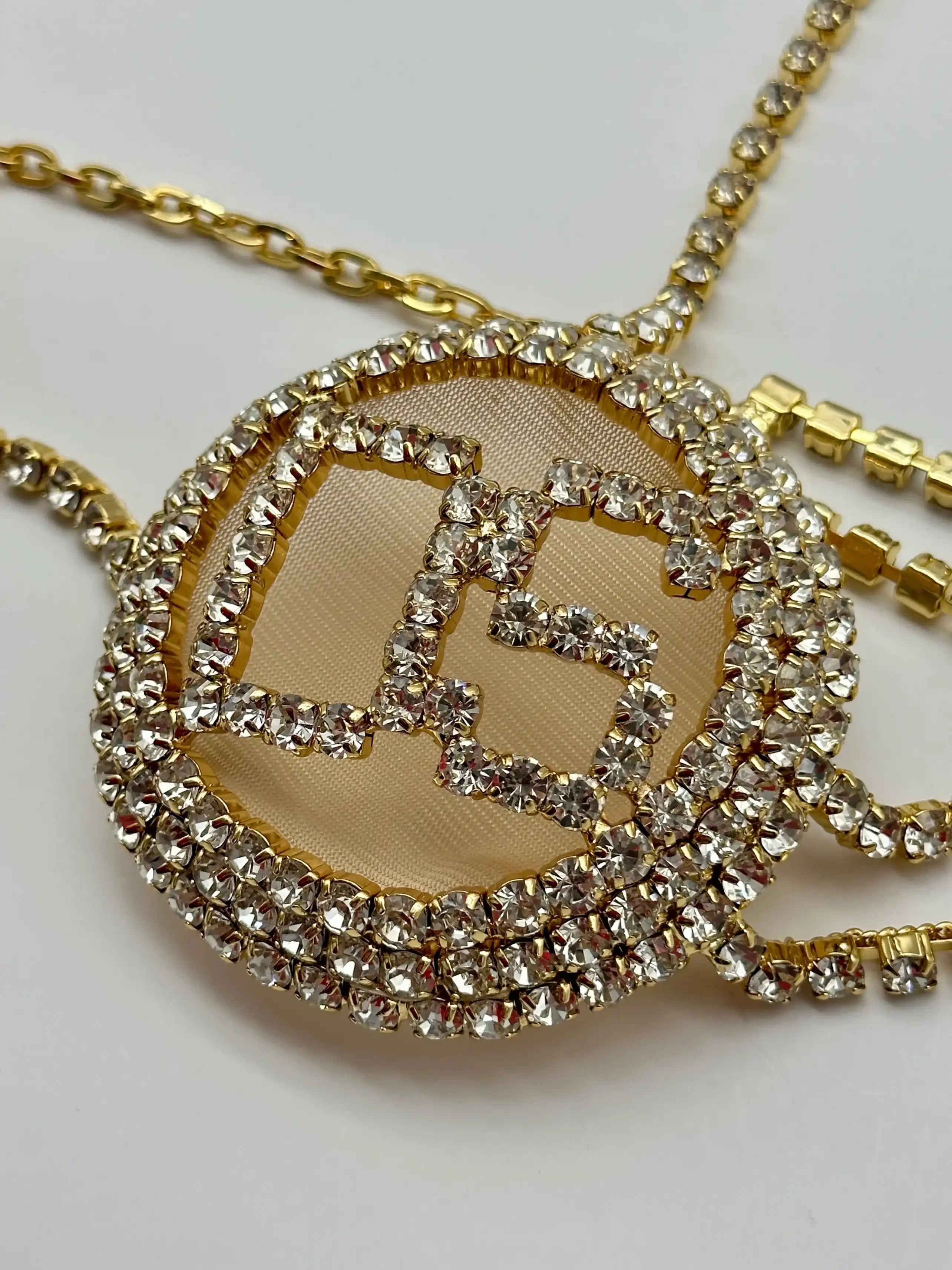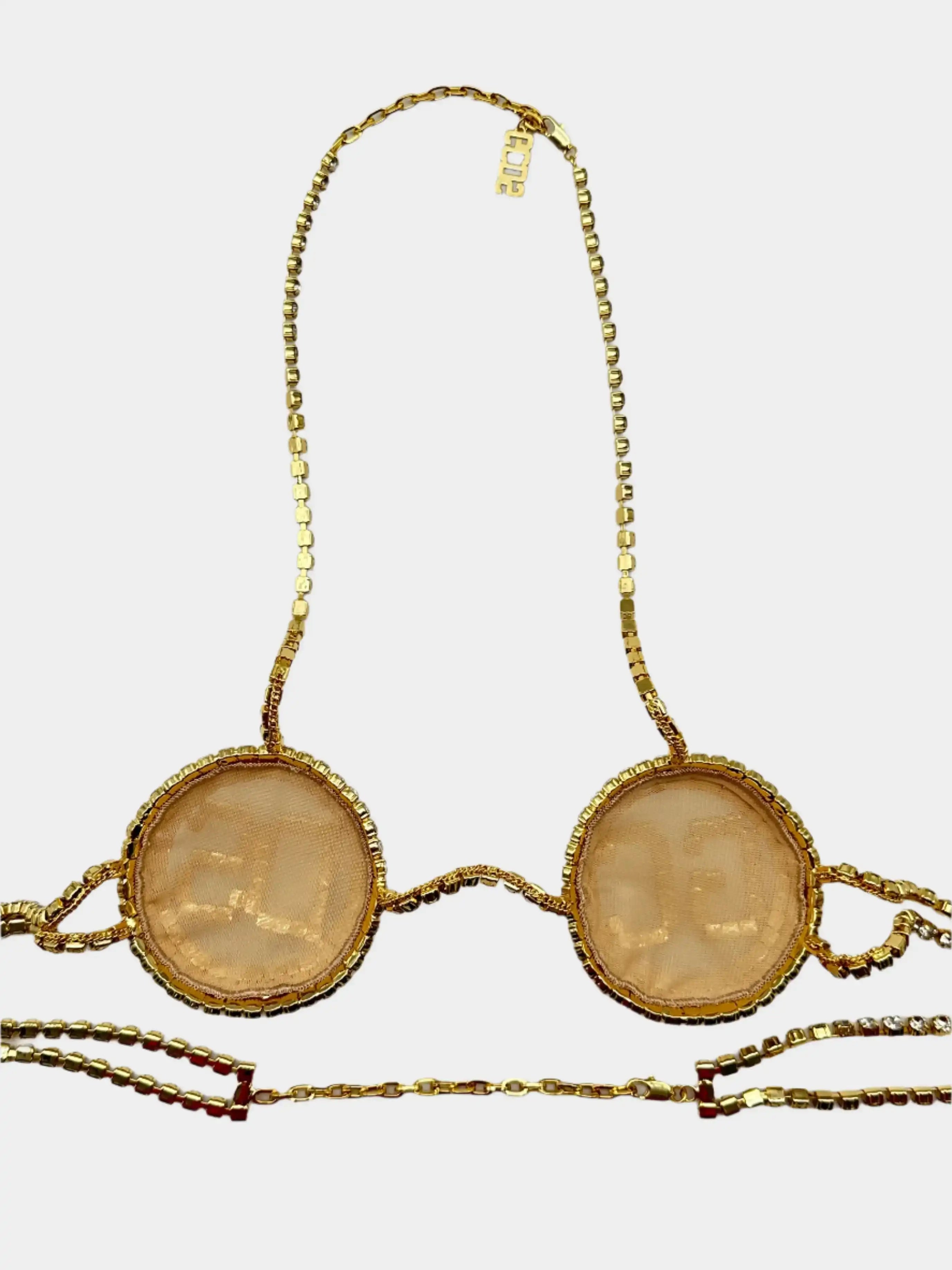 Jewel bra with crystals and gold structure. Bold design and luxury details.