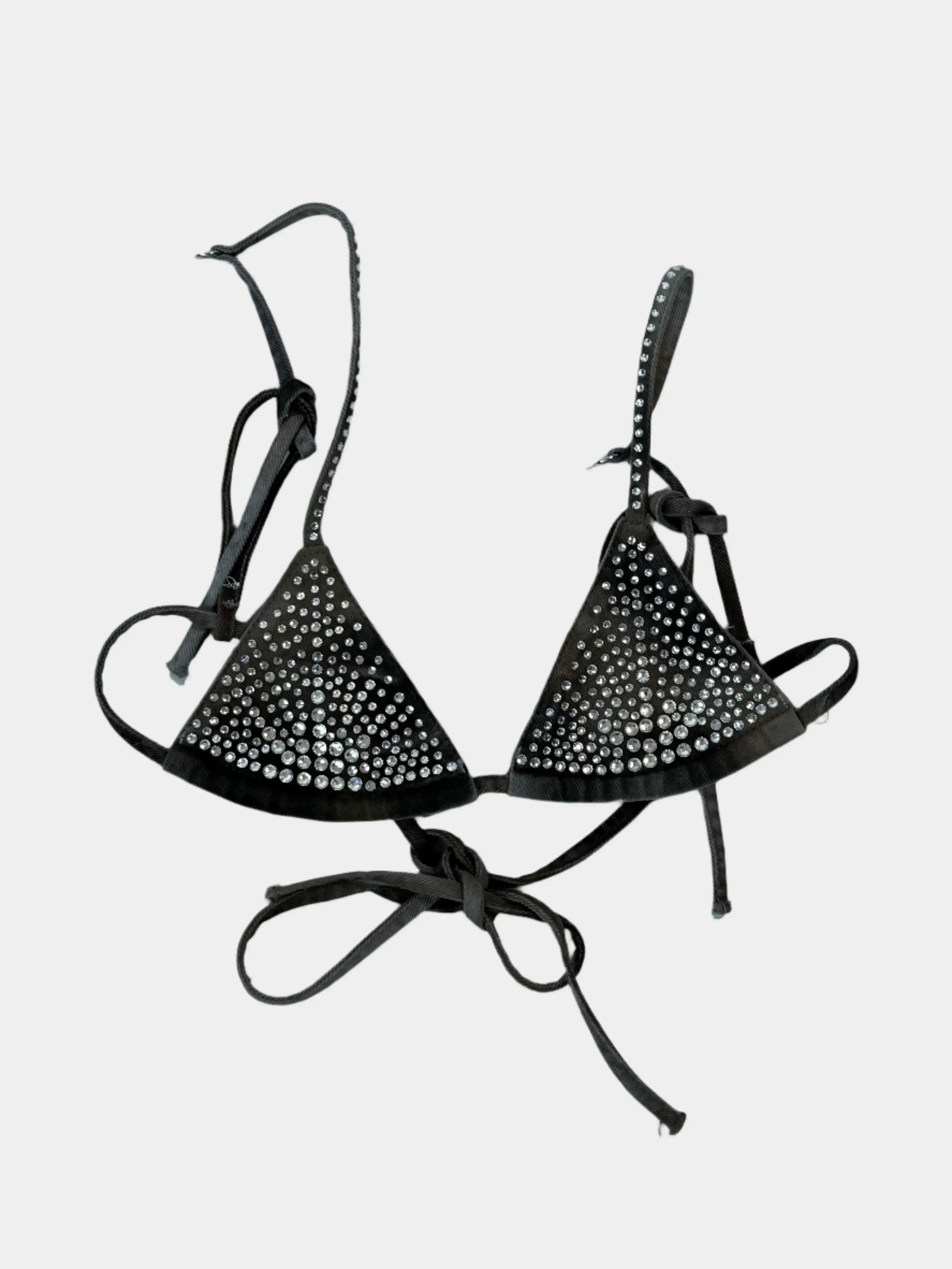 The Attico triangle top is a bold and sparkling style statement. Crafted from grey fabric with a triangle structure, it is embellished with a dense application of bright crystals across the surface. The thin laces allow for an adjustable and sensual fit, perfect for party looks or trendy layering.
