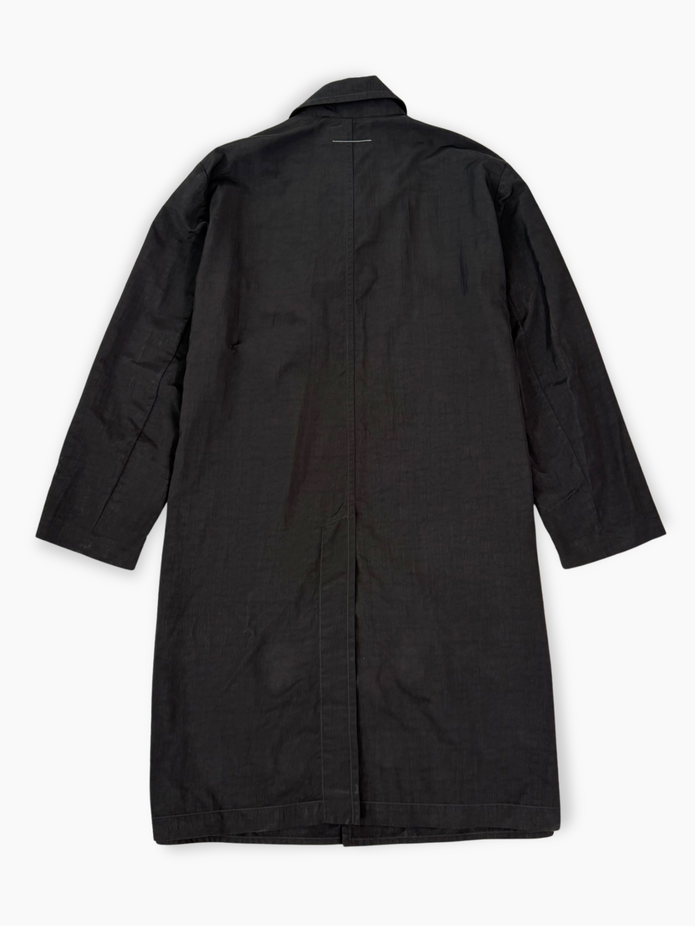 Clean lines, a straight fit, and timeless style: this black coat by Maison Margiela MM6 is the ideal outerwear for those seeking functionality and elegance. Crafted from a lightweight and durable technical fabric, it features a clean silhouette with a classic collar and concealed closure, perfect for completing urban or formal looks with a contemporary twist.
