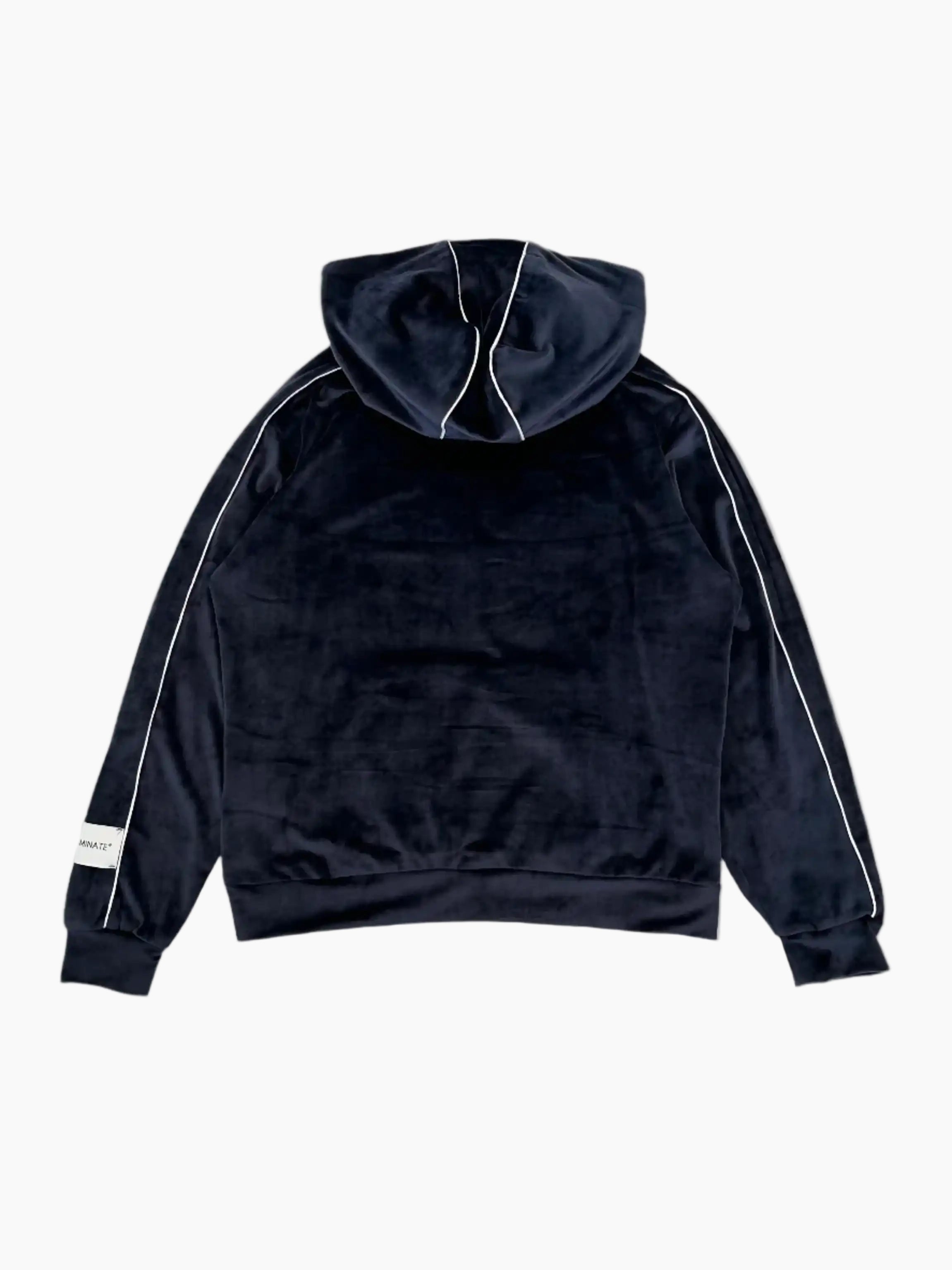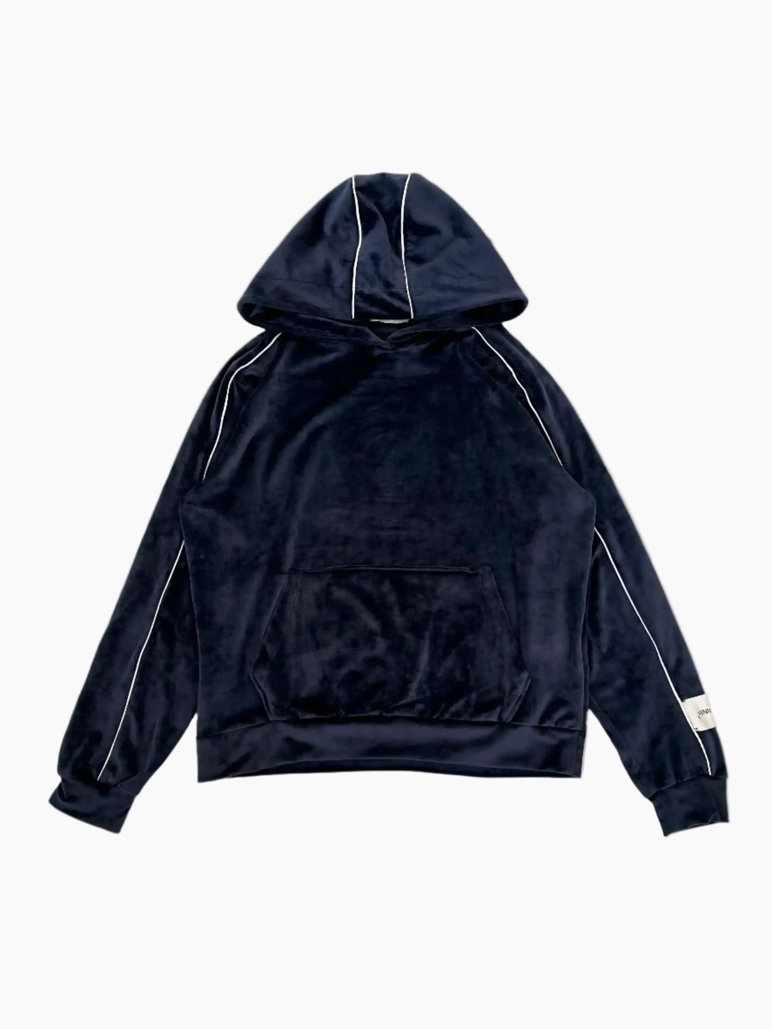 Soft blue chenille hoodie with contrasting piping and logo label on the sleeve. A comfortable and sophisticated garment, ideal for a refined casual style.