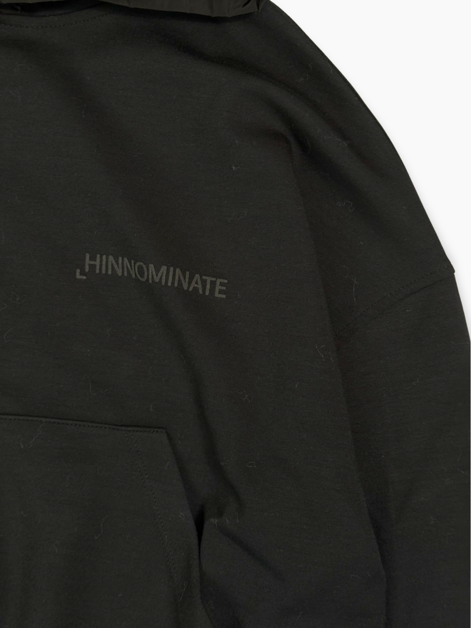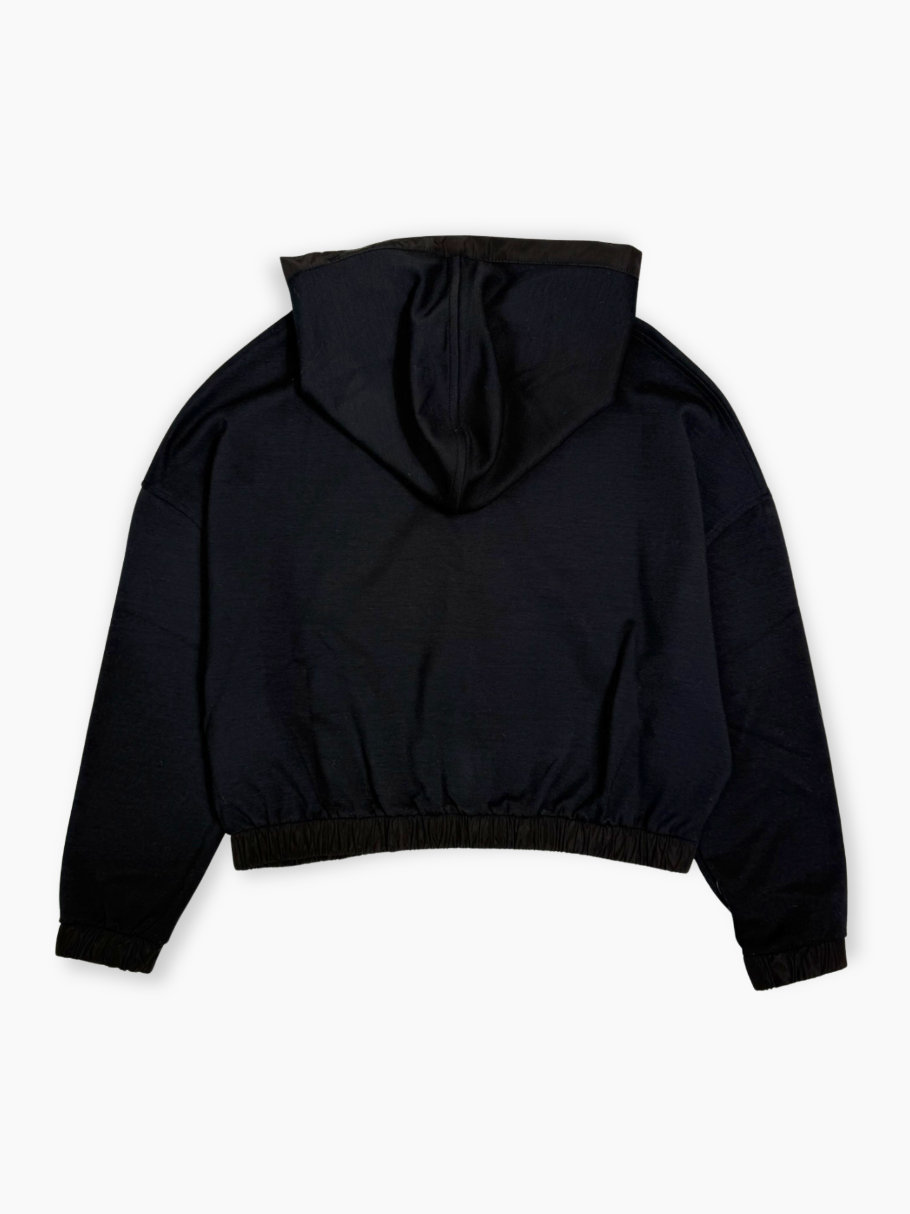 Women's cropped hooded sweatshirt with a front zip, made from a soft blend of modal and nylon. The style features elasticated cuffs and hem for a comfortable and feminine fit. The minimalist style and black color make it a versatile piece, perfect for casual and contemporary looks.
