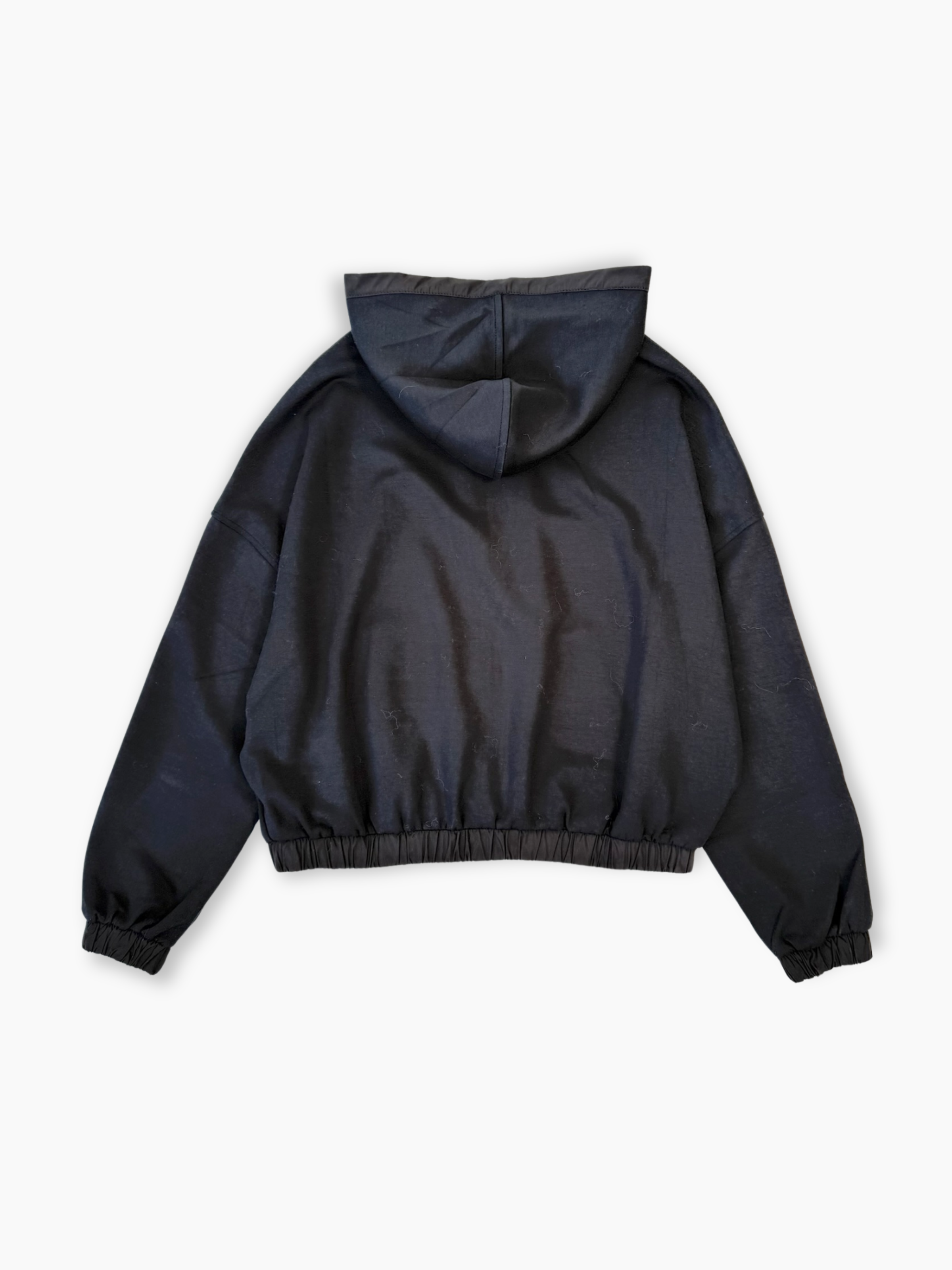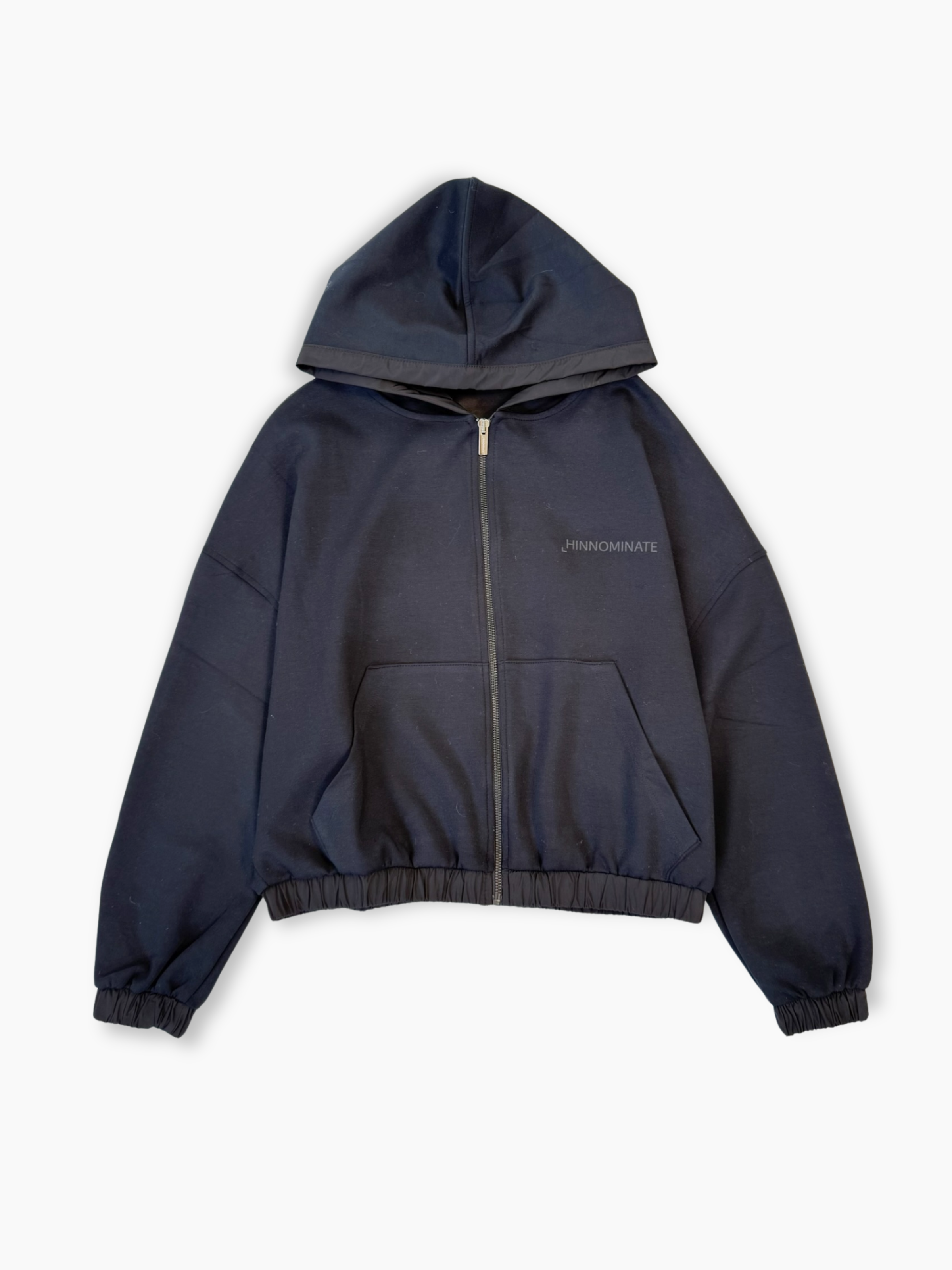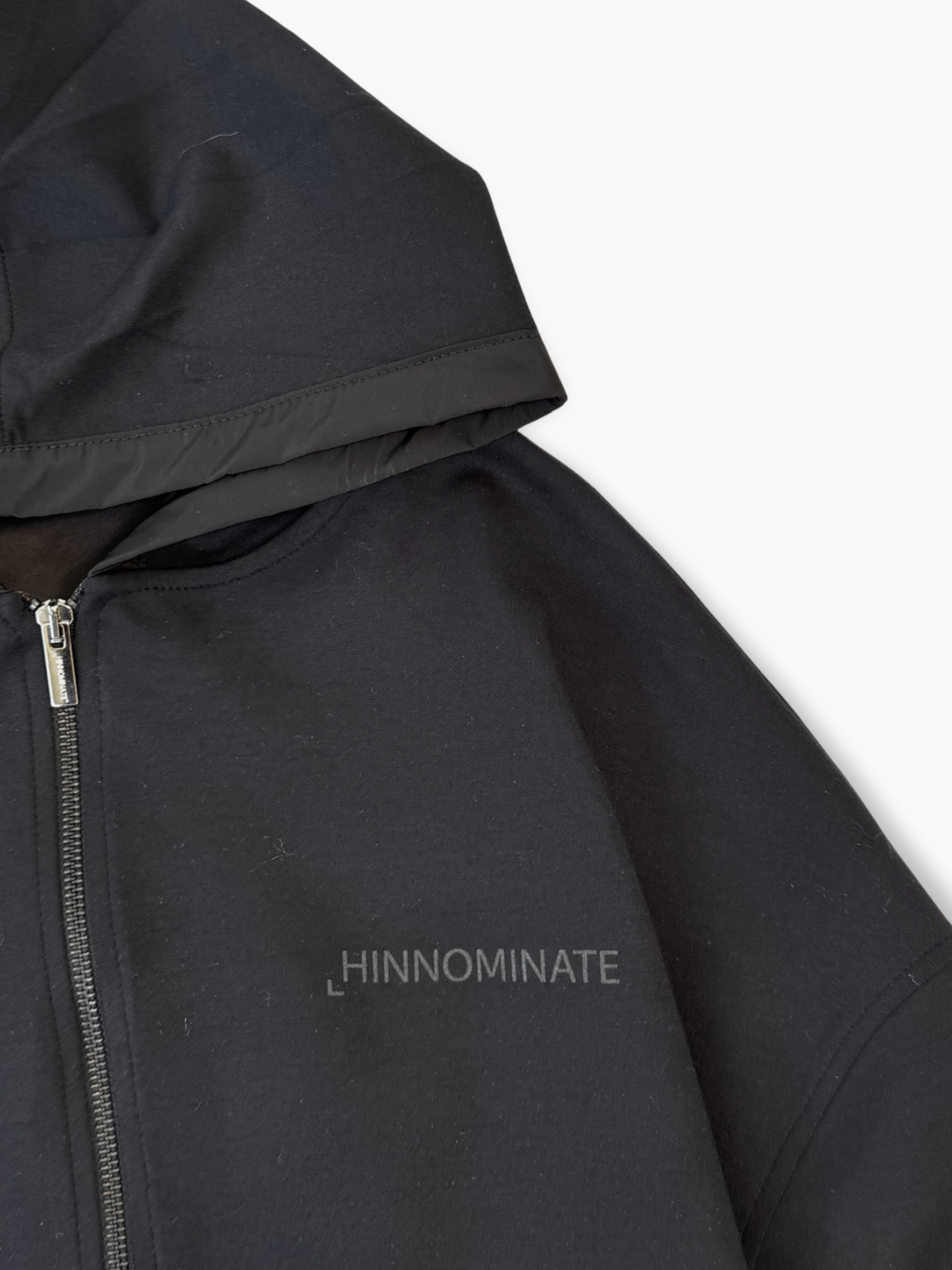 This black Hinnominate sweatshirt features a simple yet detailed design, perfect for a casual, urban look. Crafted from a technical modal blend, it features a hood with tone-on-tone nylon trim, a front zip closure, and a kangaroo pocket. The Hinnominate logo is printed in dark grey on the left chest. The comfortable fit and gathered elastic waistband make it ideal for pairing with joggers or relaxed jeans.