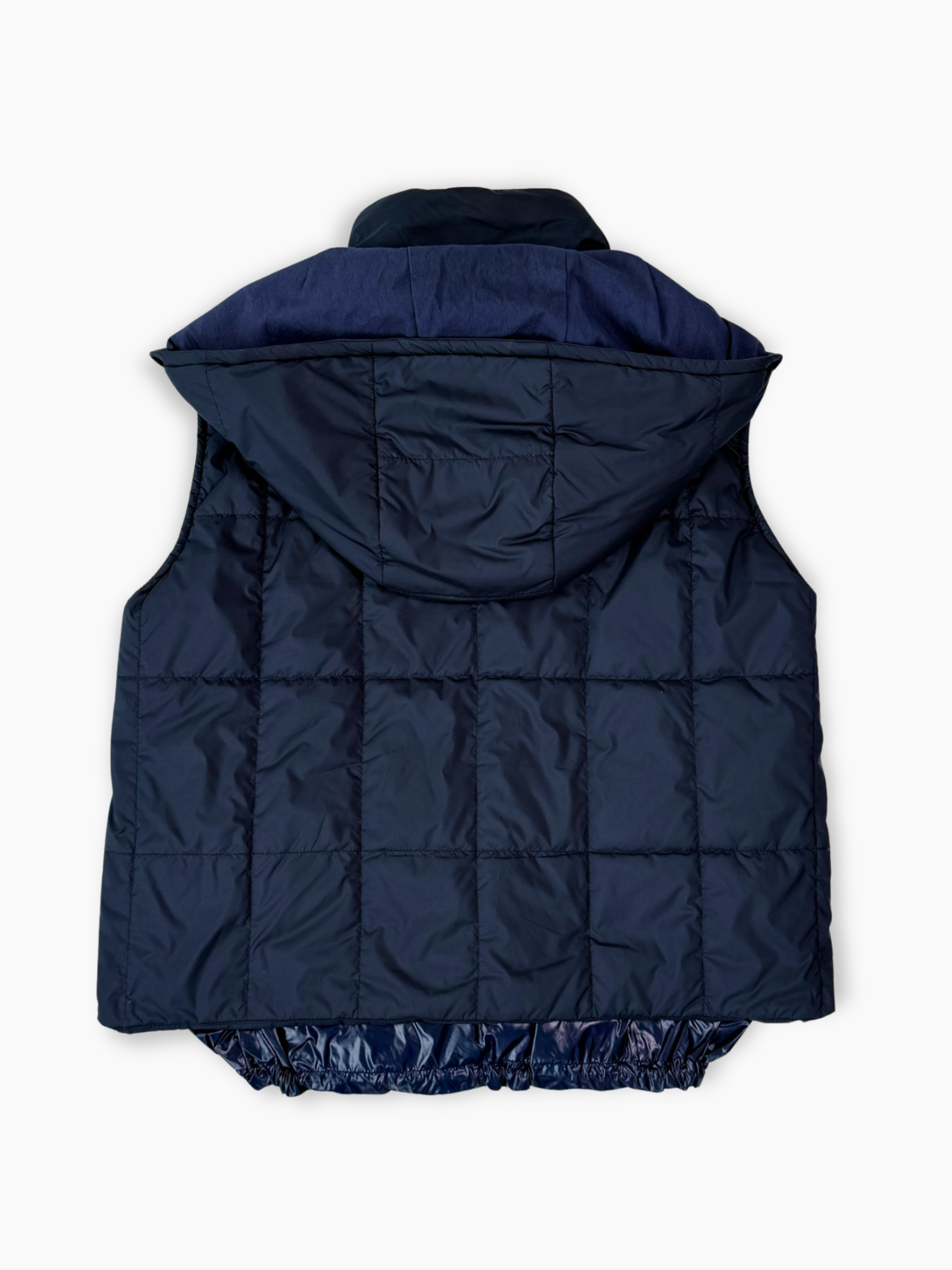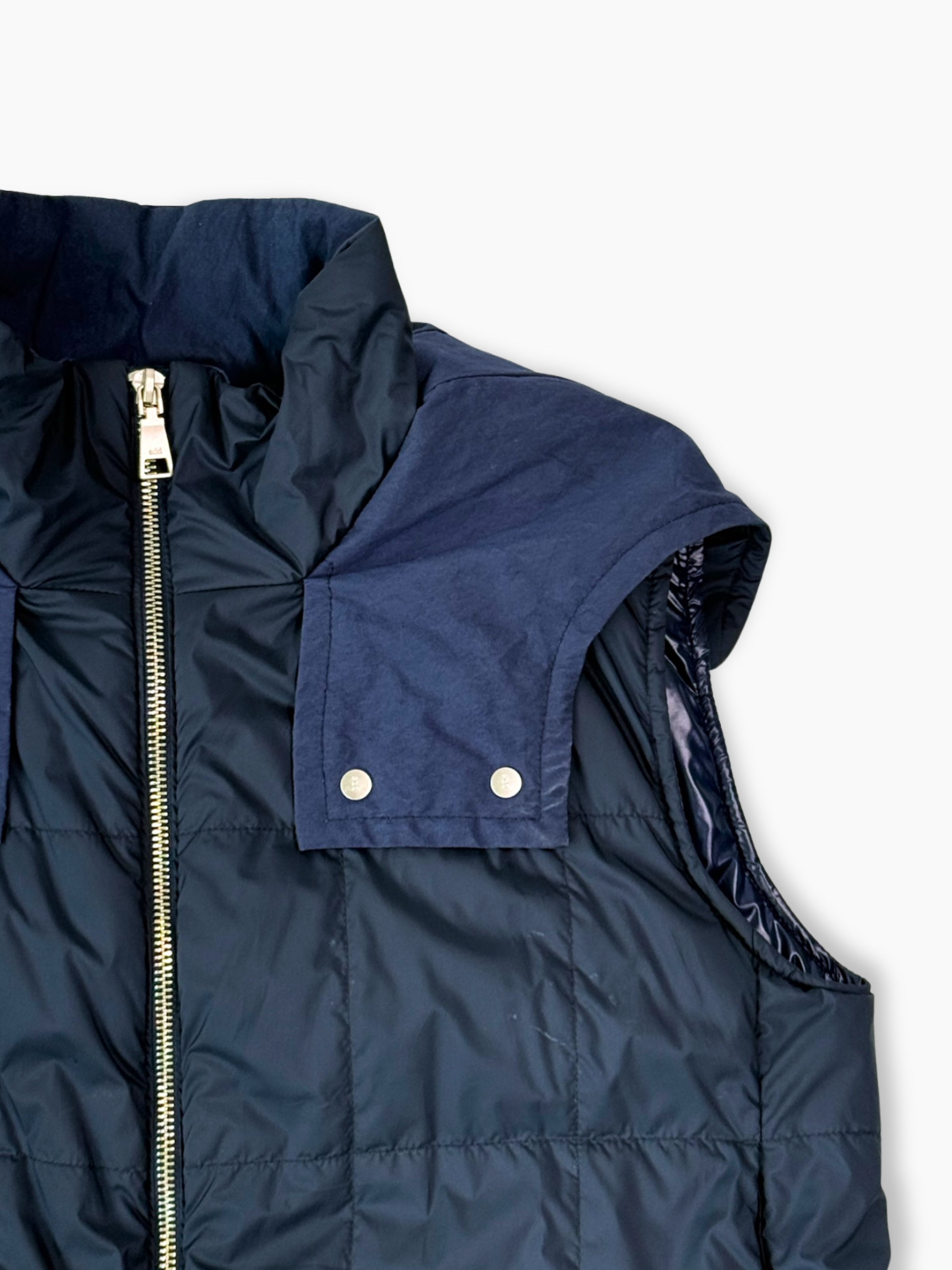 ADD padded vest in navy blue technical fabric with matching shoulder details. Featuring box quilting, a two-way zip front, and a protective high collar. A versatile and functional piece, ideal for layering over sweatshirts or sweaters to complete a casual look.