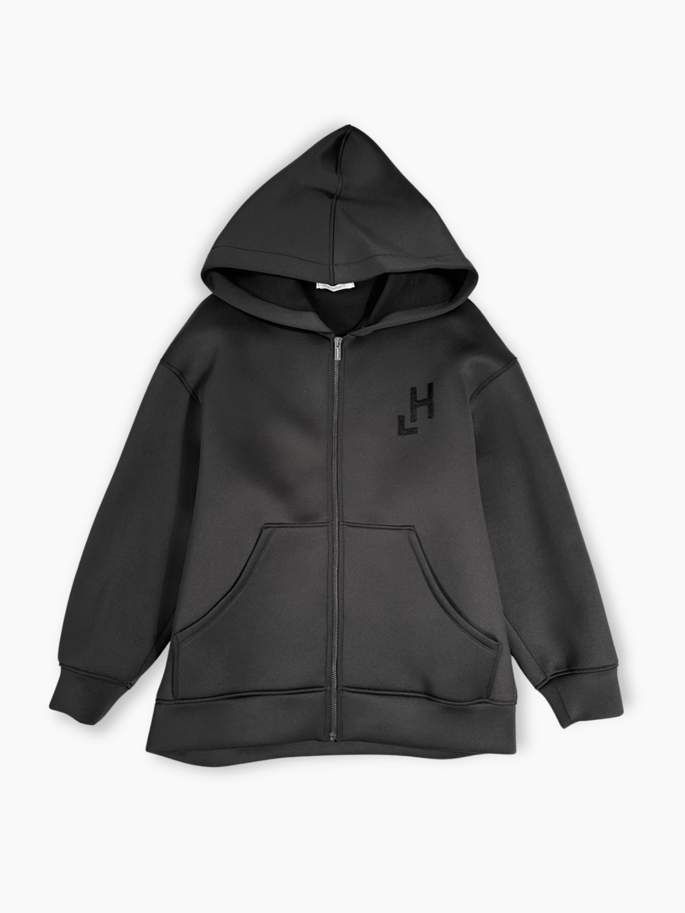 Black Hinnominate zip-up hoodie featuring a tone-on-tone LH logo embroidered on the chest. Crafted from soft technical fabric, it combines comfort and style thanks to its streamlined design with kangaroo pockets. A versatile piece that adapts to both casual and contemporary streetwear looks.