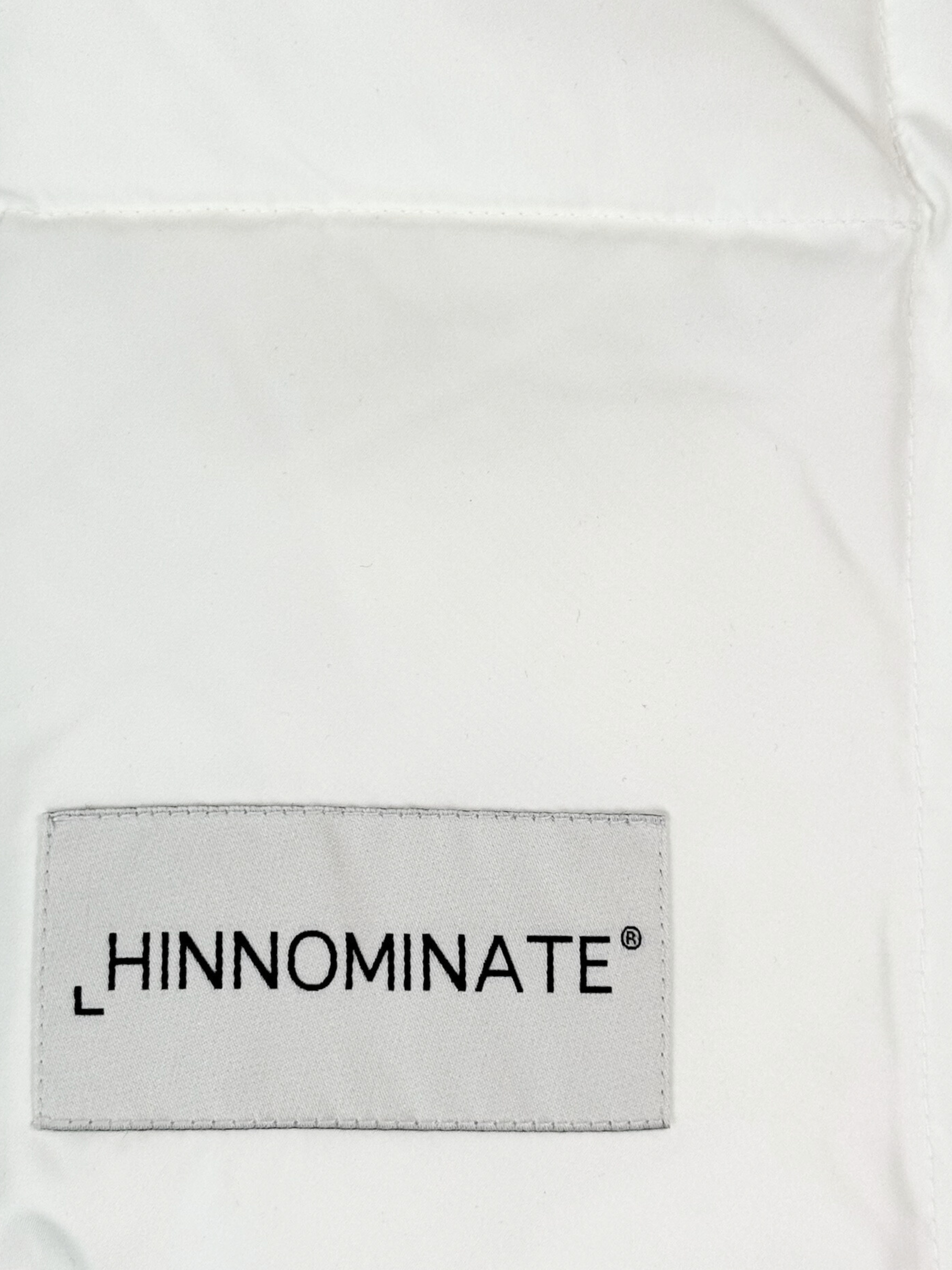 White Hinnominate vest made of quilted technical fabric with warm padding. It features a high, wrap-around collar, a covered zip closure, and large front flap pockets. A versatile and practical piece to wear over sweatshirts or sweaters for a casual, contemporary style.