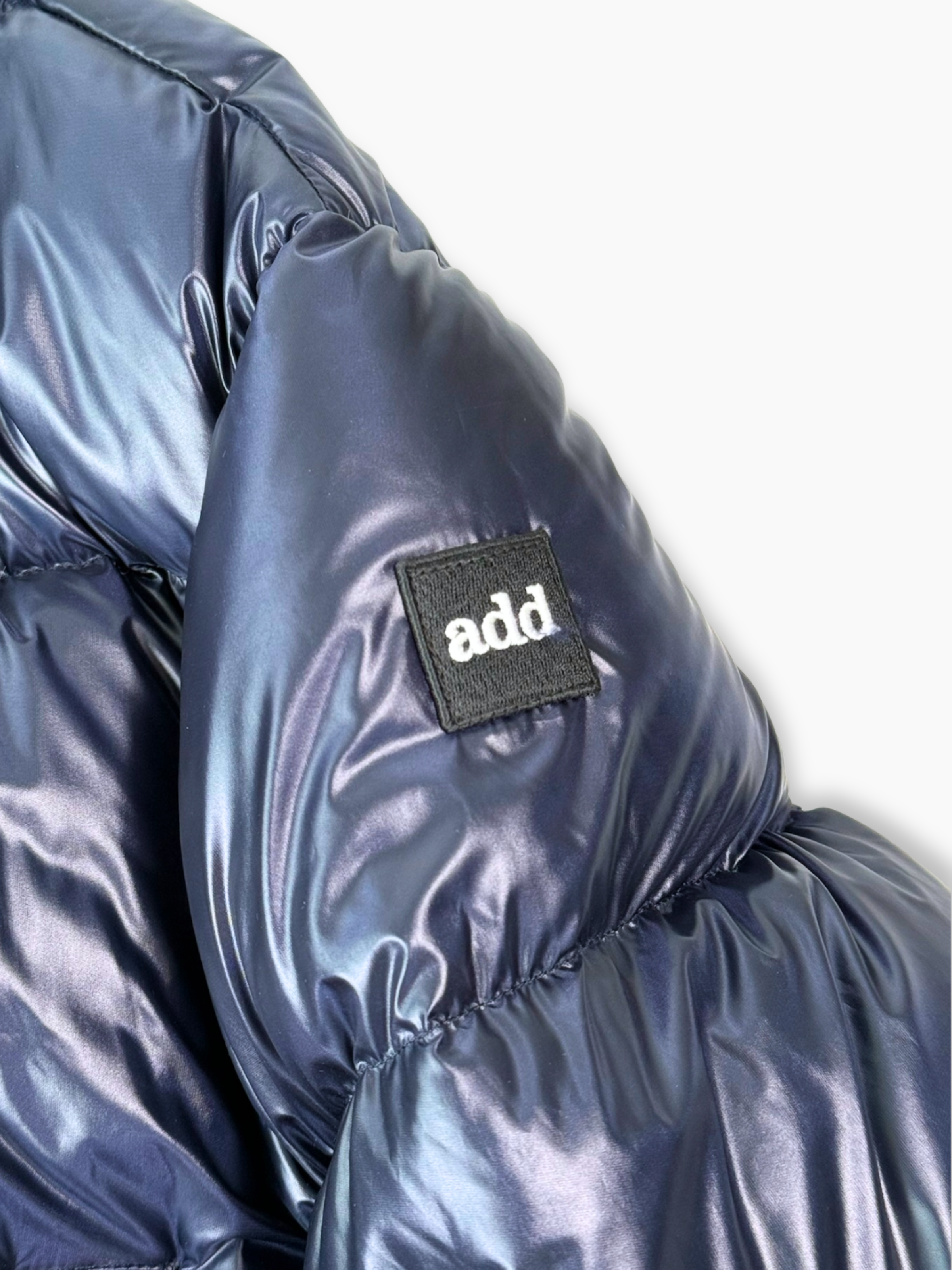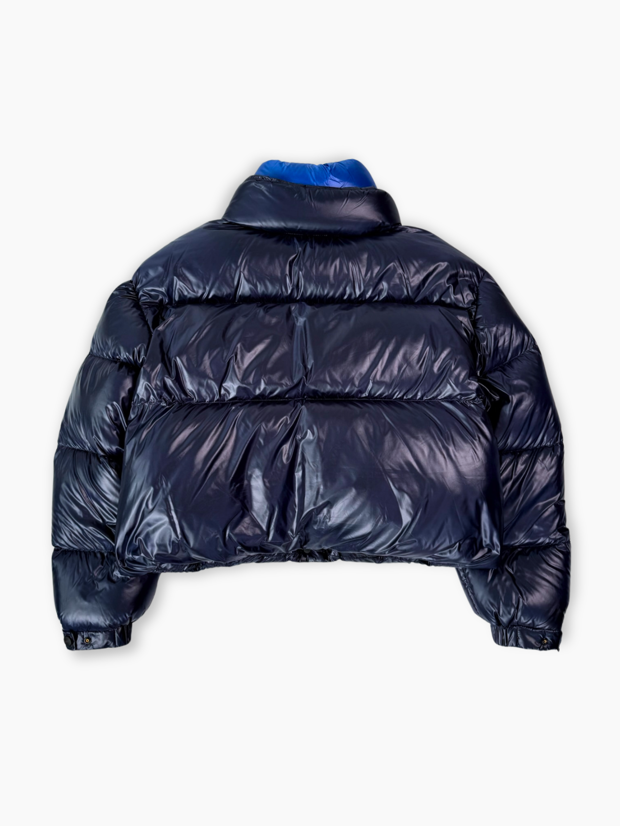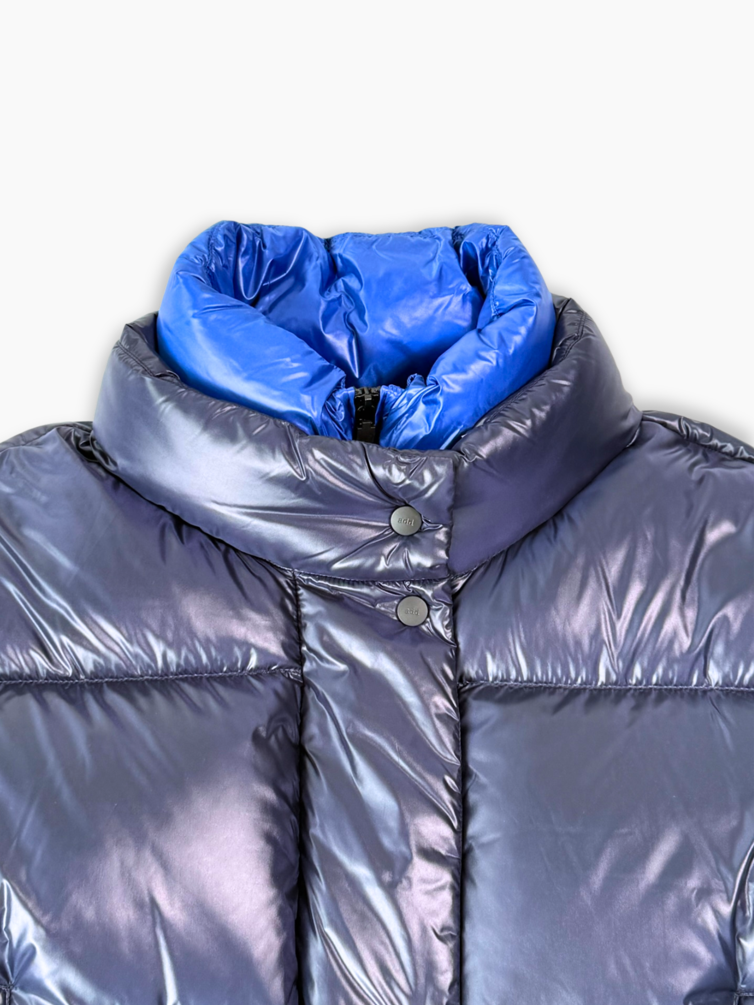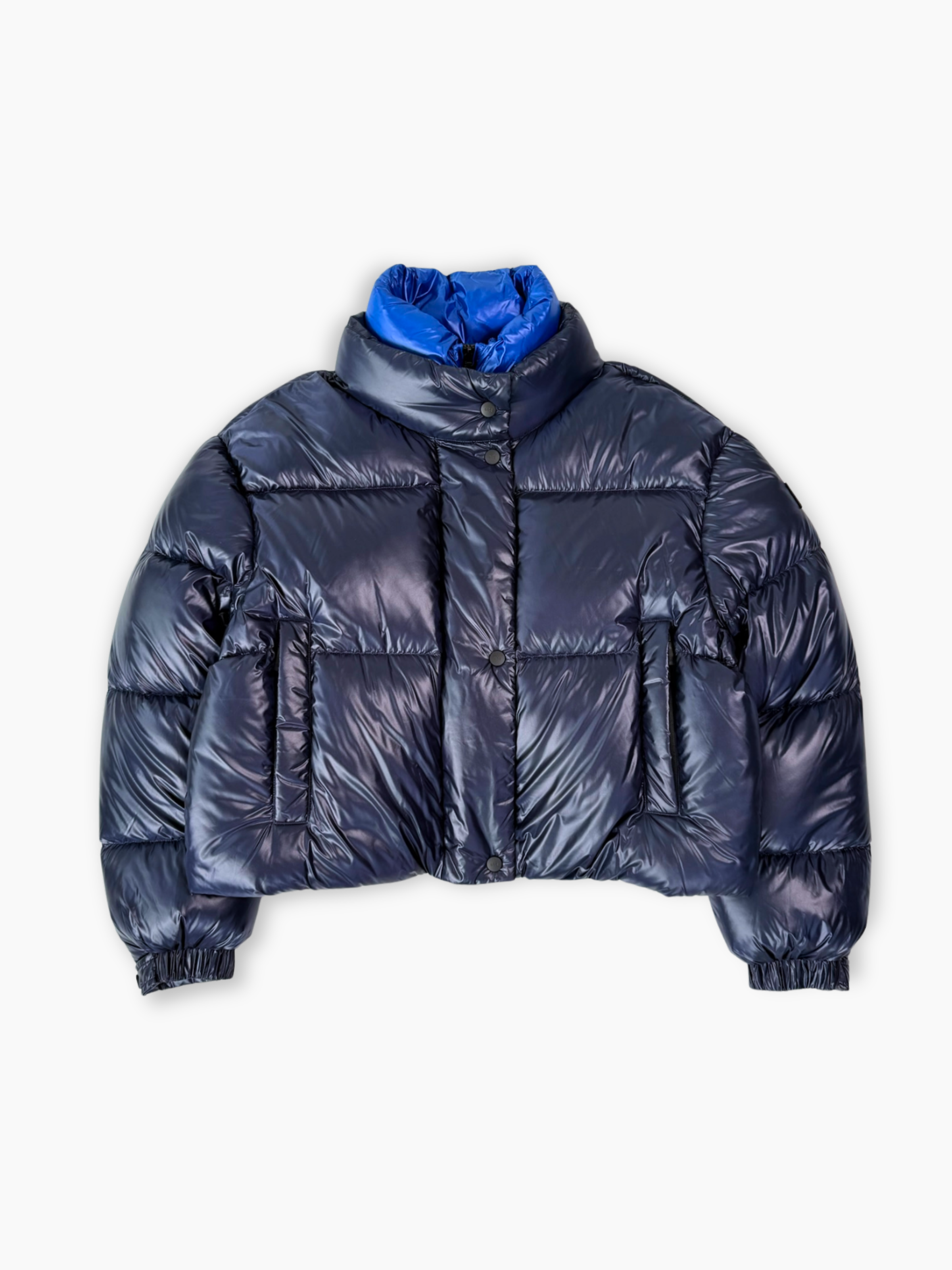ADD short down jacket in shiny blue technical fabric with a contrasting light blue interior. Featuring oversized horizontal quilting, a high collar, and a concealed zip and snap front closure. A contemporary and bold design, perfect for urban looks on cold days.