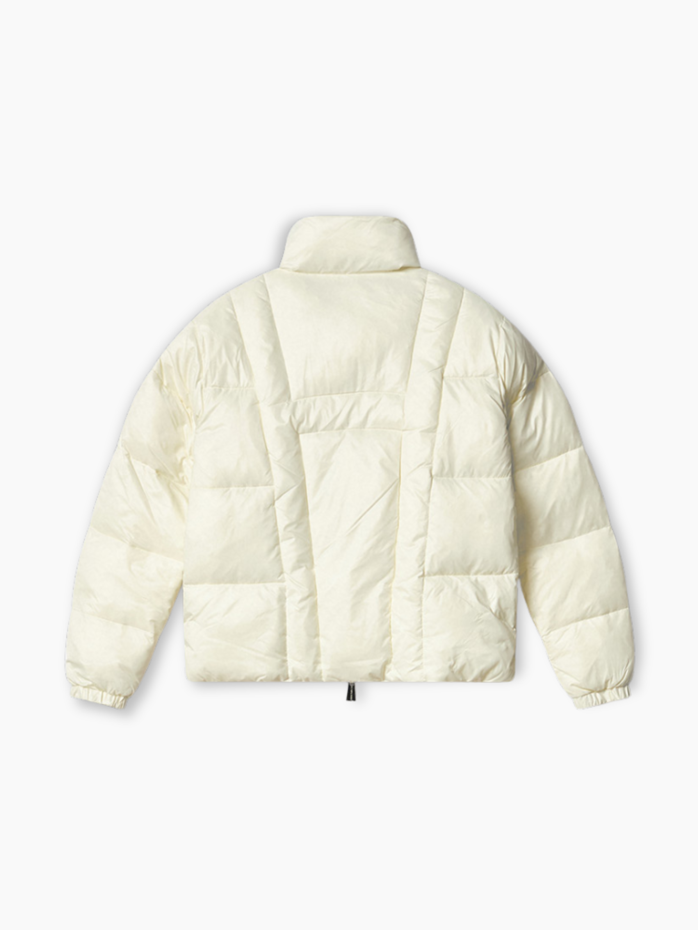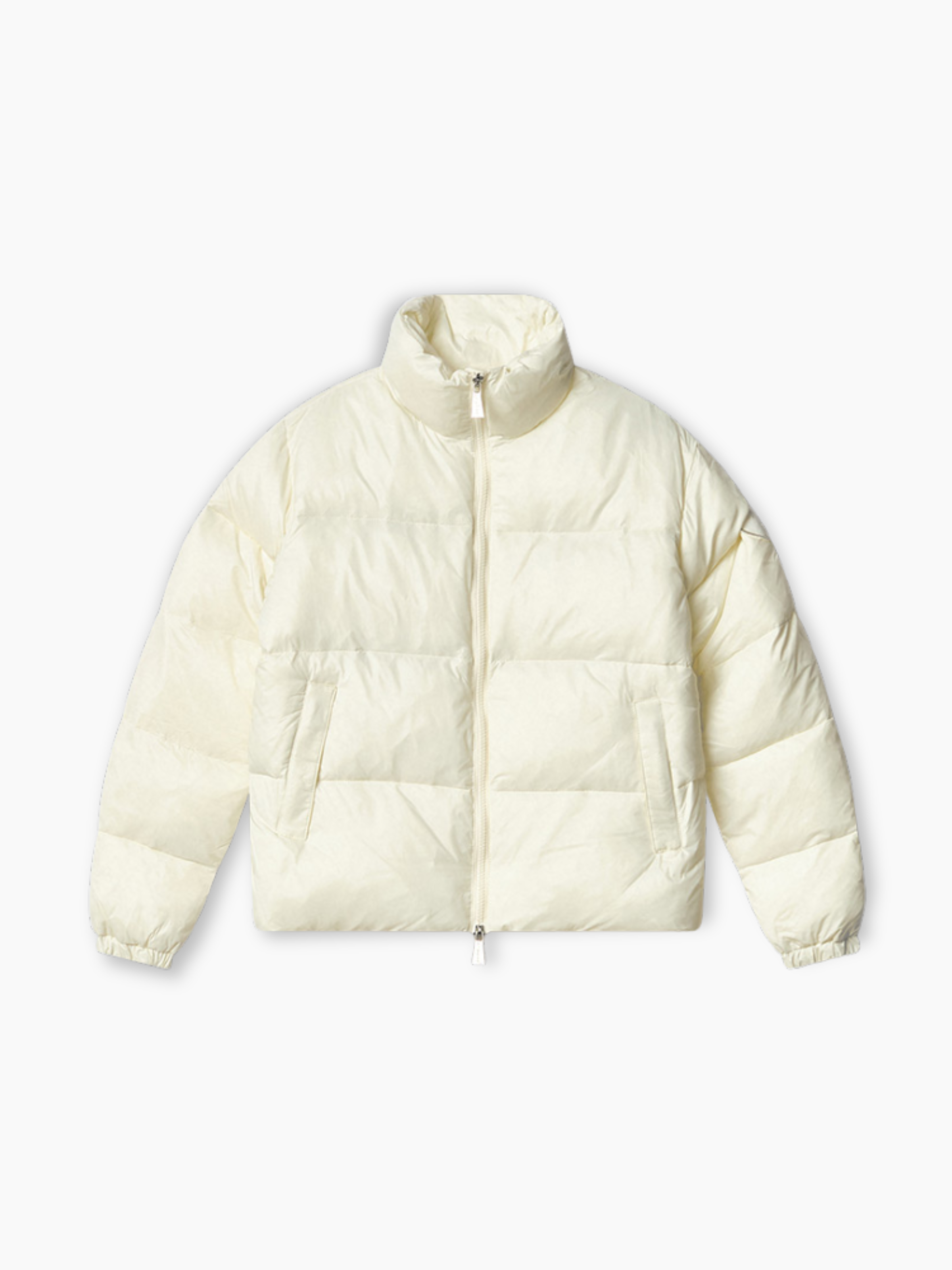 Short white down jacket in technical fabric, with a simple, modern design. Featuring warm, voluminous padding, a two-way zip closure, and convenient side pockets. An ideal piece for facing the winter in style and comfort.