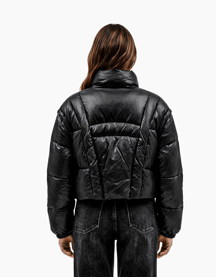 Hinnominate short down jacket in shiny black nylon, with warm and voluminous padding to face cold days in style. Featuring a modern cropped fit, a front zip and snap button closure, and side welt pockets. A trendy piece that combines comfort and contemporary design.