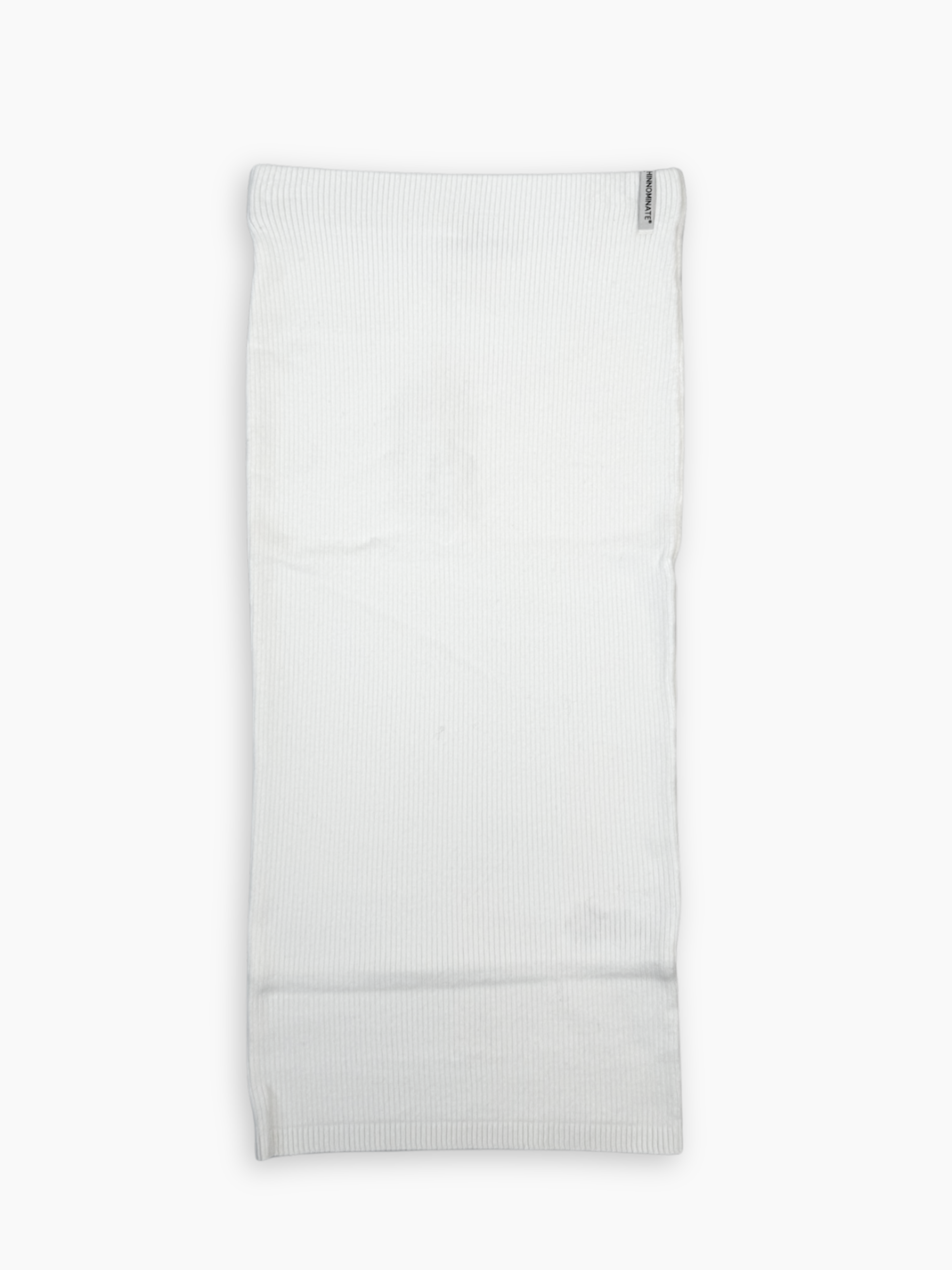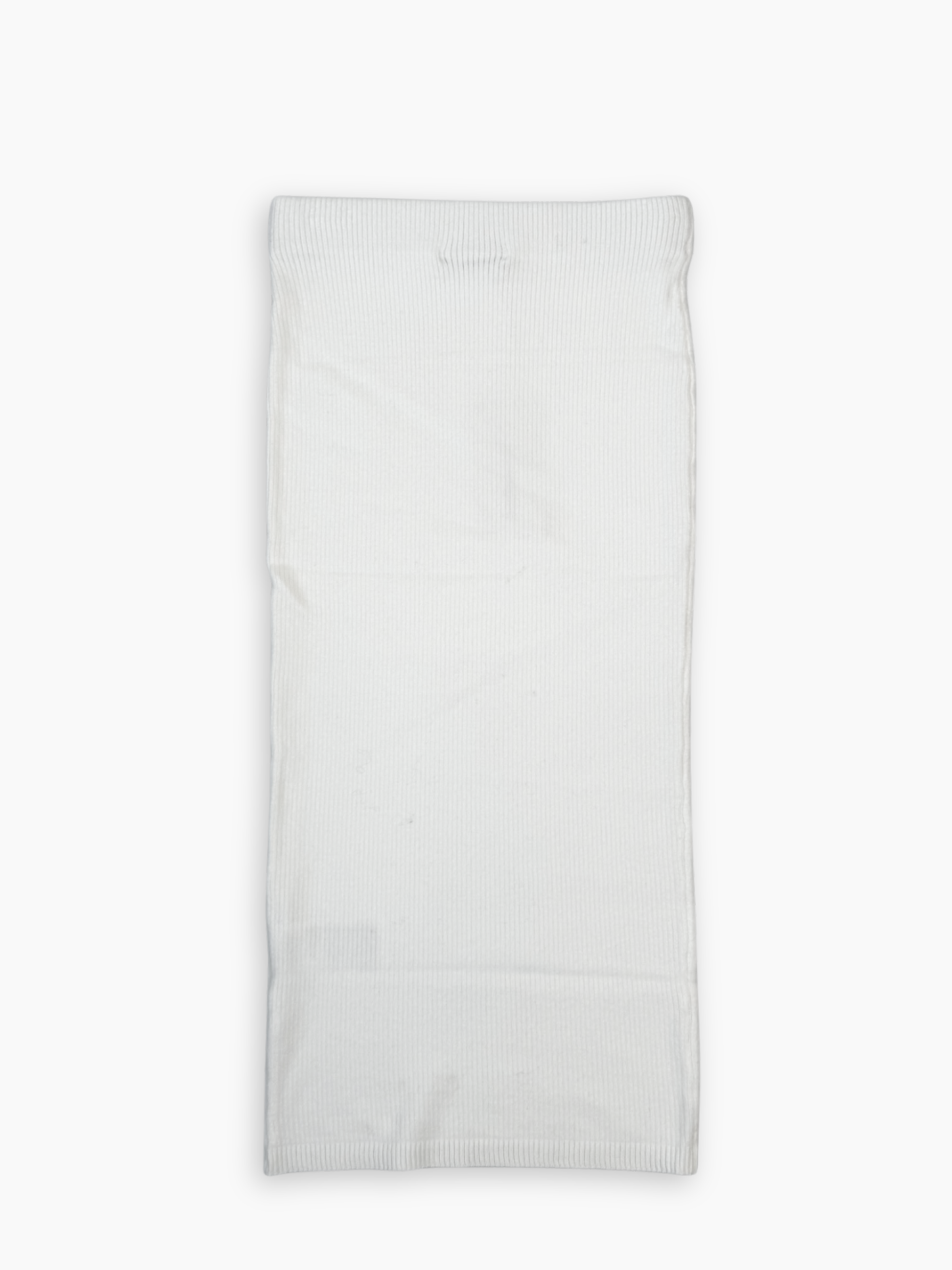 Long, off-white ribbed knit skirt with a fitted silhouette and elastic waist. The minimal design and soft texture make it perfect for elegant yet relaxed looks. Wear with a matching top or sweater for a sophisticated, contemporary all-knit look.