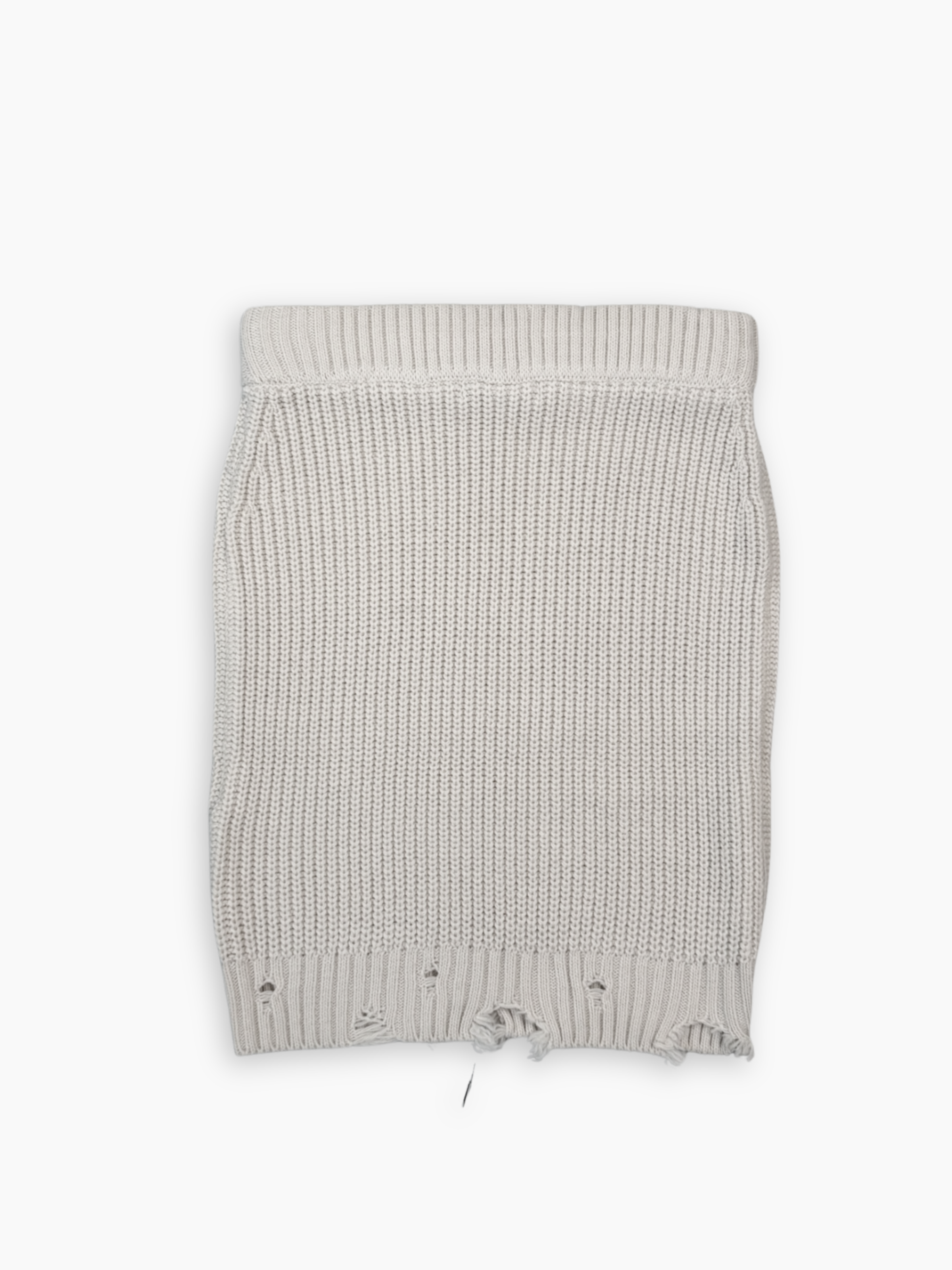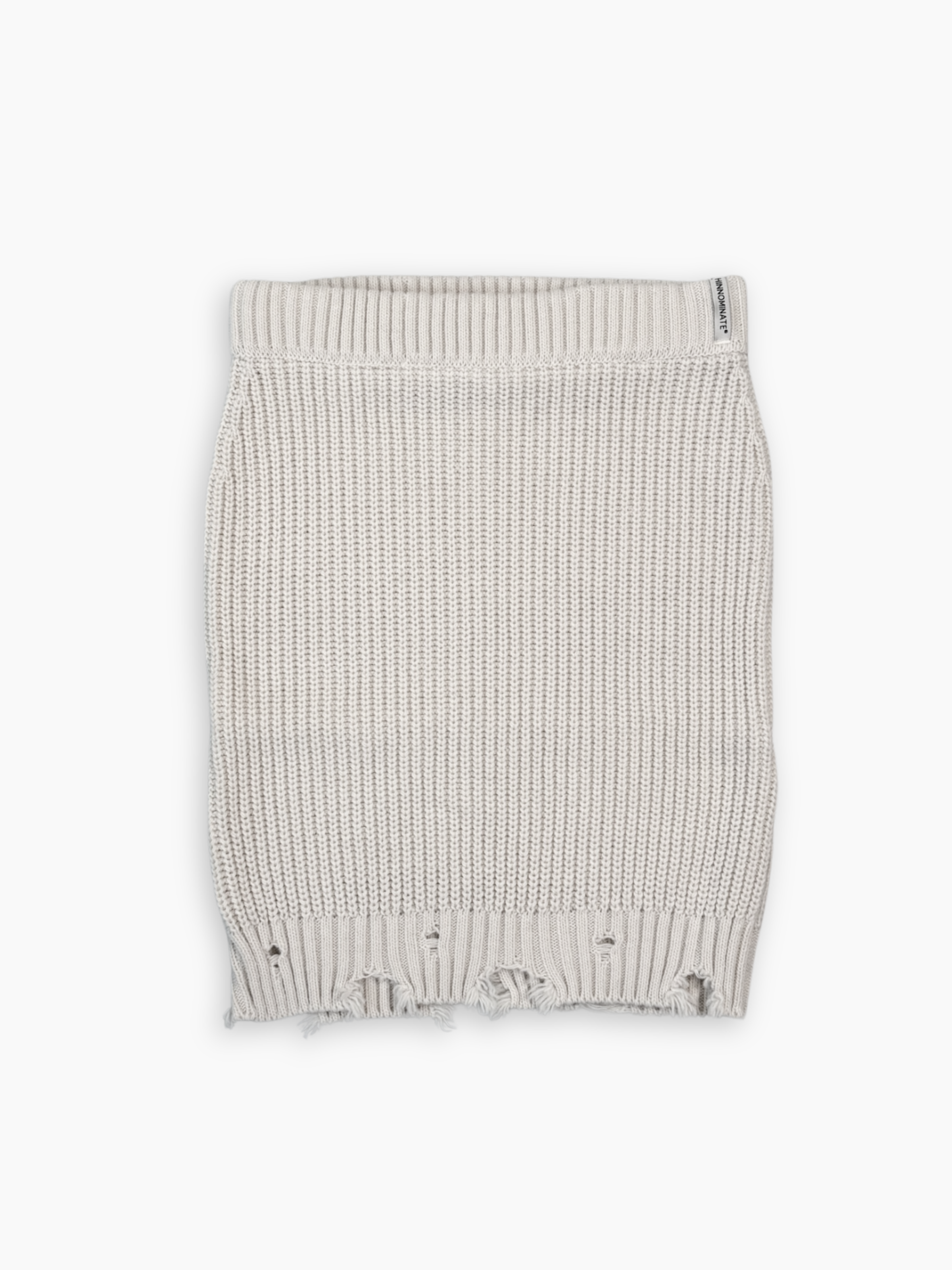 Off-white skirt in a chunky knit with a worn-in hem featuring subtle rips. The high-waisted design hugs the figure with a snug, contemporary fit. A casual yet sophisticated piece, perfect for urban or cozy-chic looks.