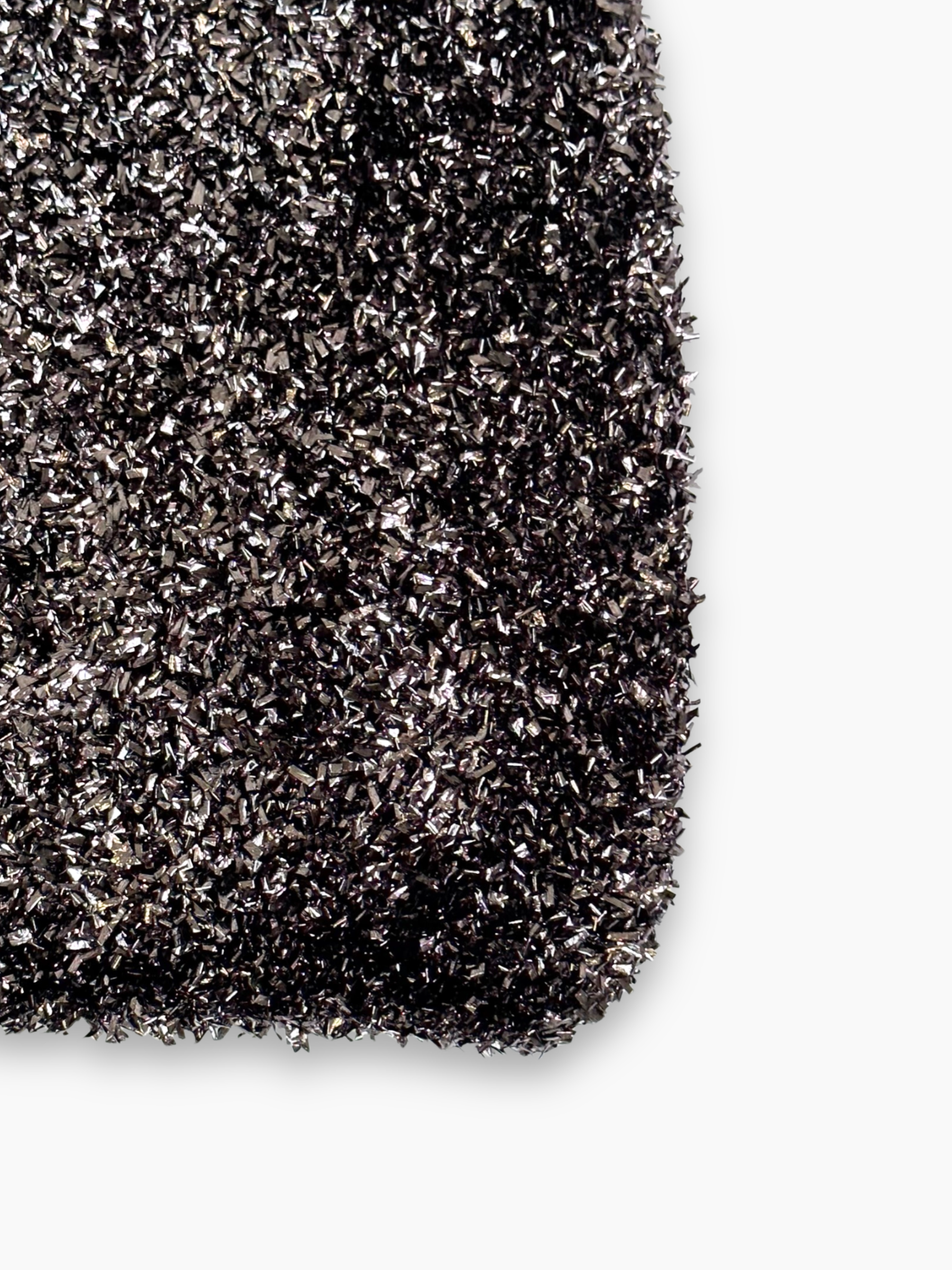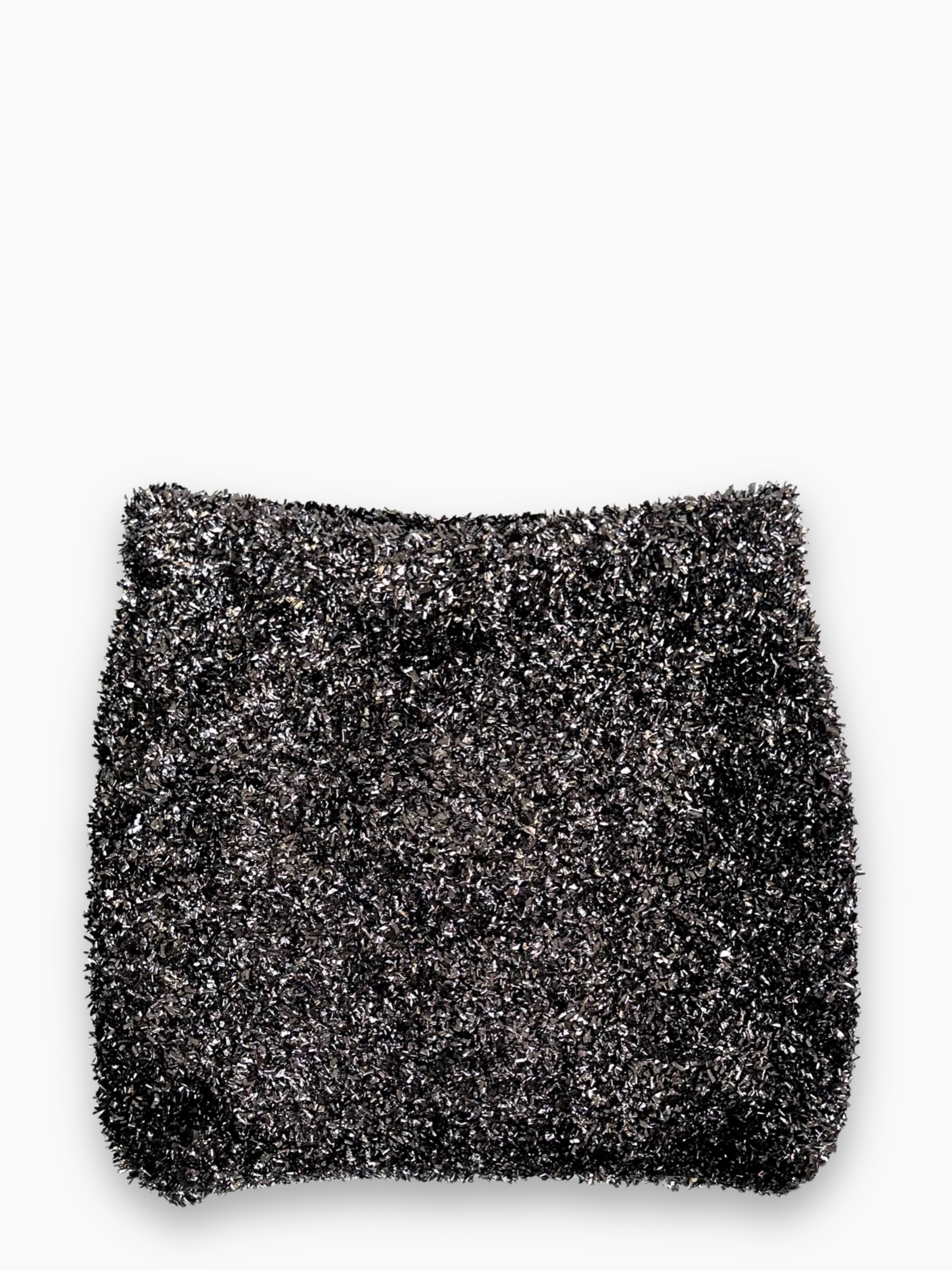 Gonna corta nera in filato effetto pelliccia con superficie tridimensionale e texture brillante. Morbida e avvolgente, dona un look deciso e ricercato, perfetto per outfit da sera o per aggiungere un tocco glam al quotidiano.