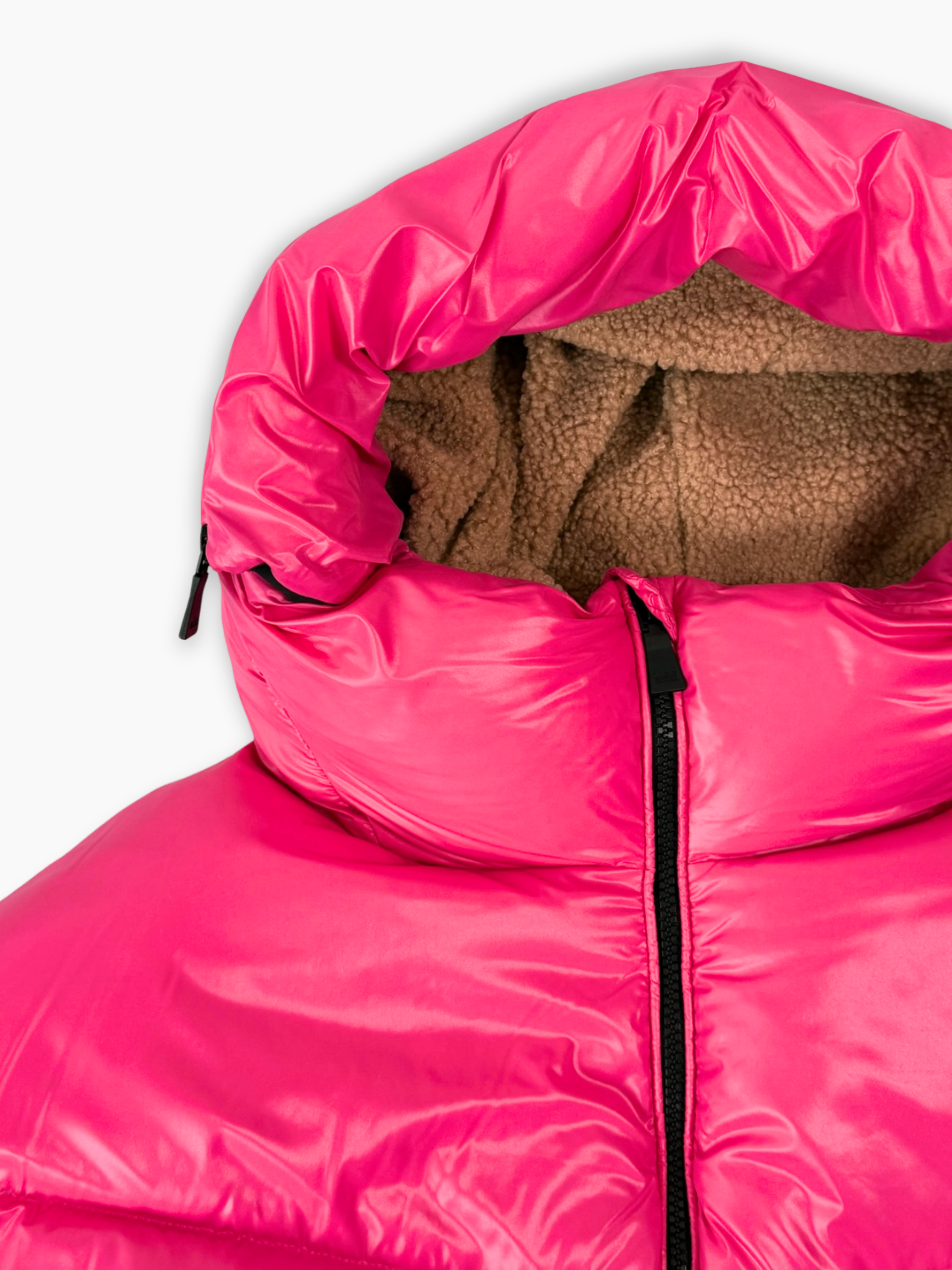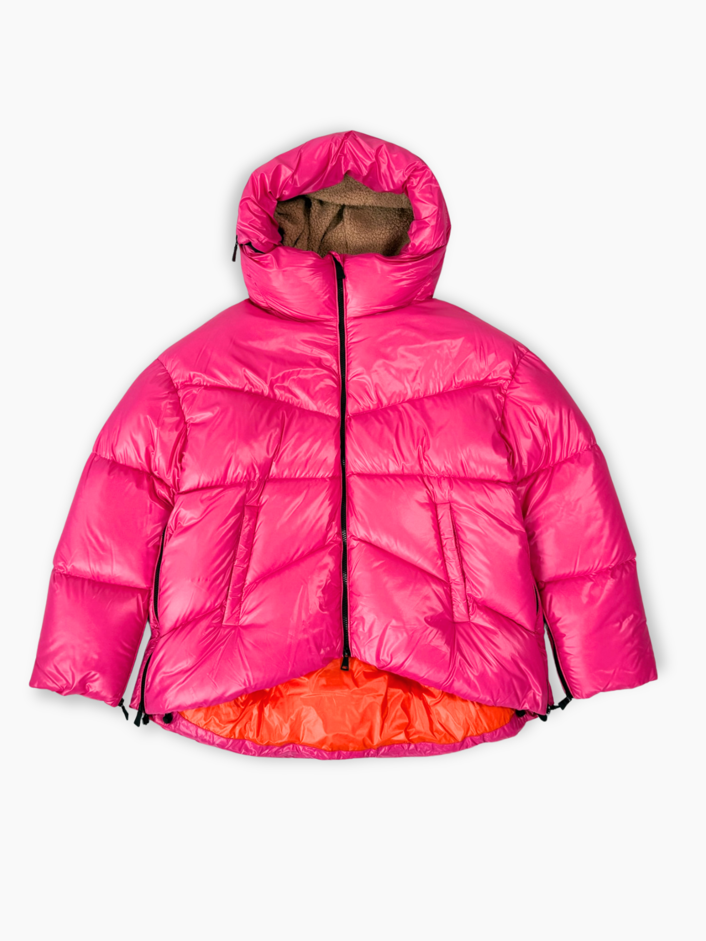 ADD's pink down jacket with a vibrant and contemporary look, designed for those who love to stand out even in winter. Crafted from a shiny, padded technical fabric, it features a built-in hood with a full-length front zip and diagonal side pockets with contrasting black zips. The orange interior detail adds a dynamic and original touch, while the slightly longer line at the back ensures greater protection.
