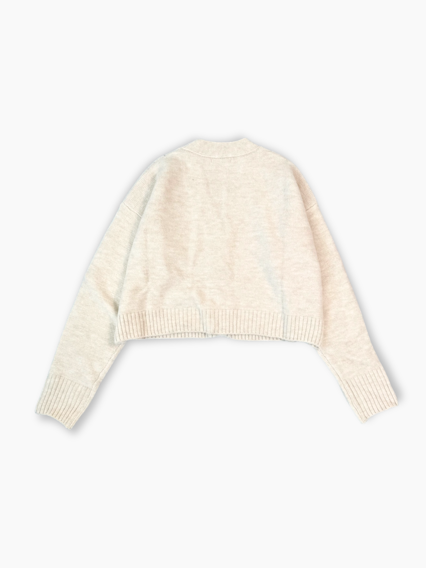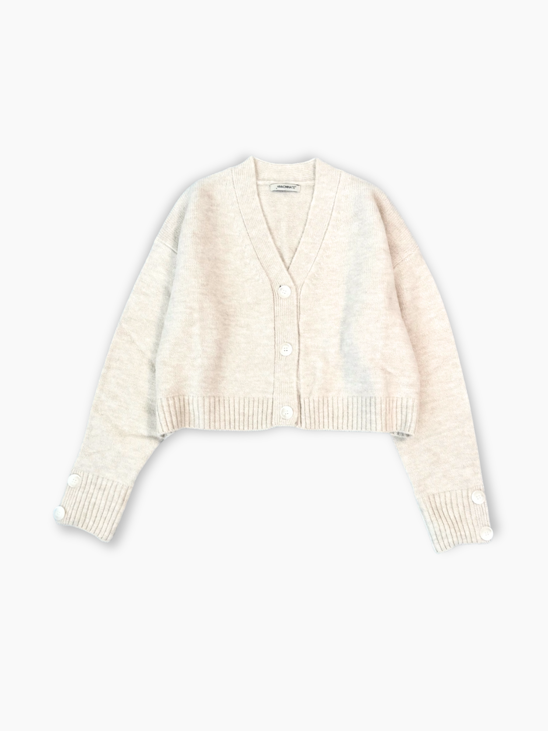 This off-white cropped knitted cardigan from Hinnominate is crafted from soft, comfortable fabric. It features a V-neck, front button closure, and long sleeves with decorative buttons on the cuffs. The cropped fit adds a modern, feminine touch, perfect for pairing with high-waisted trousers or skirts for a minimal, chic look.