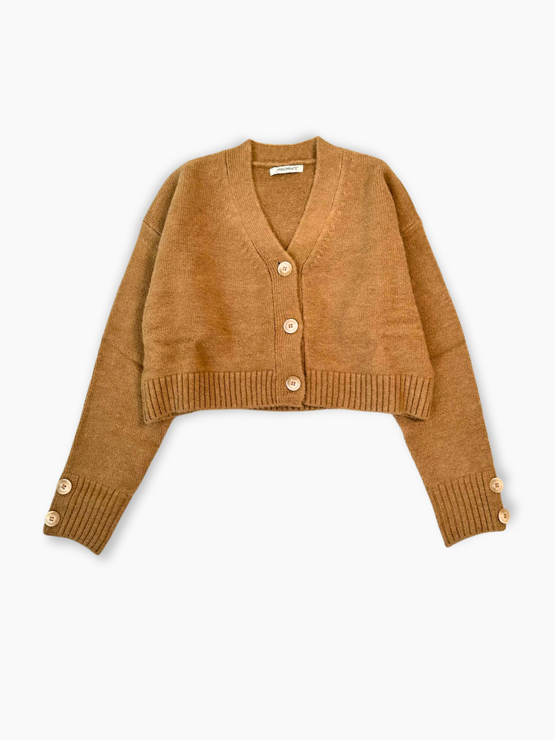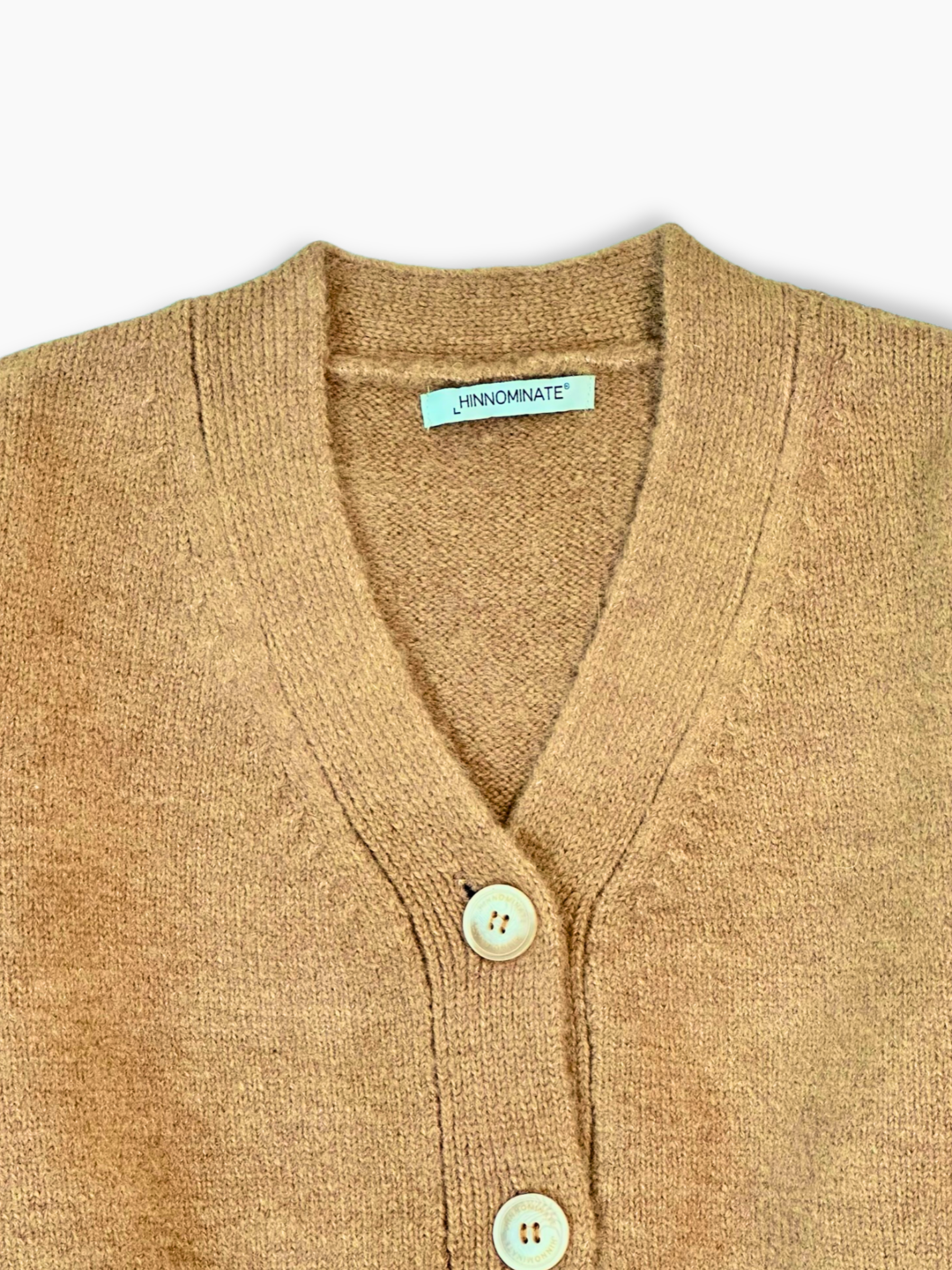 This hazelnut-colored knitted cardigan from Hinnominate is a short, warm cardigan. Crafted from soft fabric, it features a V-neck, a front button fastening, and long sleeves finished with decorative buttons at the cuffs. The cropped fit creates a modern and versatile look, perfect for pairing with high-waisted trousers or skirts for a casual-chic look.