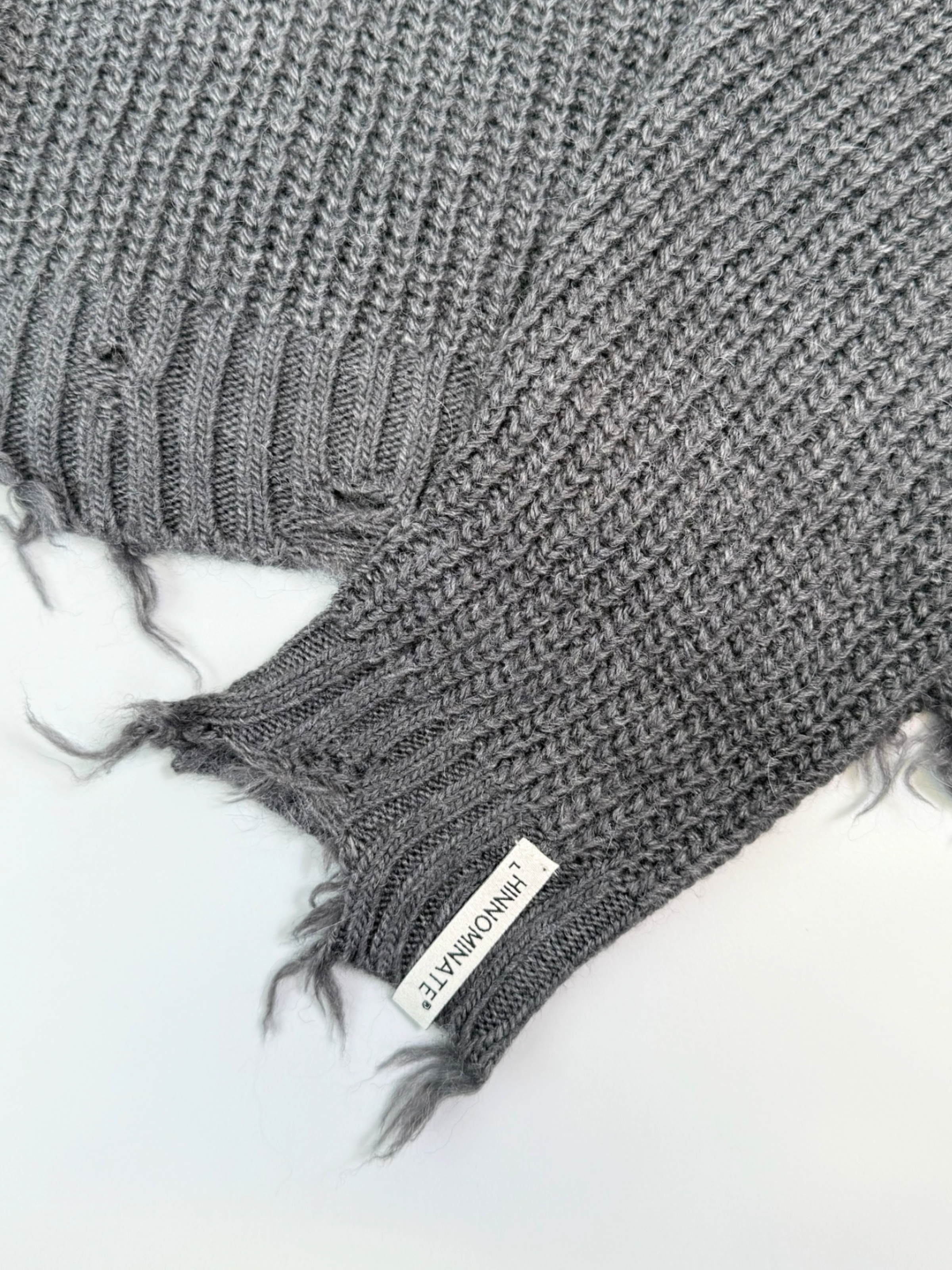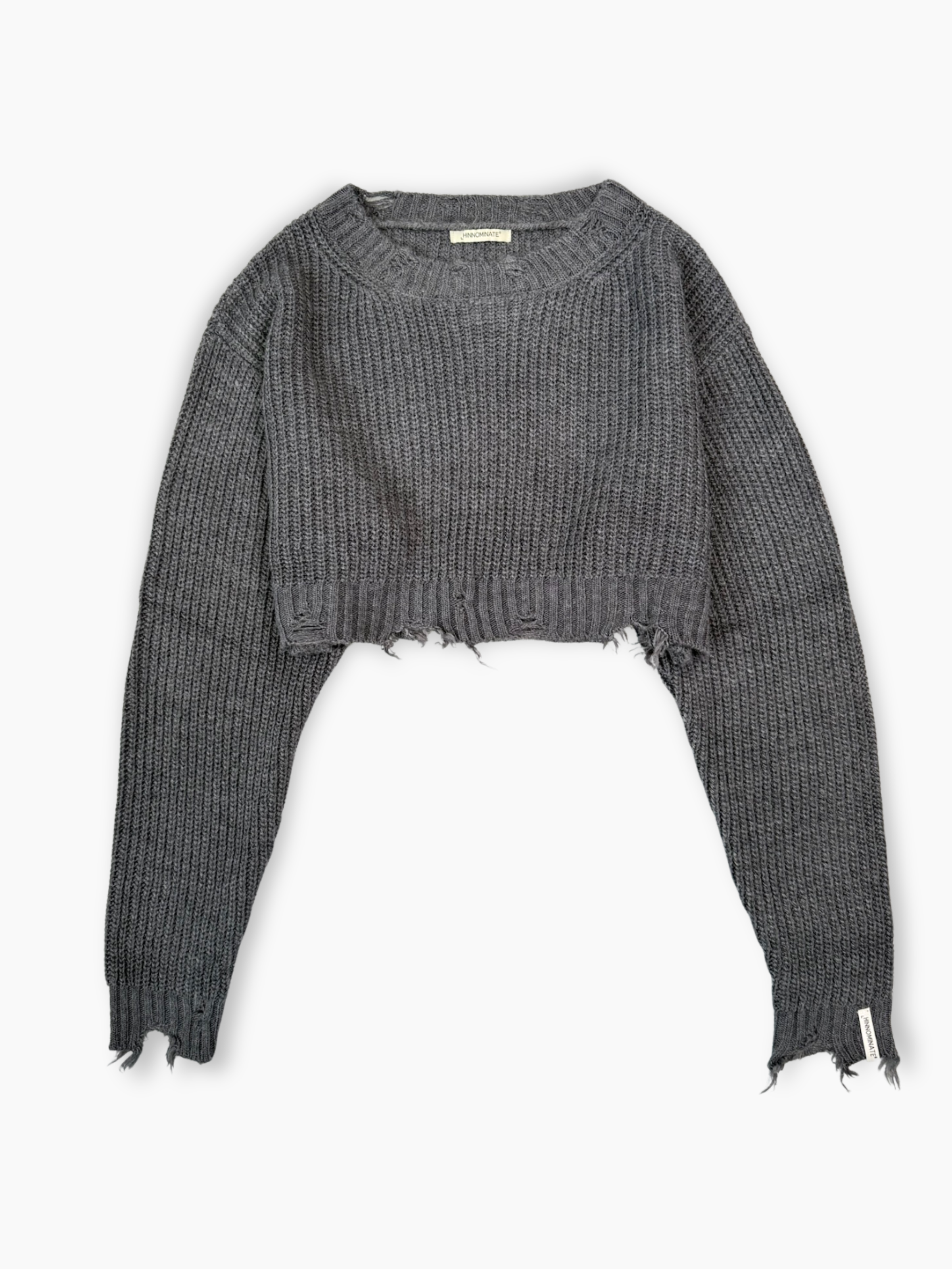 Hinnominate cropped sweater in soft yarn with a pearly finish and worn-in rips. The cropped design, slightly high neck, and front logo label make it perfect for casual outfits with an urban twist. Ideal for wearing with high-waisted jeans or oversized trousers.