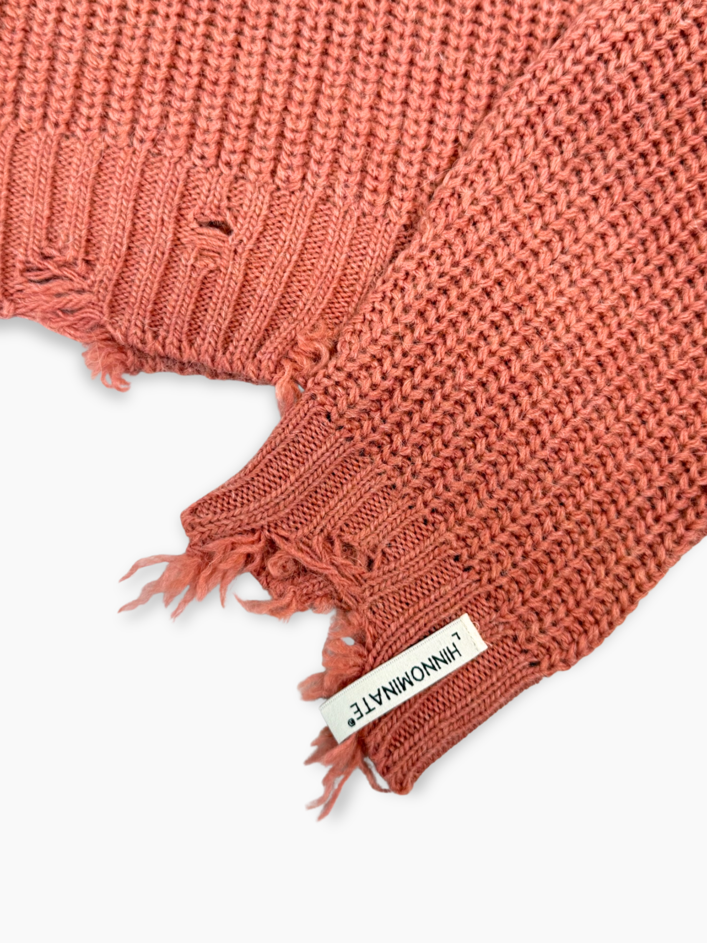 Hinnominate cropped sweater in pink pearl yarn, with distressed details and a high-waisted cut. The design is embellished with a logo label at the hem for a distinctive, street-inspired touch. A bold yet versatile piece, perfect for pairing with cargo pants or knit skirts.