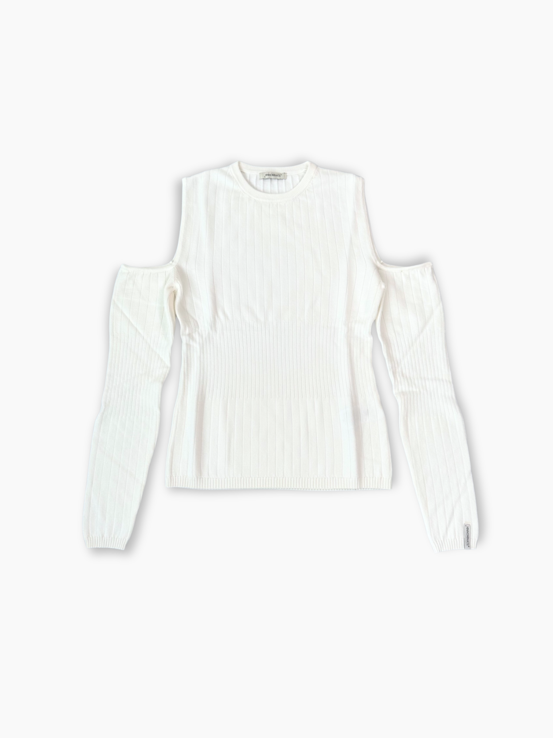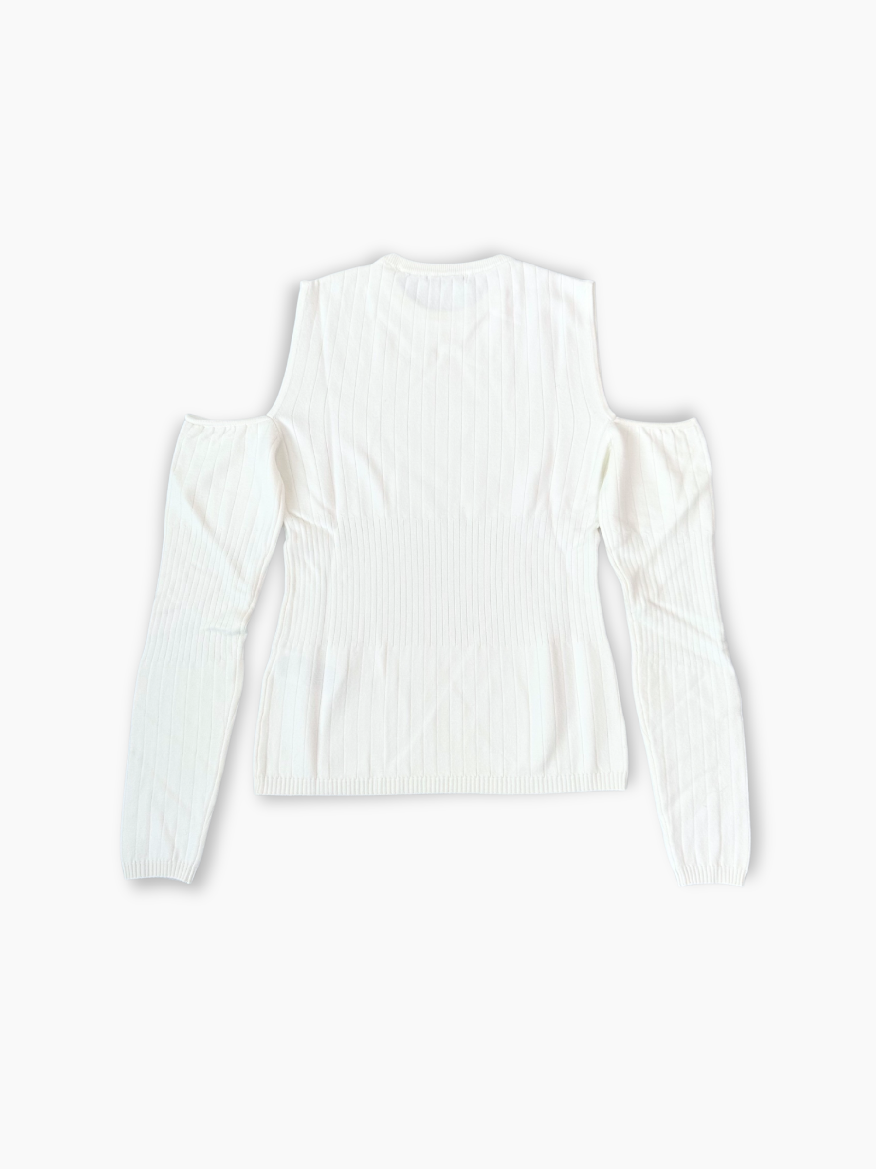 A sweater that plays with proportions and details for a simple yet striking look. The cut-out design adds character to this white top by Hinnominate, crafted from soft, stretchy ribbed fabric. Perfect for chic everyday outfits and seasonal layering.