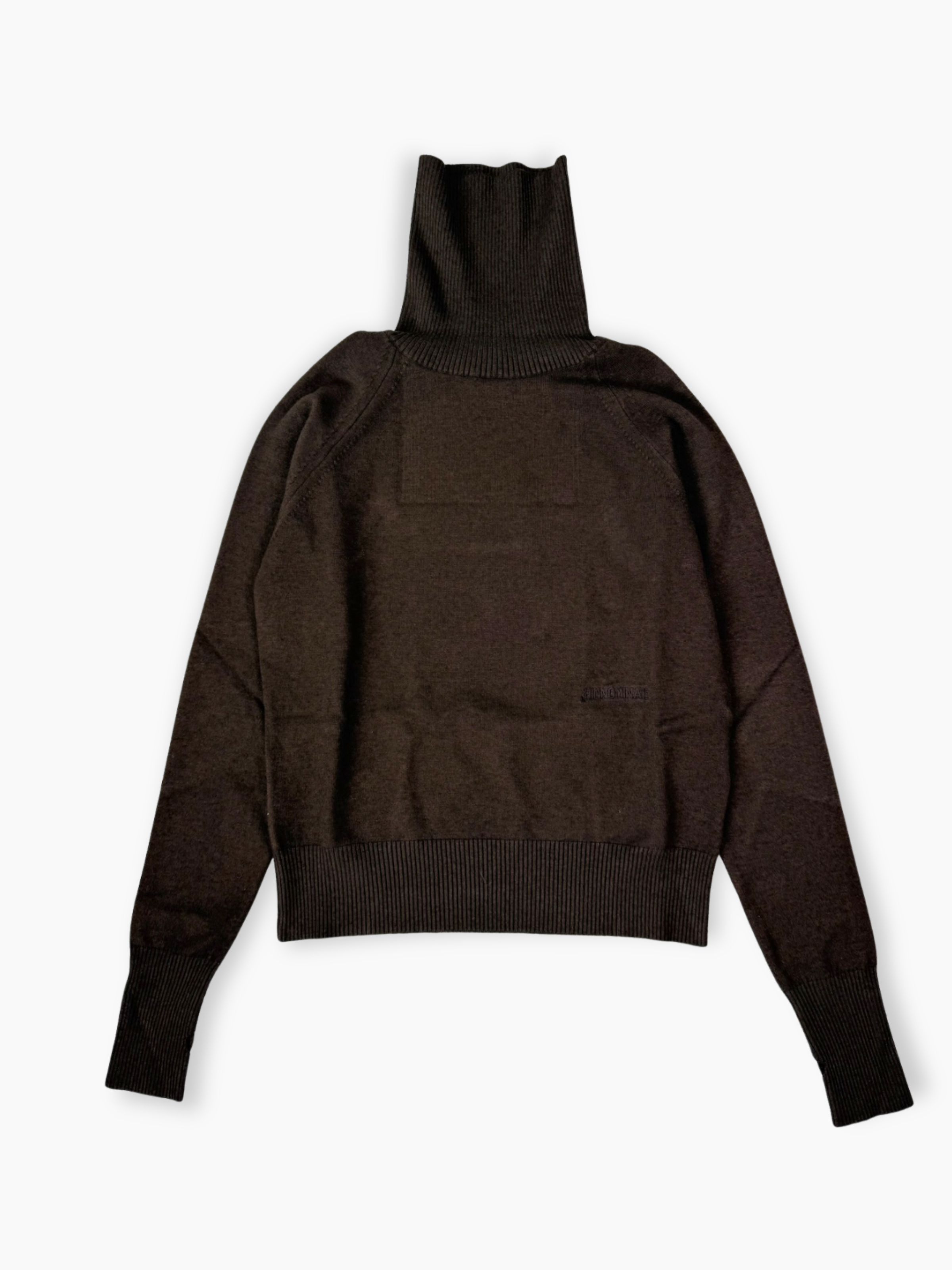 Brown turtleneck sweater from Hinnominate, crafted from a soft blend of viscose, polyester, and polyamide. It features a ribbed turtleneck, ribbed cuffs and hem, and subtle tone-on-tone embroidery on the front. A refined and versatile piece, ideal for completing casual and contemporary looks with a sophisticated touch.