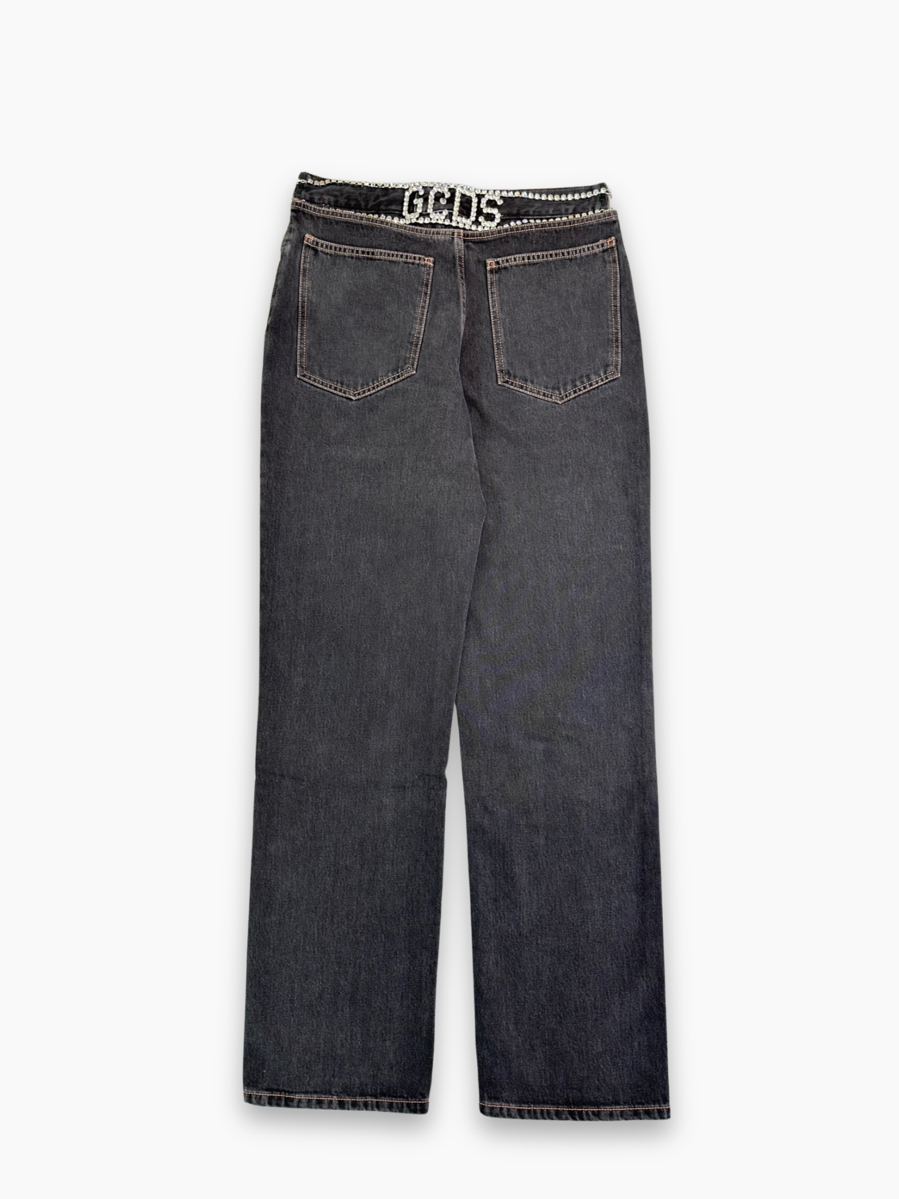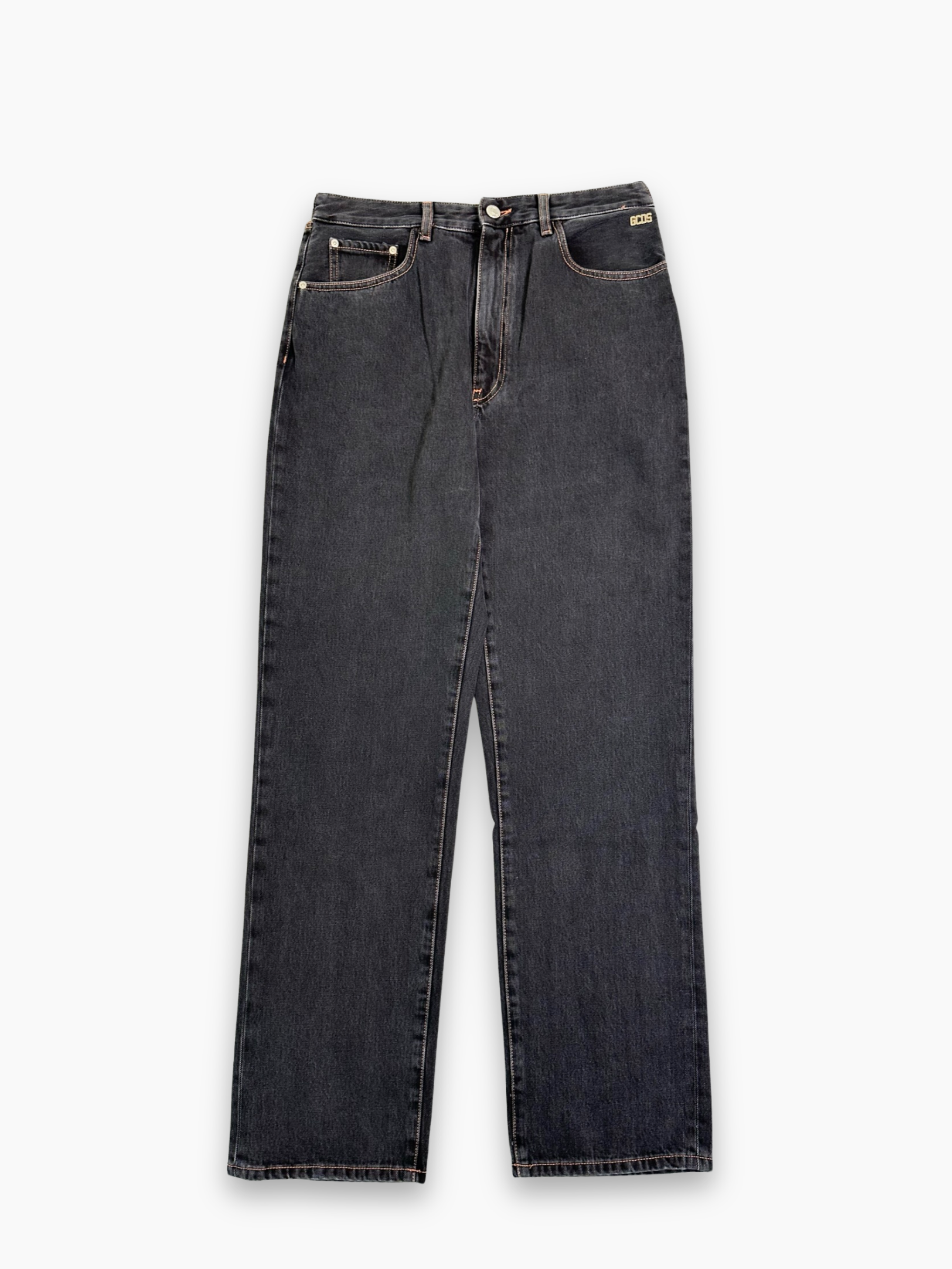 Jeans neri a gamba larga con struttura dritta e fit morbido. Il denim presenta una finitura leggermente washed che dona profondità al colore, mentre la vita regular con bottone assicura una vestibilità pratica e confortevole. Sul retro, la cintura gioiello con logo GCDS aggiunge un dettaglio luminoso e distintivo. Perfetti per look casual con un twist contemporaneo.