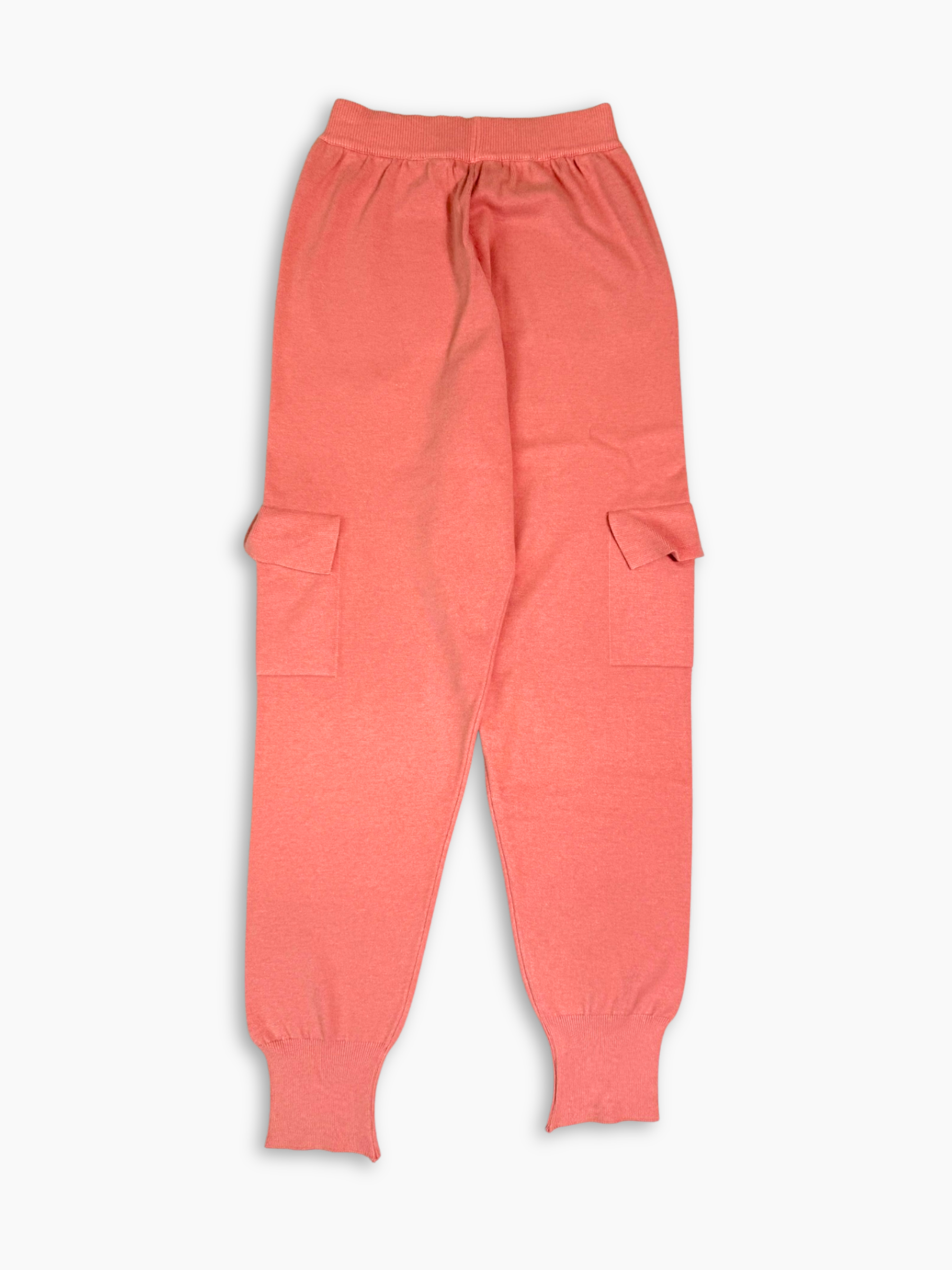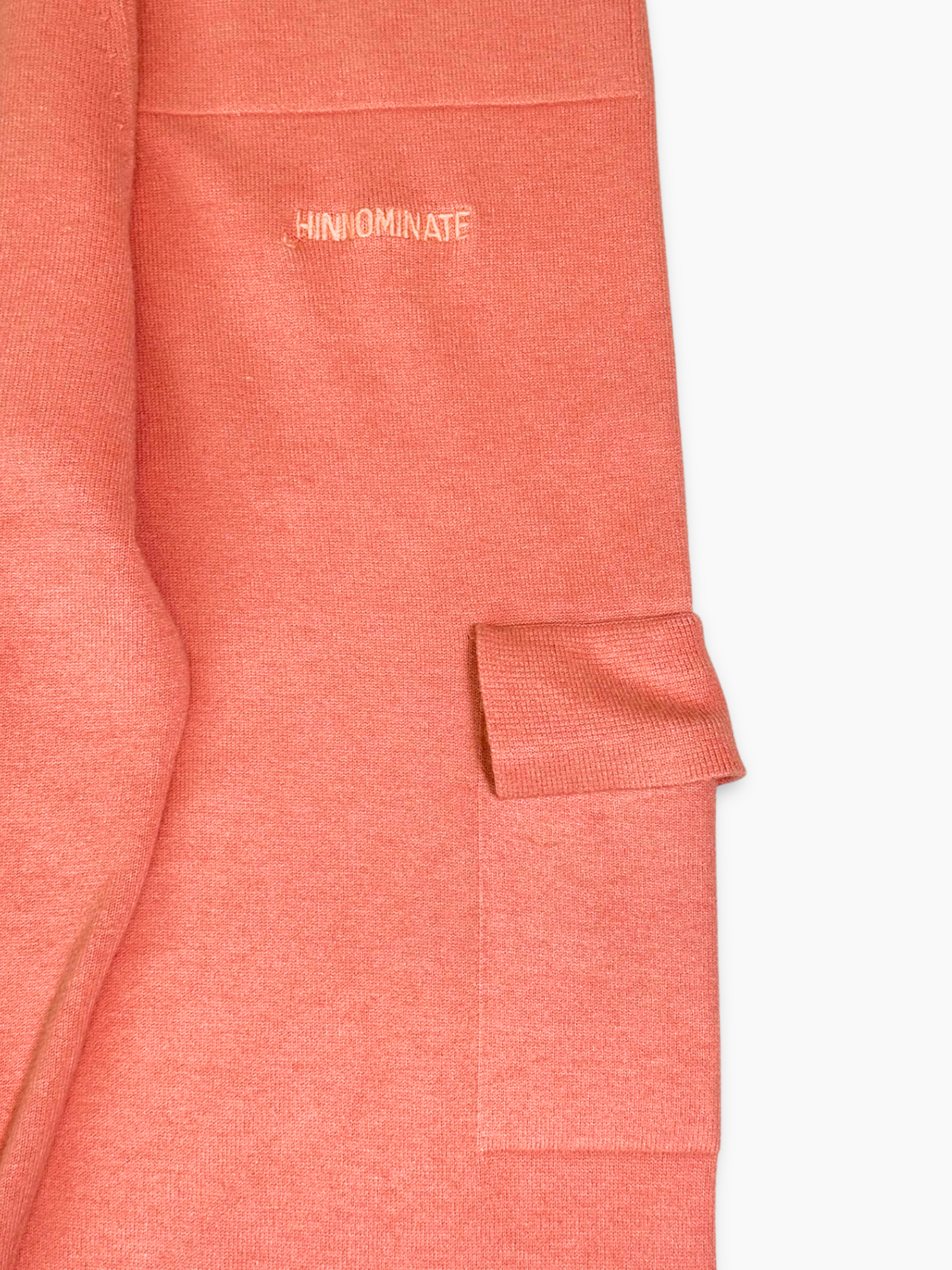 Hinnominate trousers in soft old rose knit. The cargo design with side pockets and an elasticated waistband combines comfort and contemporary style, perfect for relaxed yet refined looks. Ideal for pairing with sweatshirts or turtlenecks for a cozy and modern look.