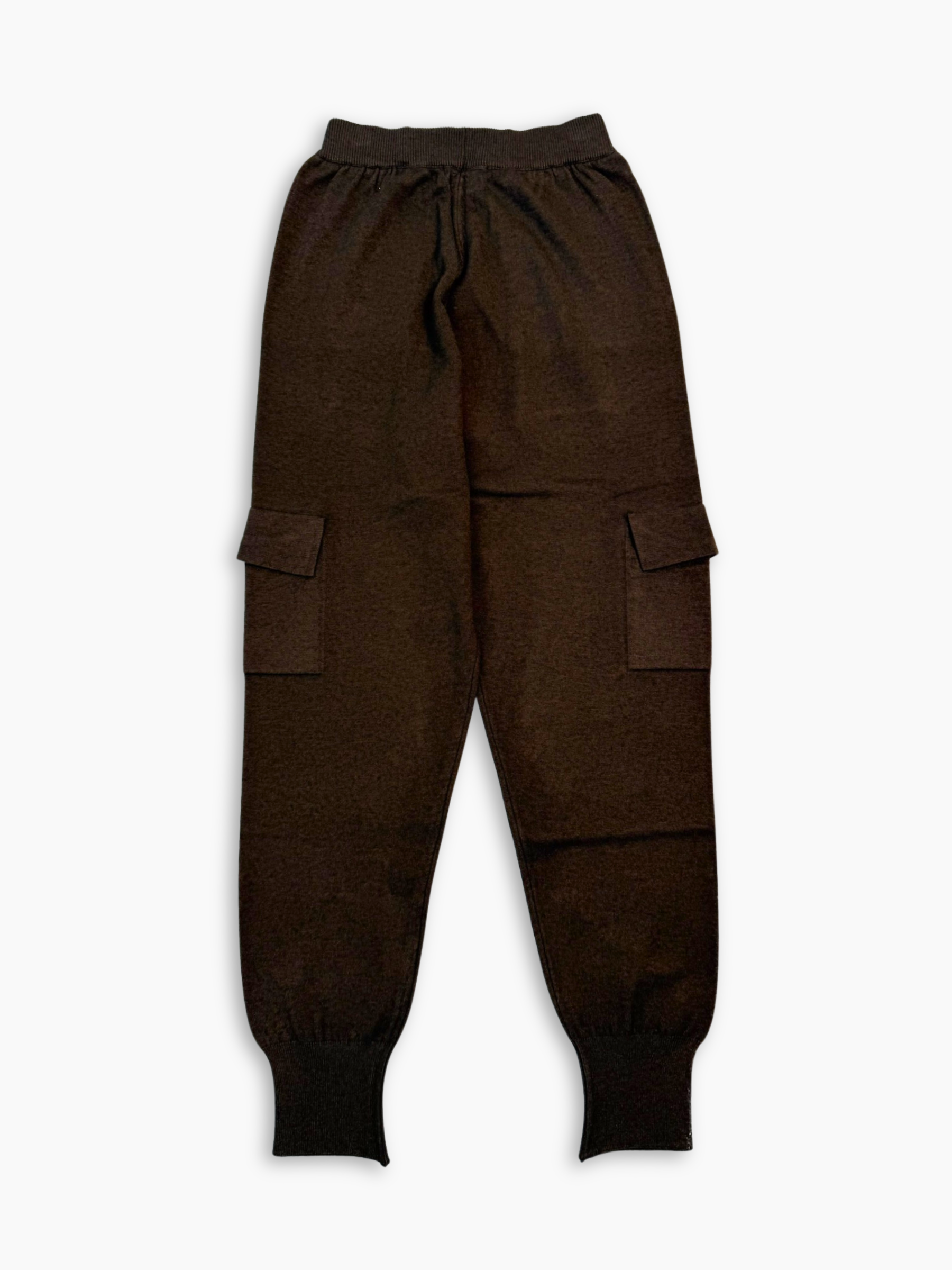 Hinnominate cargo pants crafted from soft dark brown knit. Featuring a relaxed and comfortable fit, they feature a ribbed elastic waistband and side patch pockets for a casual yet refined look. Perfect with matching sweaters for a cozy-chic look.