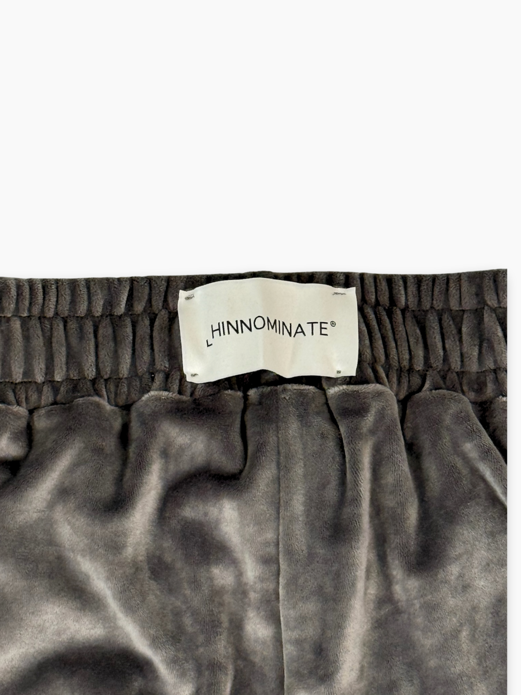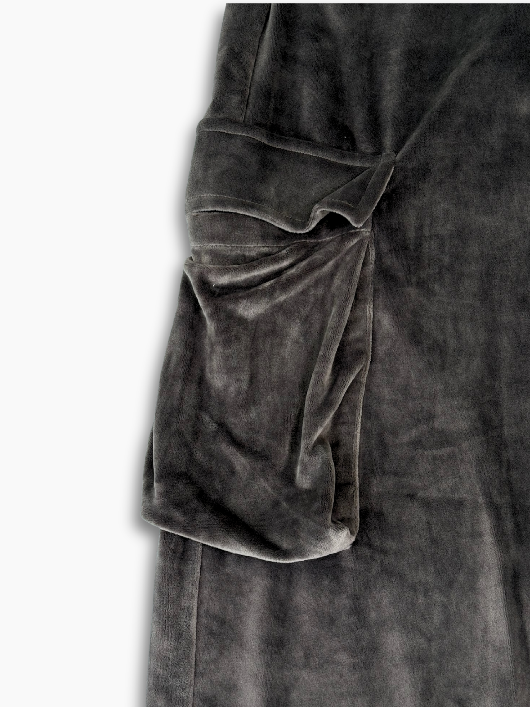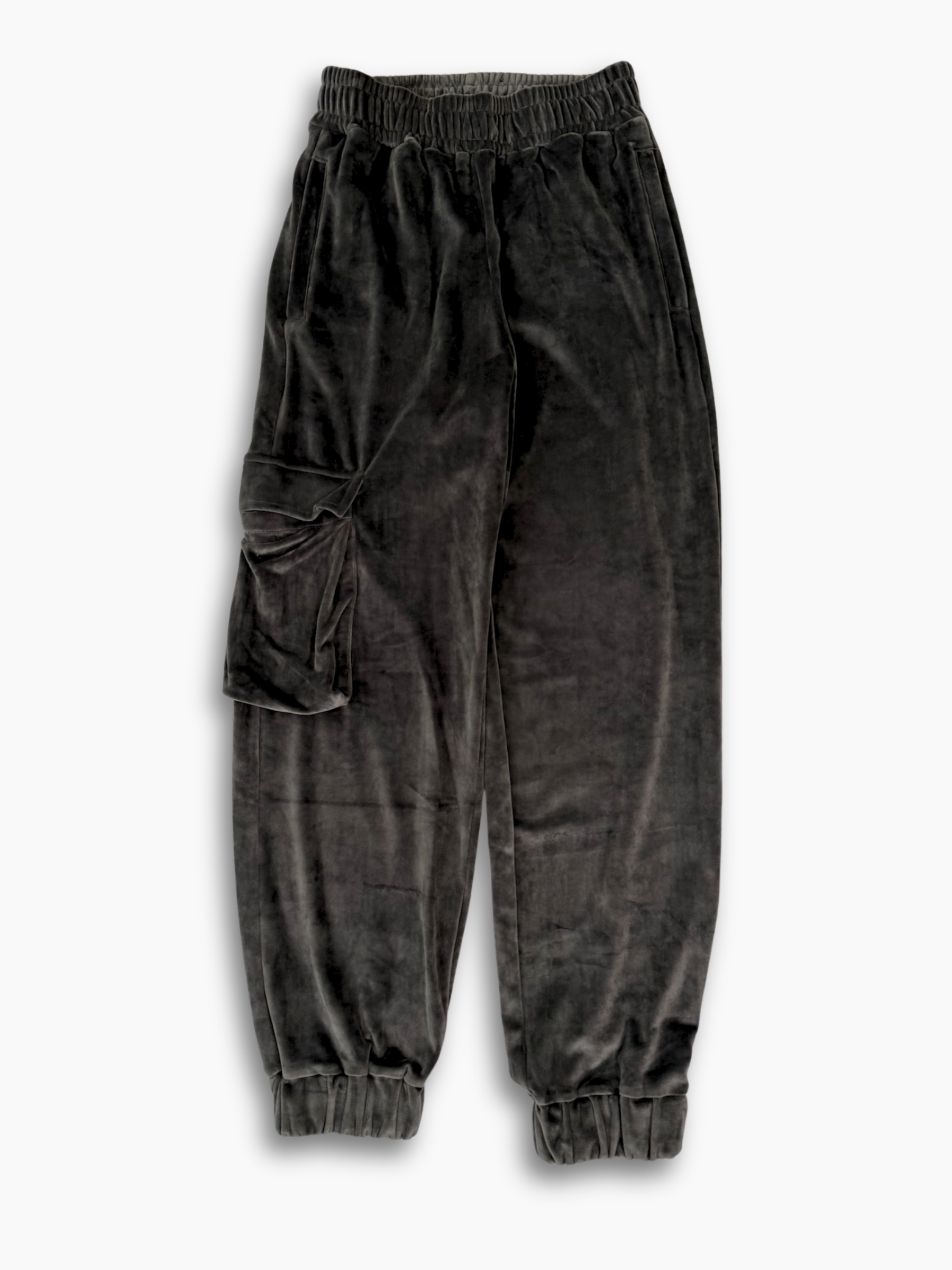 Women's trousers crafted from soft gray chenille, ensuring comfort and an elegant texture. The style features an elasticated waistband, elasticated cuffs, and large side pockets for a contemporary and relaxed look. Ideal for casual outfits or for a cozy and sophisticated look.