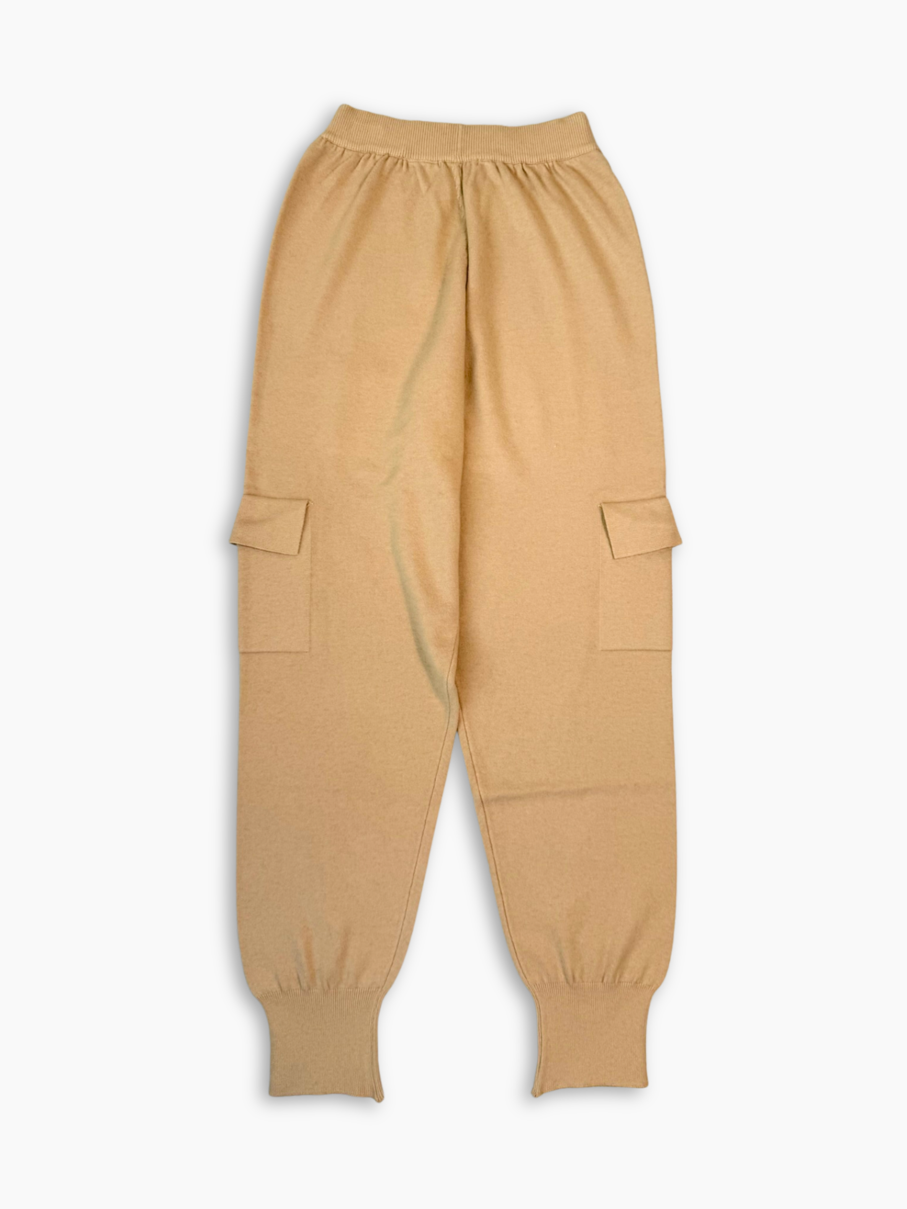 Sage green knitted cargo pants with a relaxed, contemporary fit. Featuring an elastic waistband and side patch pockets, they offer the perfect balance of comfort and style. Tone-on-tone embroidery adds a subtle yet distinctive detail. Perfect for creating refined casual looks.