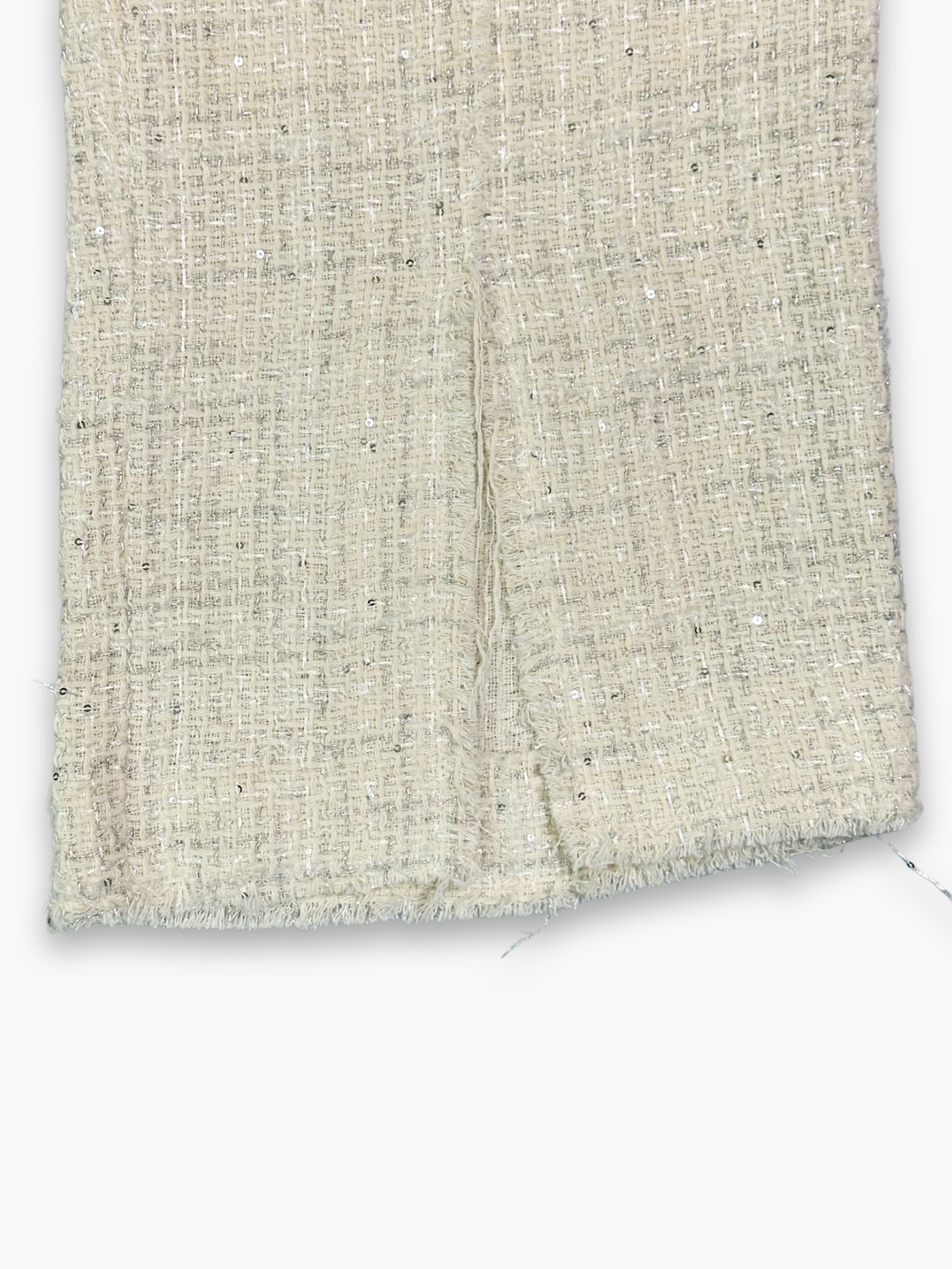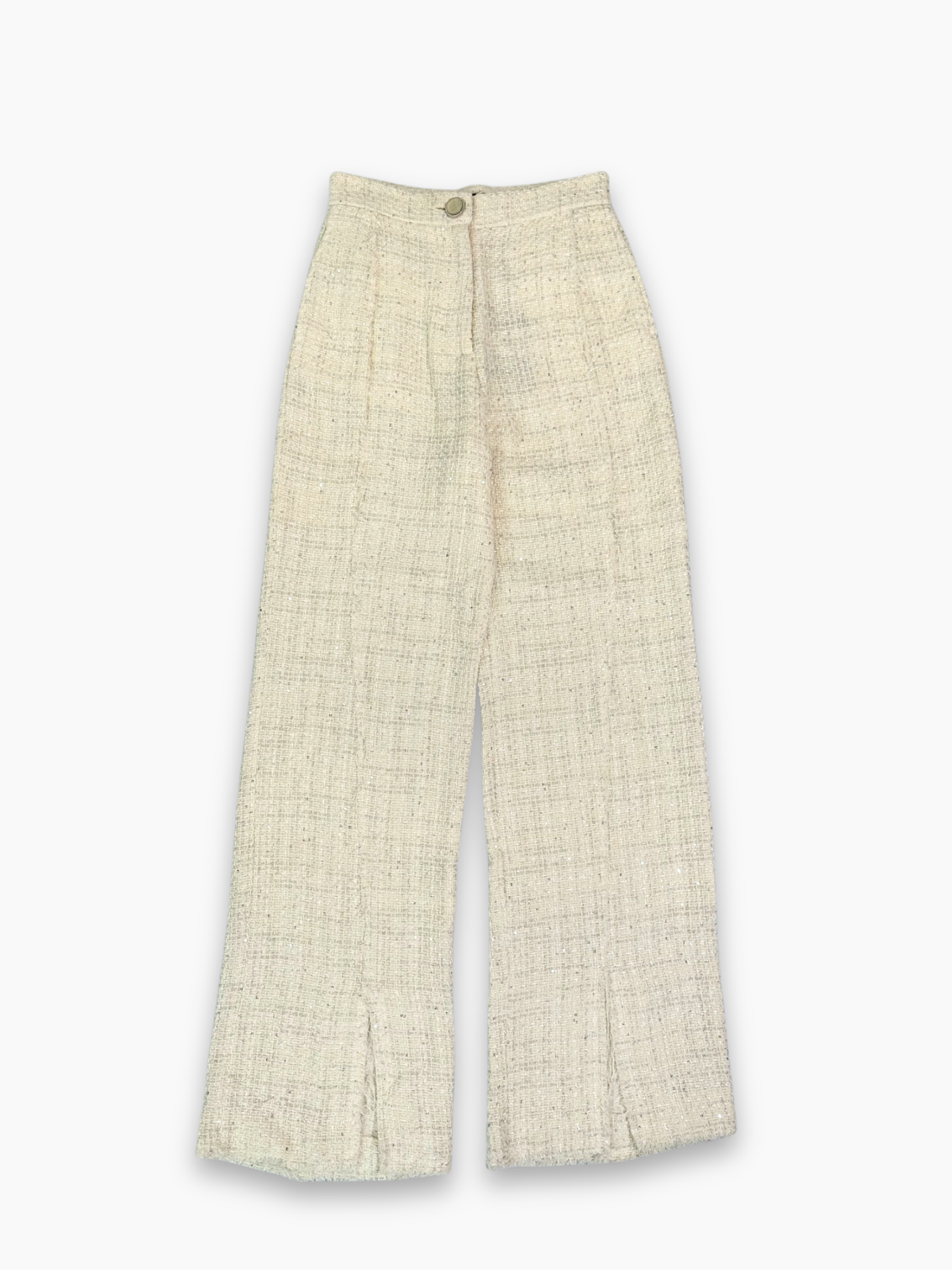 Pantaloni in tweed bianco dalla texture strutturata e dall’estetica ricercata, perfetti per costruire look eleganti e contemporanei. Il modello presenta vita media, gamba dritta e dettagli sartoriali tipici di GCDS, offrendo un equilibrio ideale fra carattere e versatilità. Ideali per outfit raffinati ma con personalità.