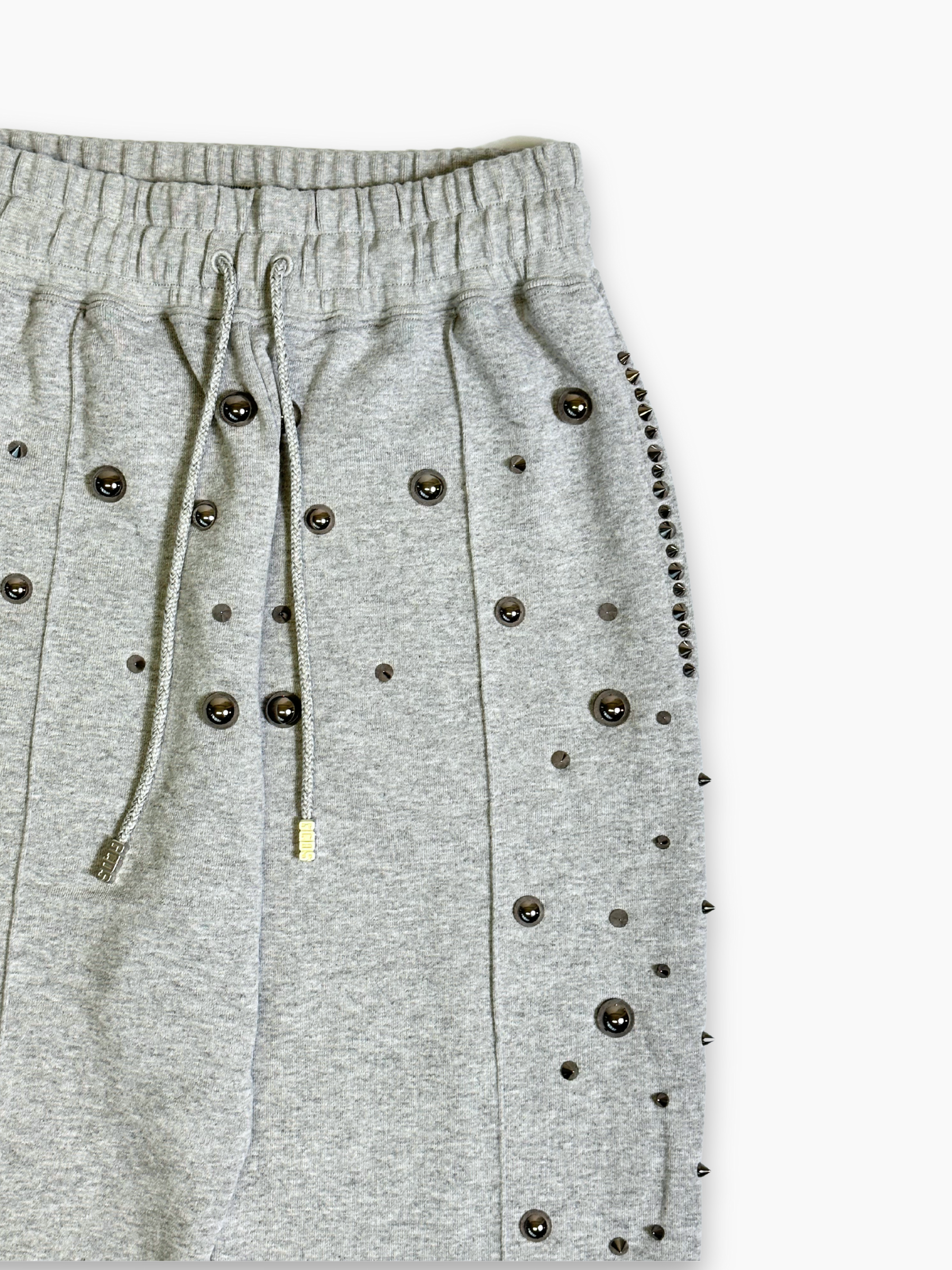 Pantaloni della tuta azzurri dal design distintivo, caratterizzati da una fila di borchie metalliche applicate lungo la gamba che aggiunge un tocco grintoso e contemporaneo. Realizzati in cotone morbido e confortevole, presentano una vestibilità relaxed perfetta per look streetwear quotidiani o outfit più fashion-forward. Un capo iconico che unisce comfort e carattere.