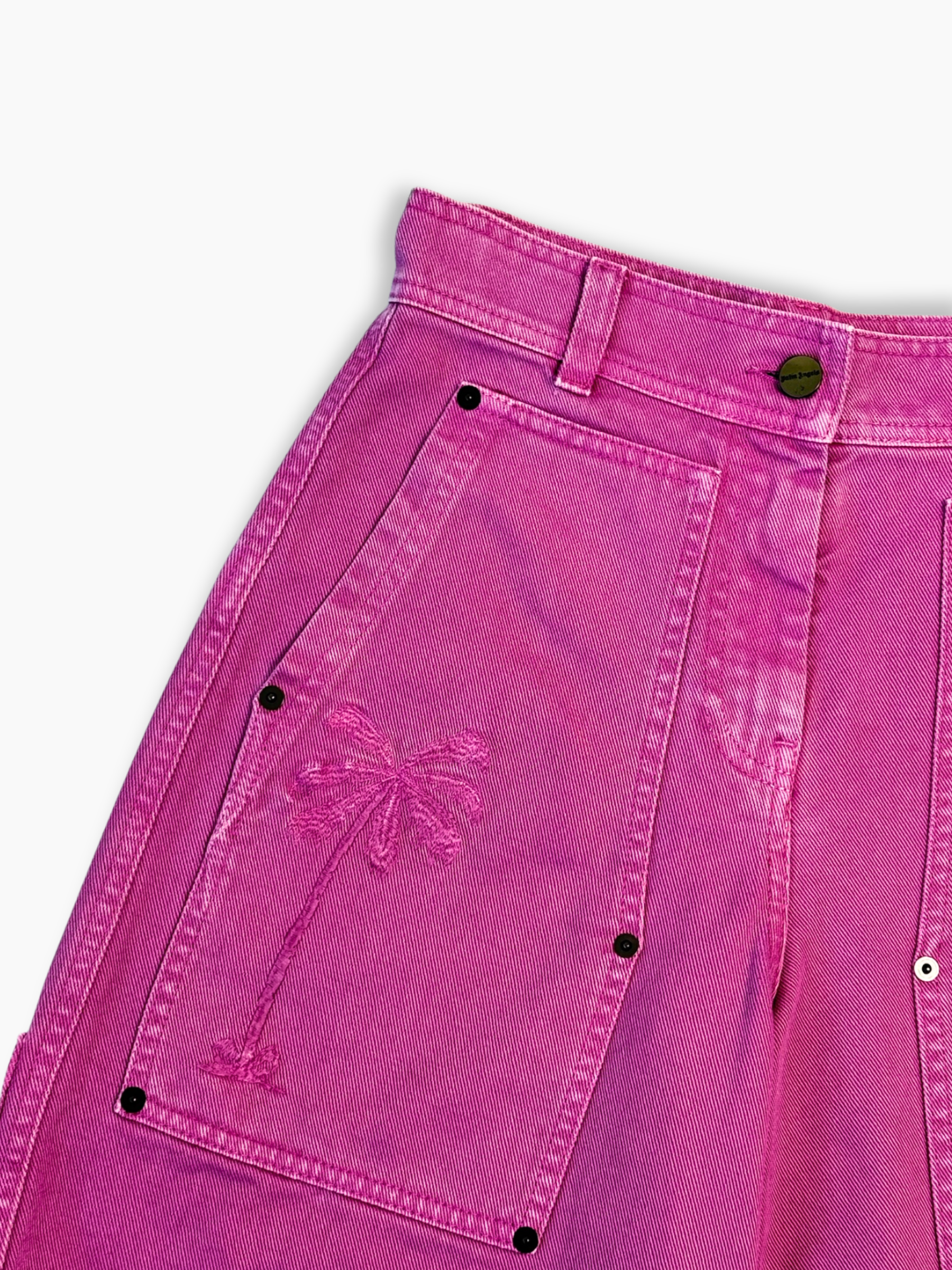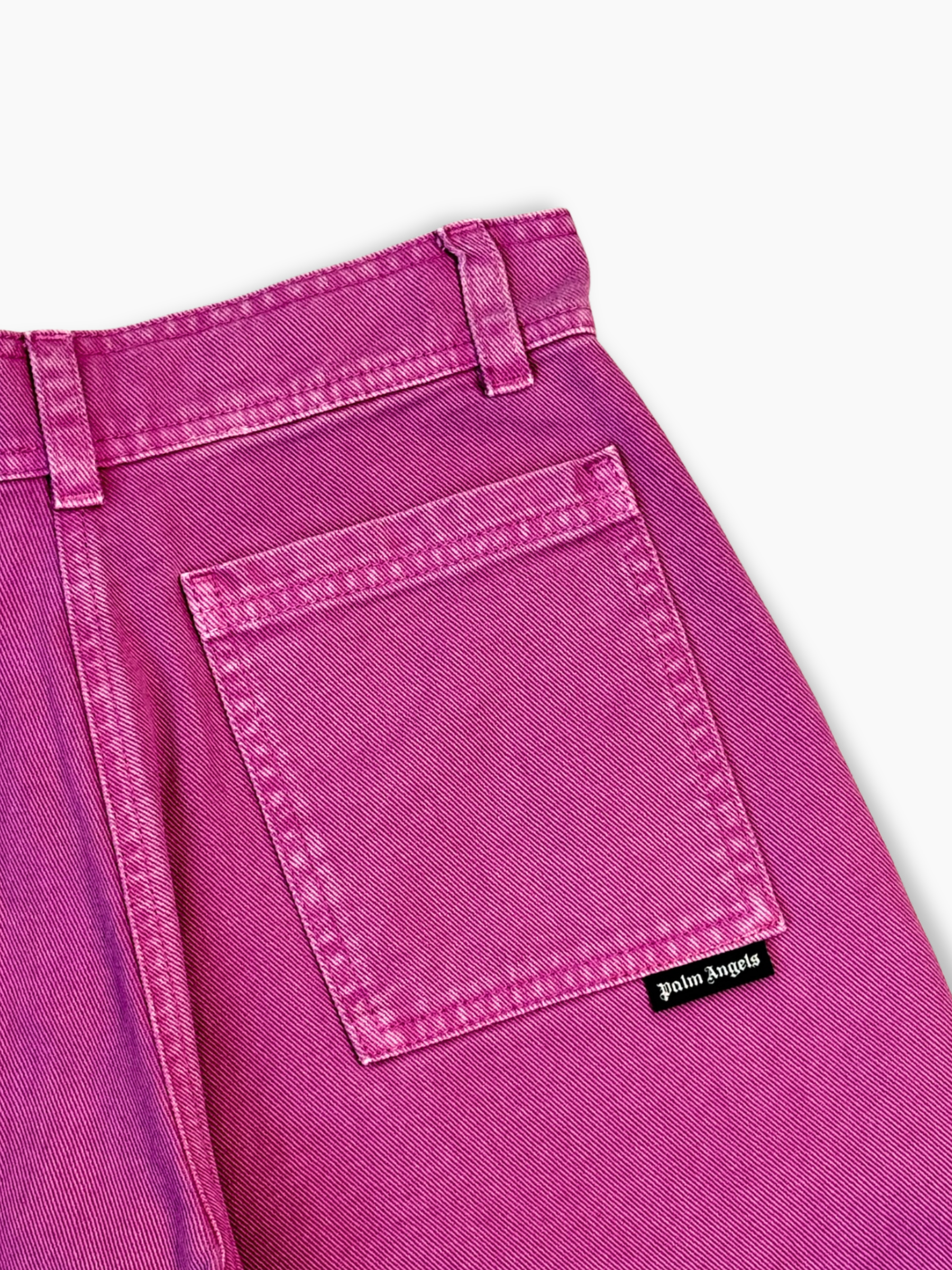 Neon pink denim shorts by Palm Angels, featuring a flared silhouette and utility details. The large front patch pockets are embellished with tone-on-tone embroidery featuring the brand's iconic palm trees. The faded wash and metal eyelets add a bold, contemporary touch.