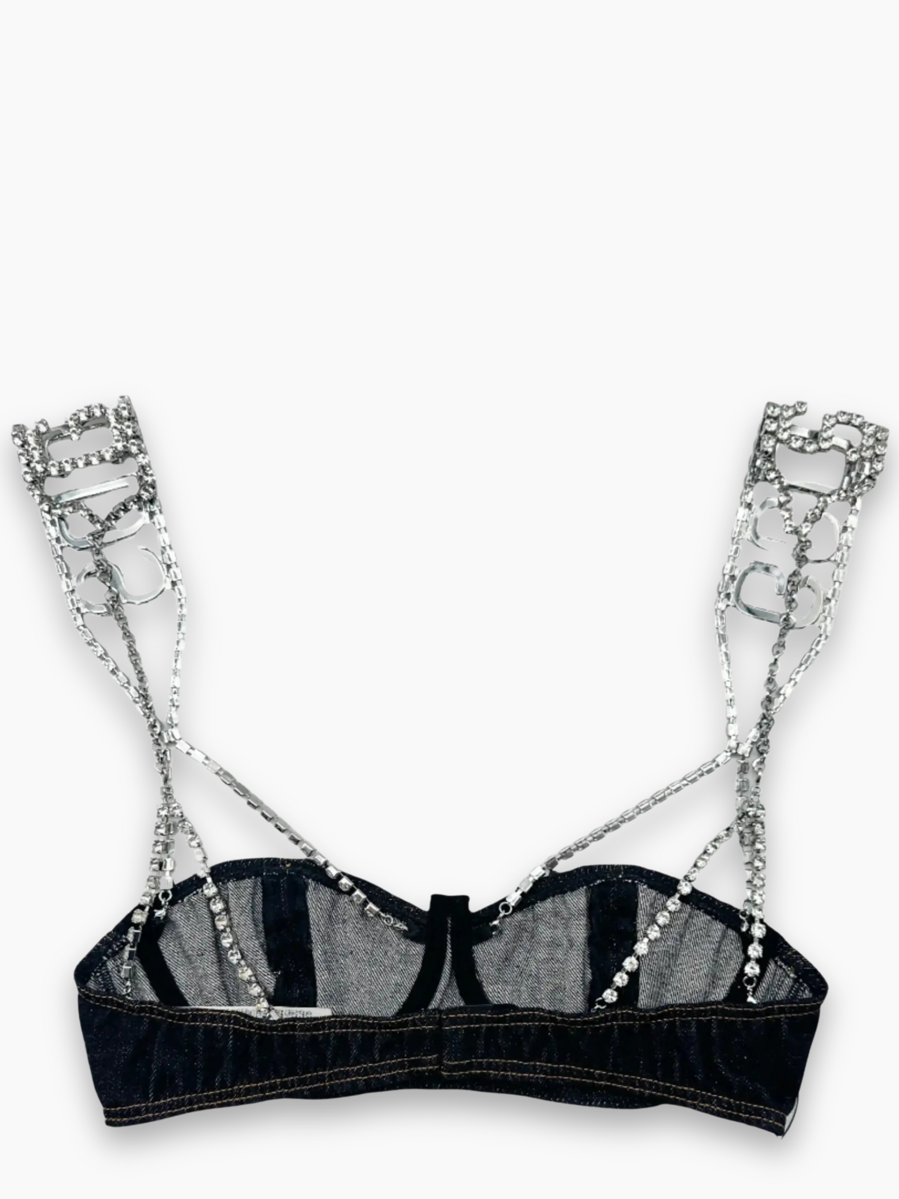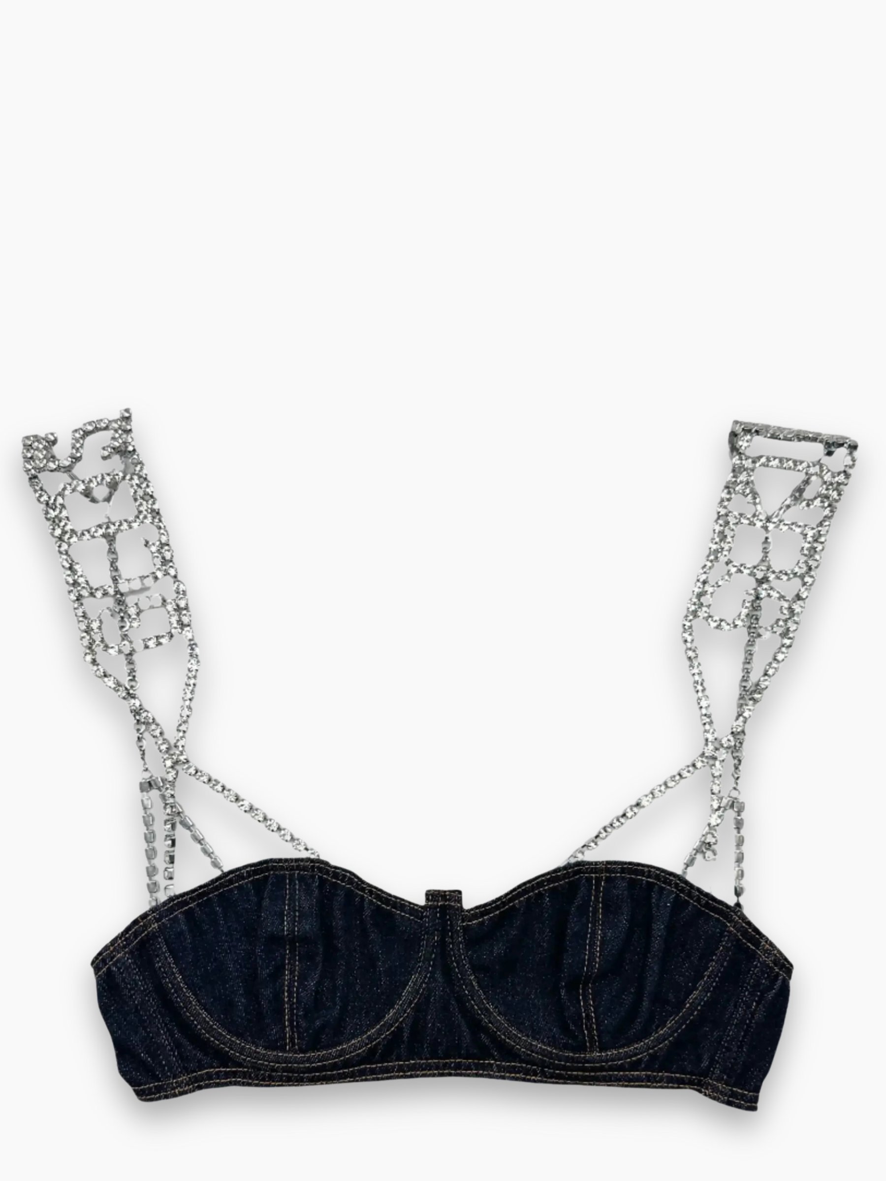 Discover the GCDS denim top with jeweled shoulder straps, perfect for a bold and glamorous look. This bustier combines textured black denim with rhinestone shoulder straps that form the GCDS logo. Made in Italy, uncompromising quality and style. Luxe streetwear looks, evening outfits, or special events.
