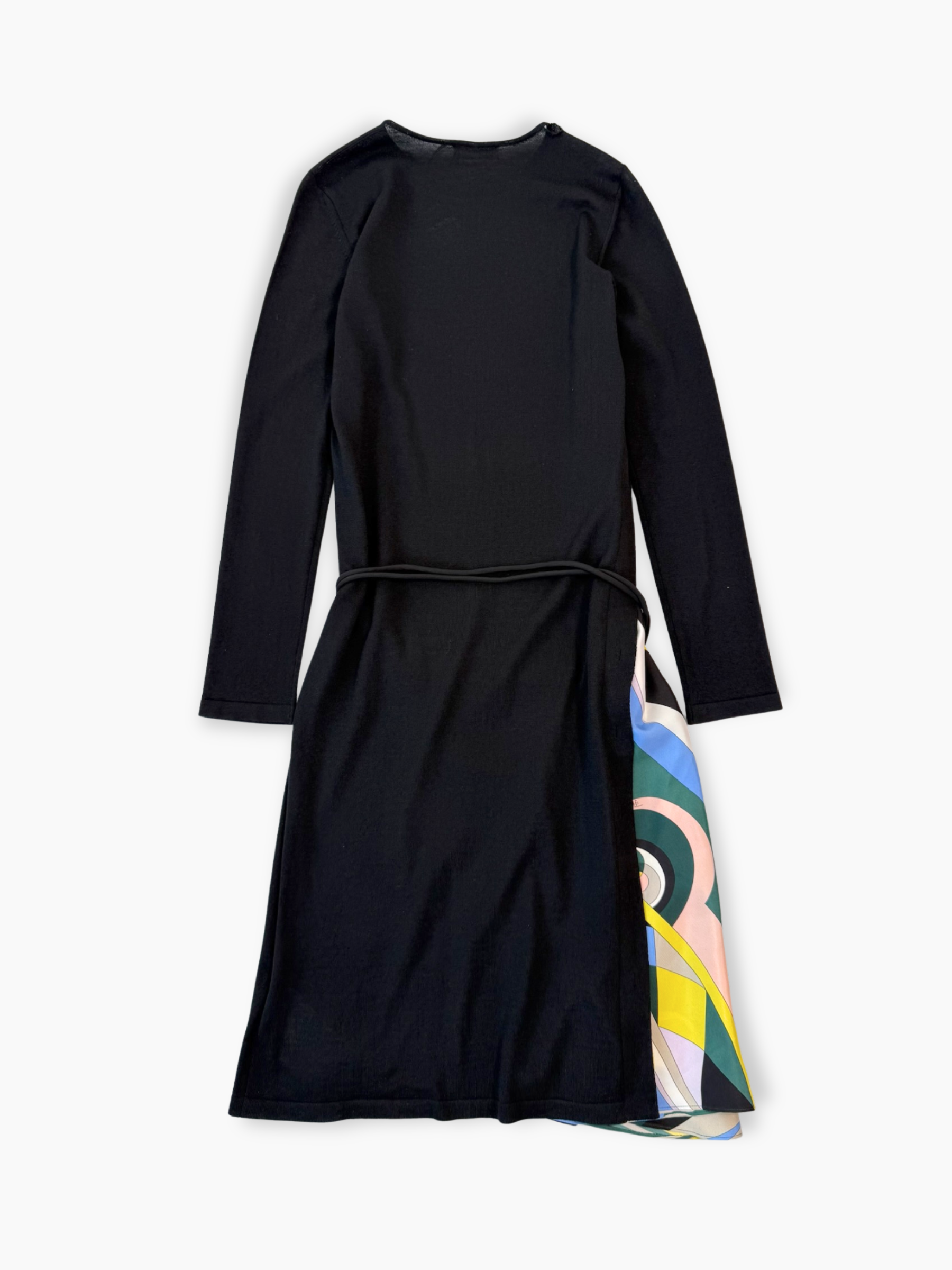 Long-sleeved black dress featuring a sophisticated design with a multicolored side insert in lightweight fabric and a drawstring belt with jeweled details. The simple silhouette is embellished with side buttons and a pop of color that adds personality and elegance.