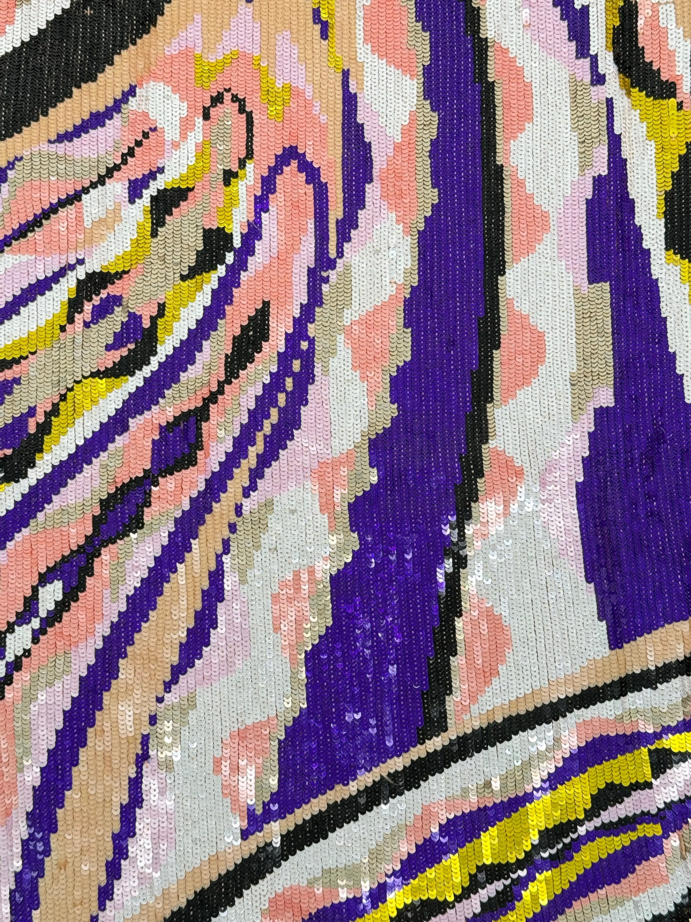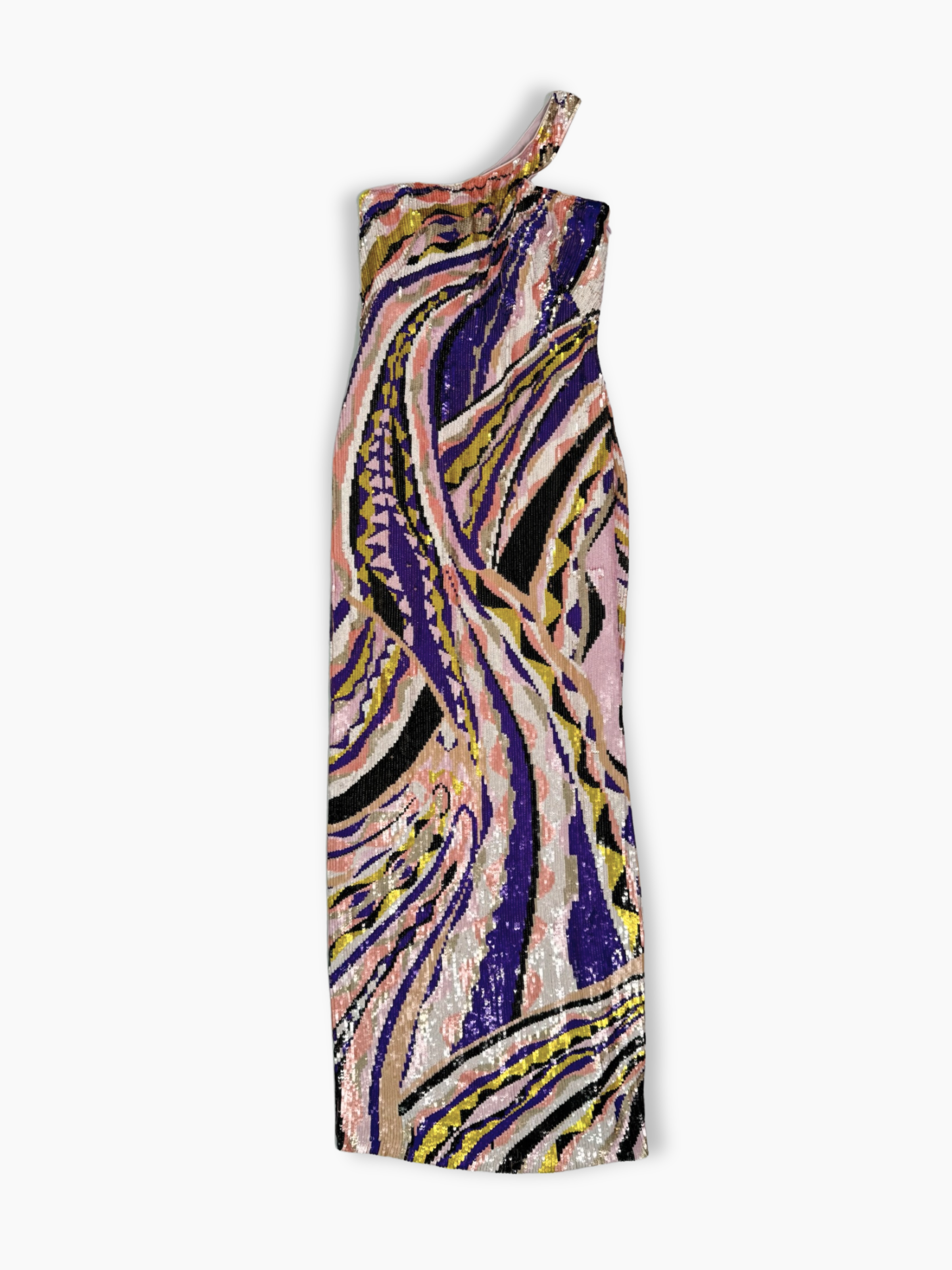 Long, multicolored one-shoulder dress entirely covered in sequins for a luminous and sophisticated effect. The asymmetrical design highlights the shoulder, while the fitted cut elegantly flatters the figure. An iconic piece for gala evenings, exclusive events, or special parties.