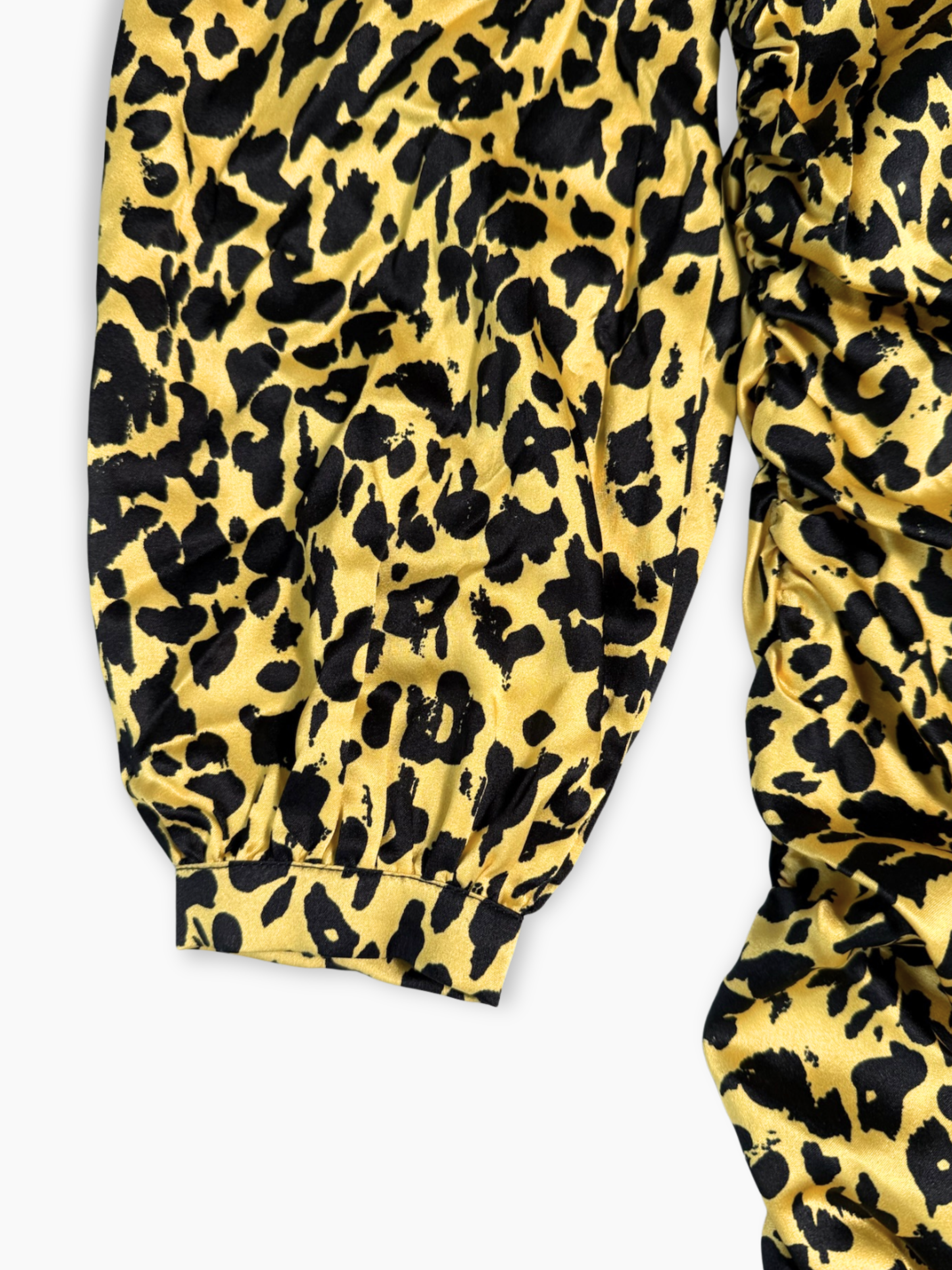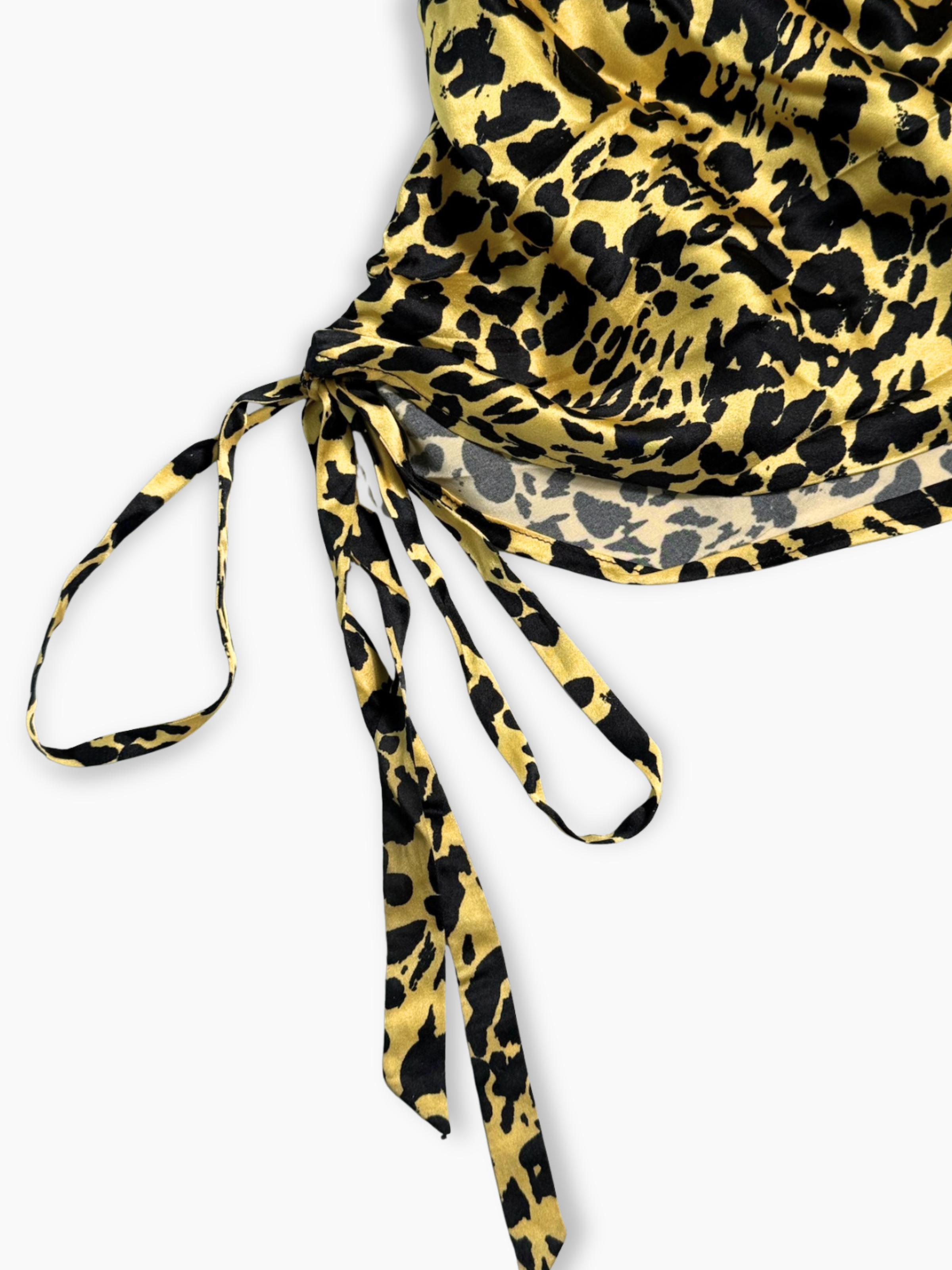 Yellow satin short dress with an animal print, featuring a deep crossover neckline and adjustable gathers with side ties. A sensual and distinctive piece, ideal for evenings and special occasions.