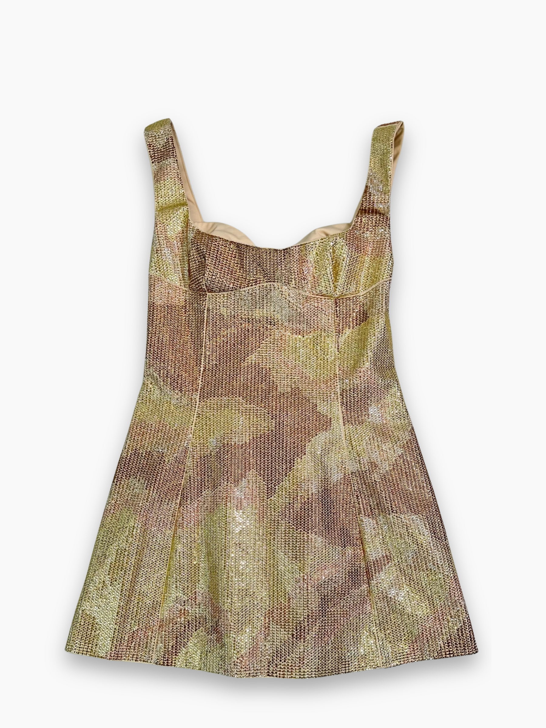 Abito corto in tessuto luminoso con fantasia sui toni oro, beige e bronzo. Il design presenta una struttura con coppe sagomate che valorizzano la silhouette, mentre la gonna leggermente svasata dona armonia e movimento. Perfetto per eventi, serate e look statement.