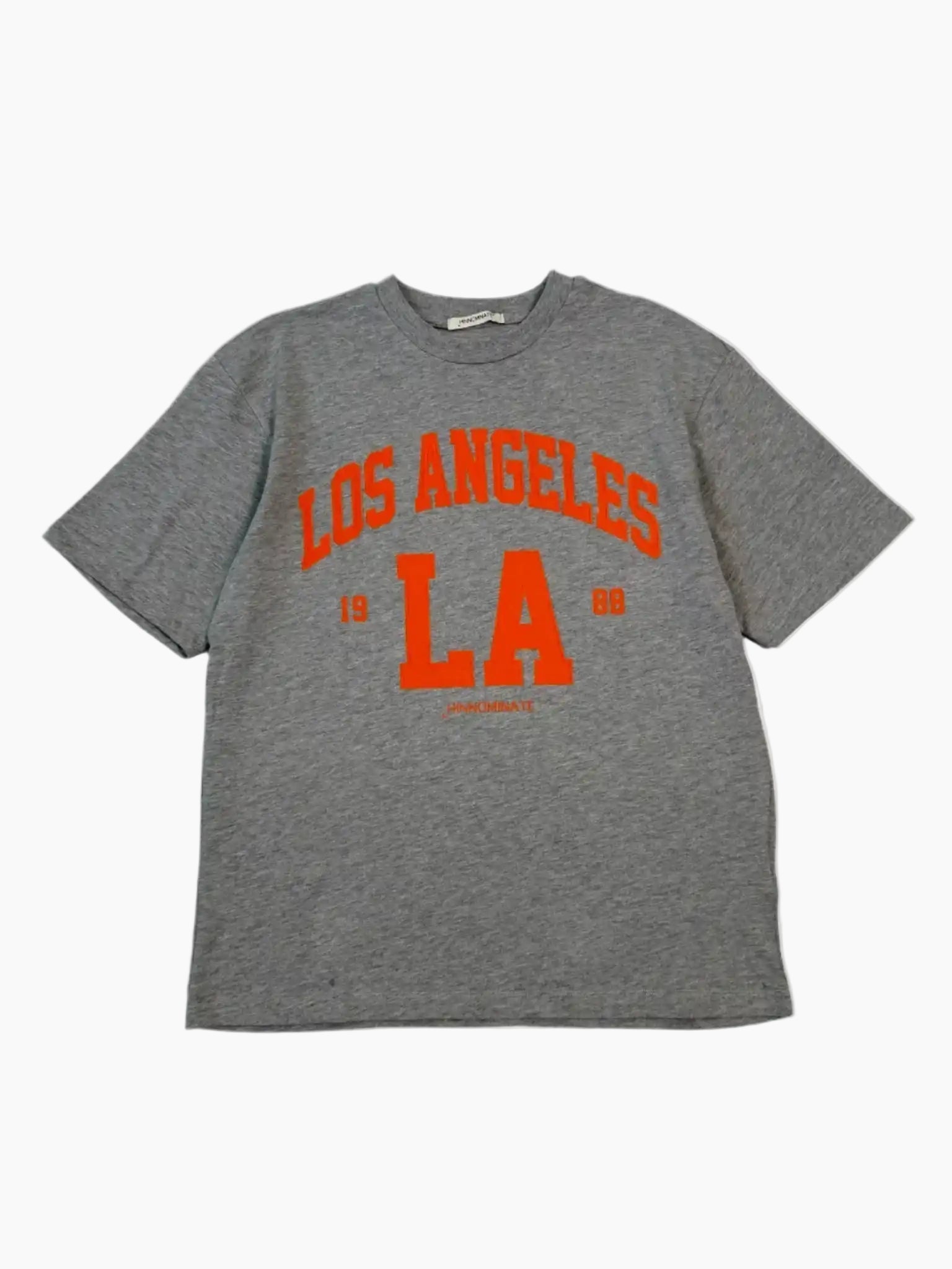 Soft heather grey cotton jersey T-shirt featuring a "Los Angeles LA" print on the front with bright orange details. Slightly oversized fit and crew neck. Finished with an internal Hinnominate logo label, it's a casual, urban piece perfect for a relaxed yet trendy look.