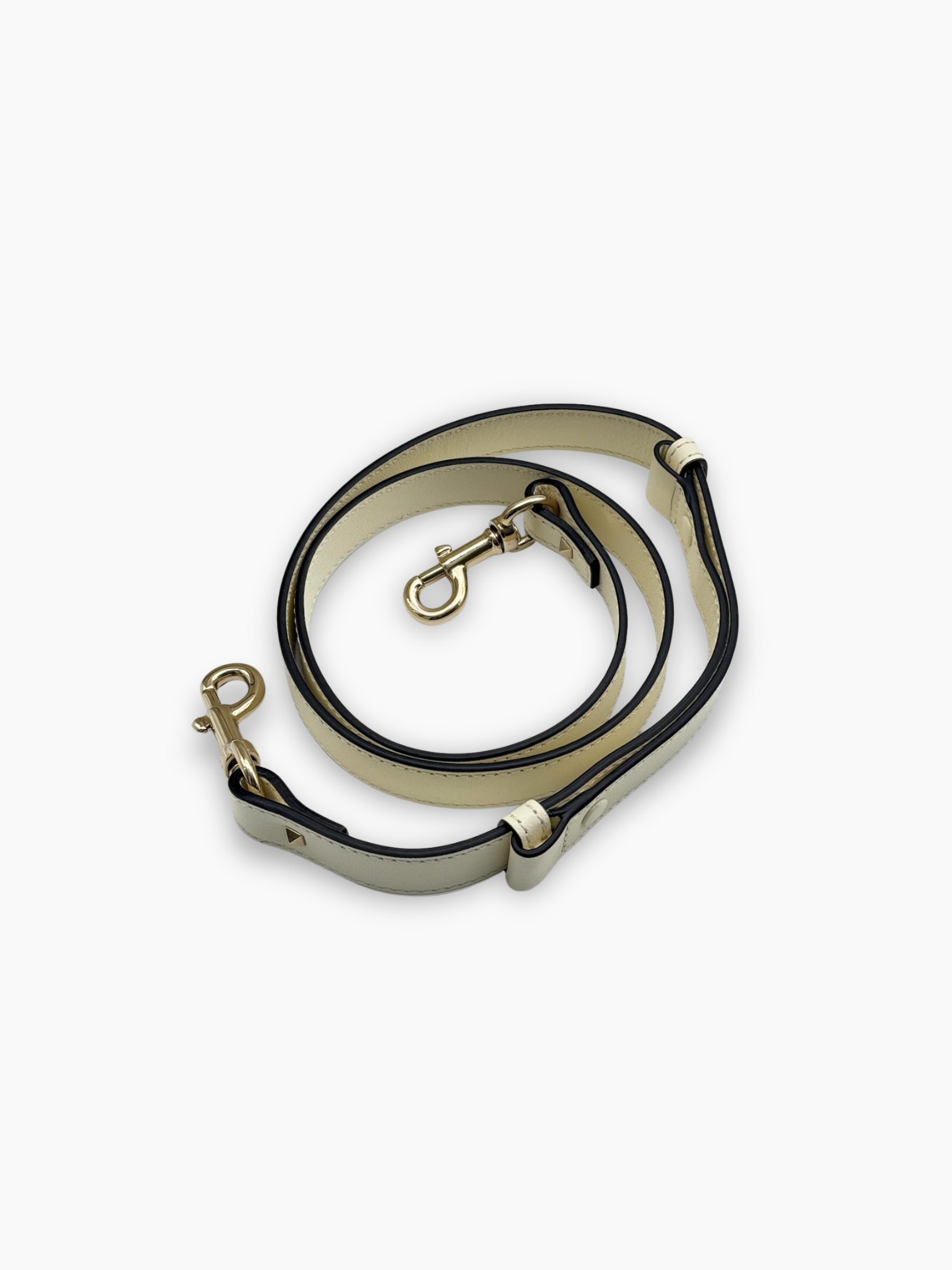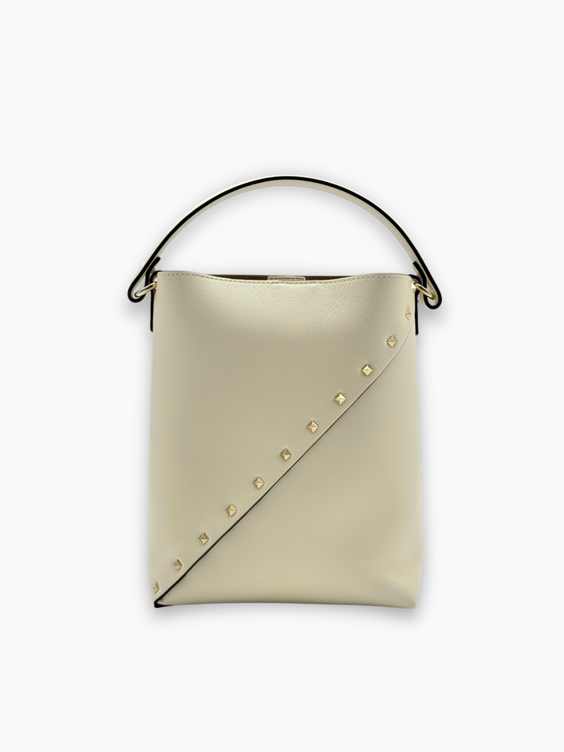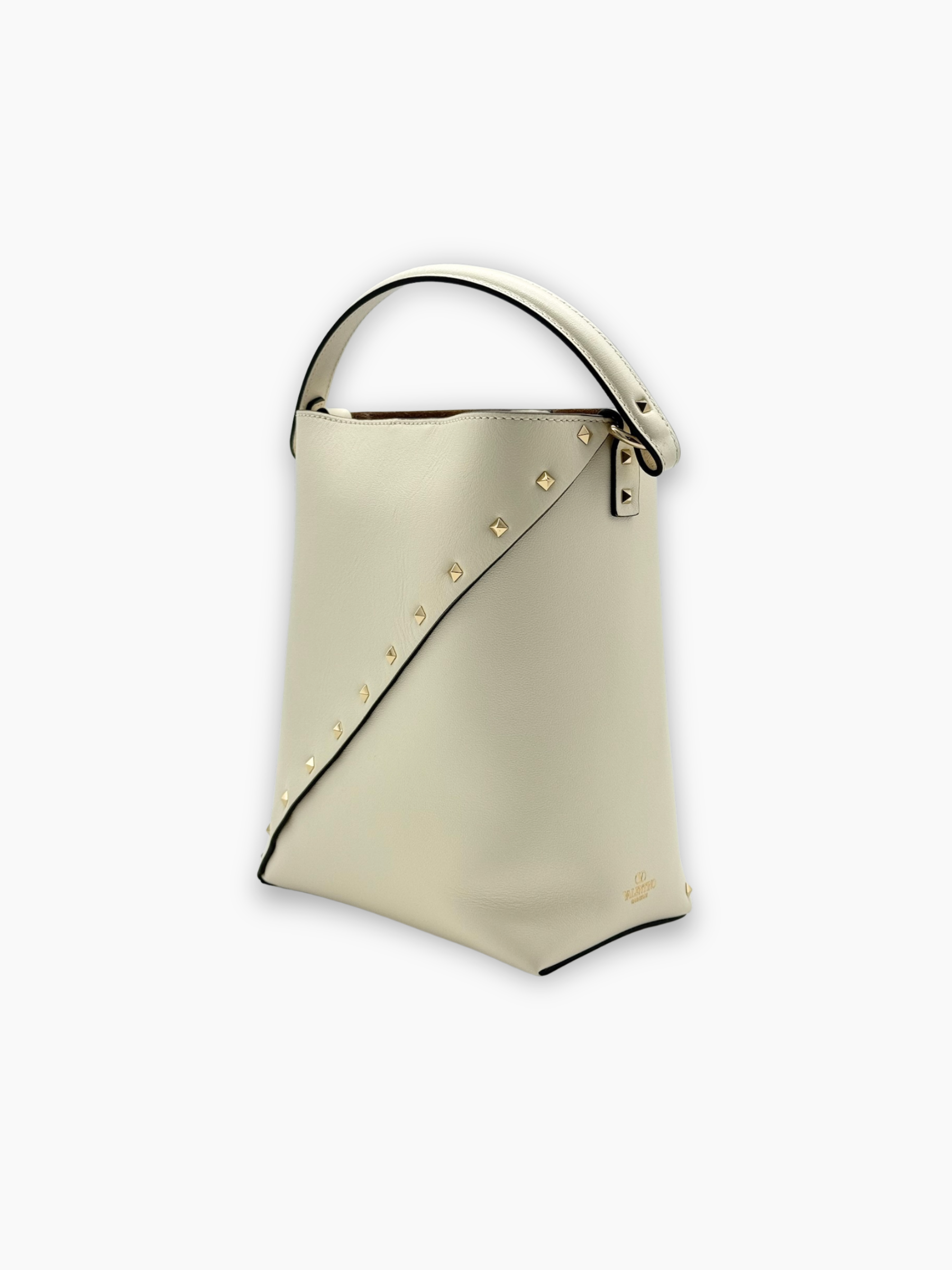 White Rockstud bucket bag, crafted from premium smooth leather. Iconic and sophisticated, it's embellished with gold pyramid studs that enhance its bold, contemporary look. Featuring an adjustable shoulder strap and drawstring closure, it combines elegance and practicality for a refined look with a rock edge.