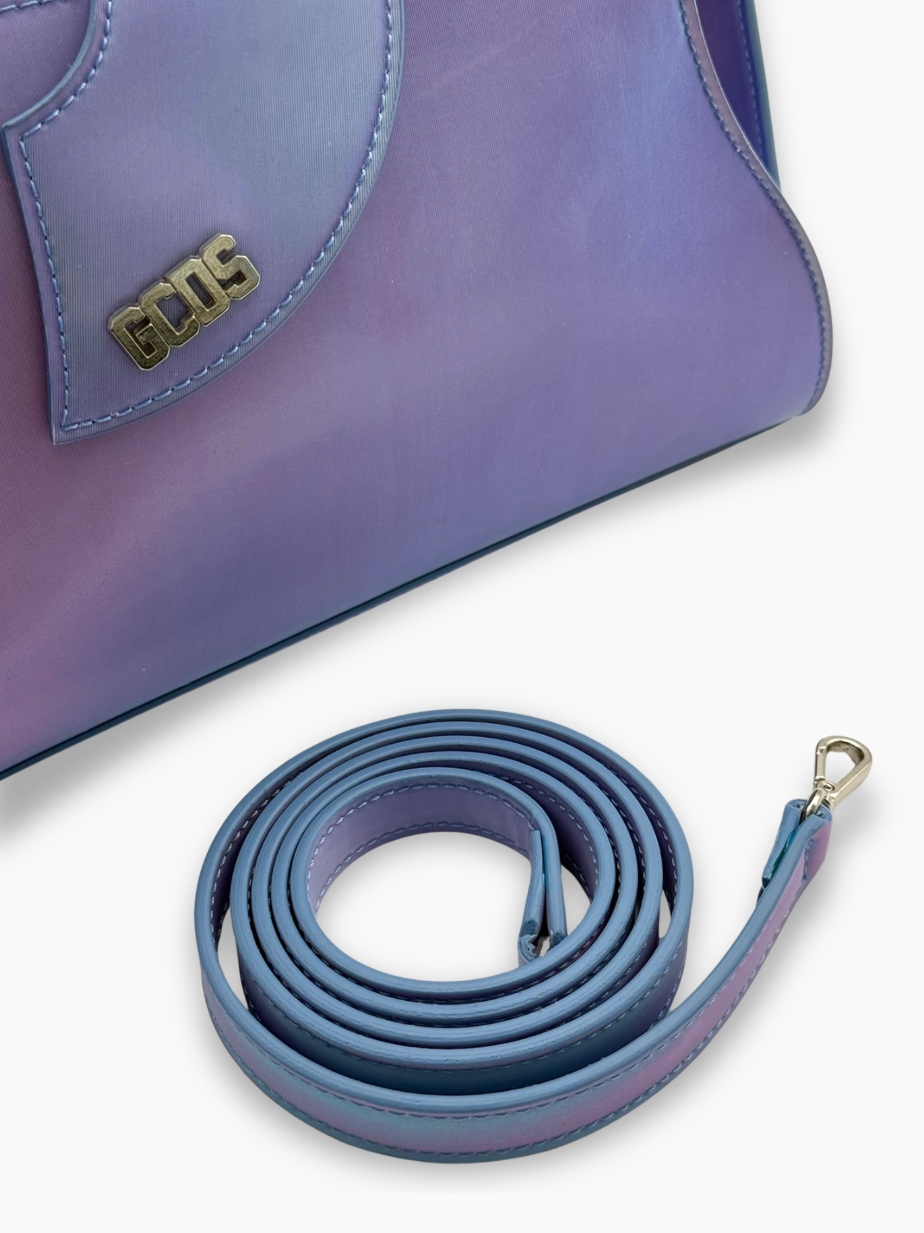 Con la sua finitura cangiante lilla-blu e la silhouette scultorea, questa borsa della linea Comma firmata GCDS è un accessorio statement perfetto per outfit audaci e raffinati. Realizzata in materiale effetto holographic con manico strutturato in tinta, è rifinita con logo metallico e dettagli dal design contemporaneo. Una borsa compatta ma scenografica, da portare a mano o a spalla per aggiungere un tocco futuristico al tuo look.