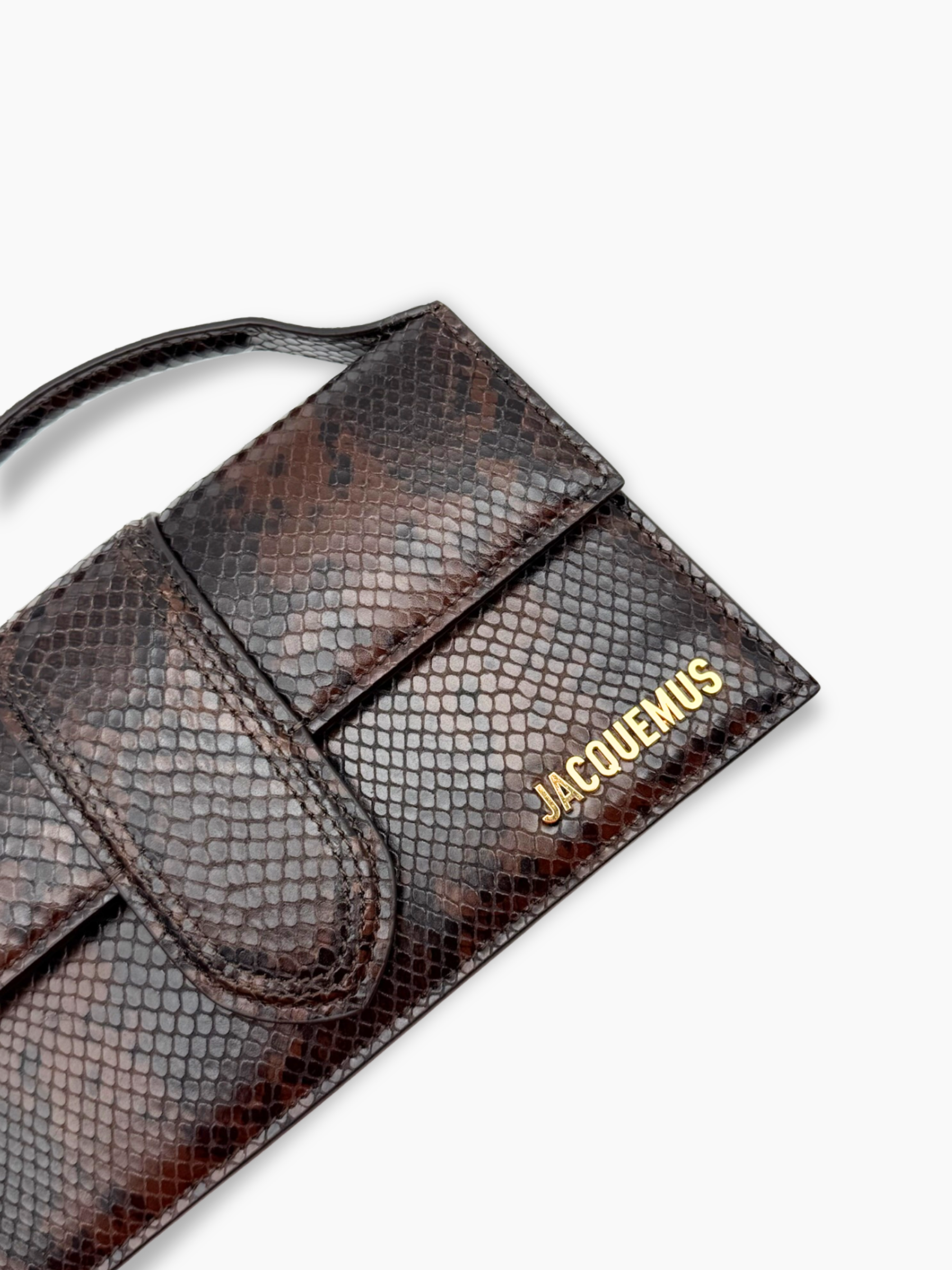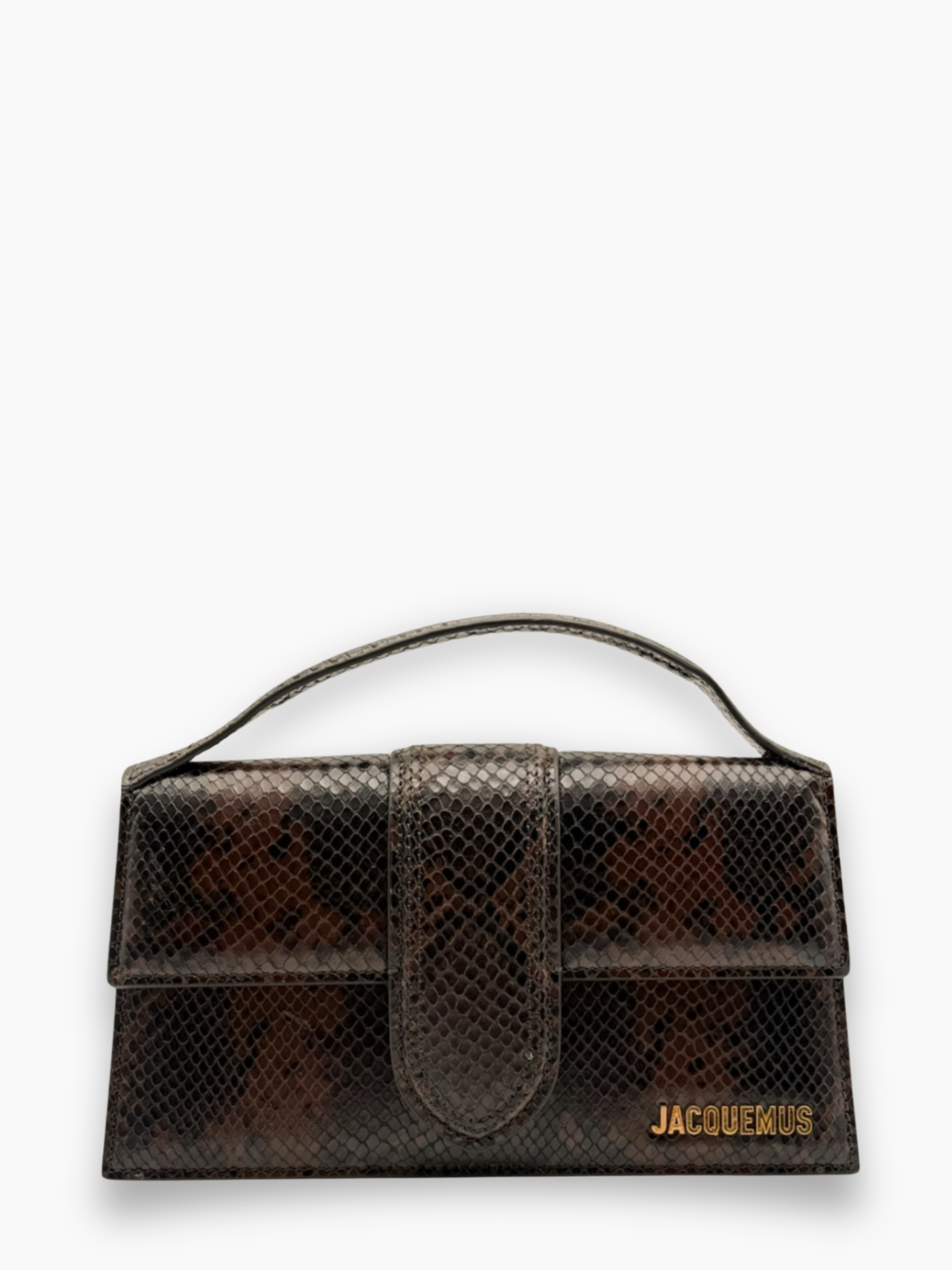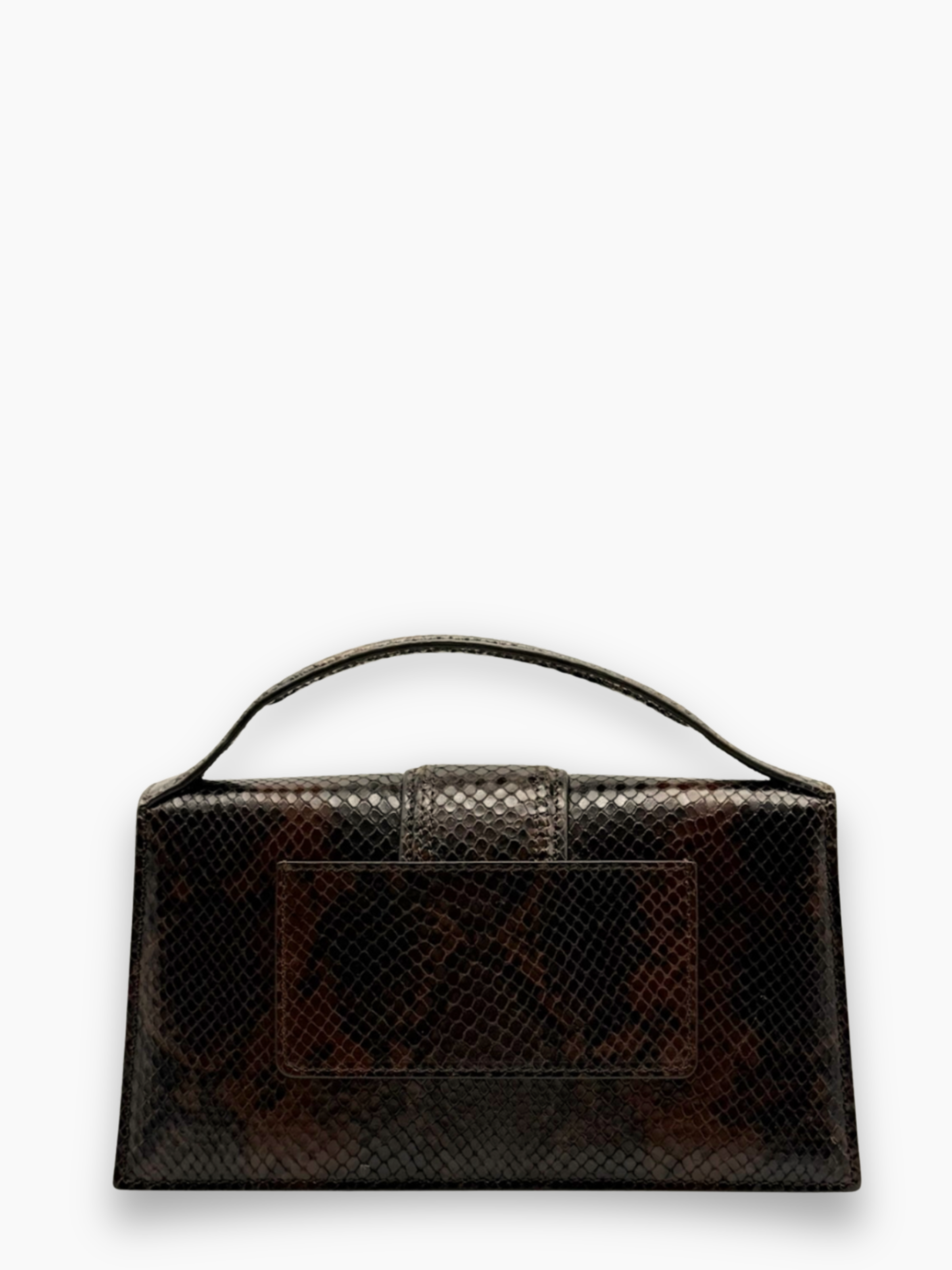 Elegant and bold, the Jacquemus Le Grand Bambino bag with python print is a statement accessory that adds character to any look. Crafted from faux snakeskin leather, it features a rigid design with a top handle and an adjustable and removable shoulder strap. The gold Jacquemus logo adorns the front of the bag, while the lined interior offers plenty of space for day or evening essentials.