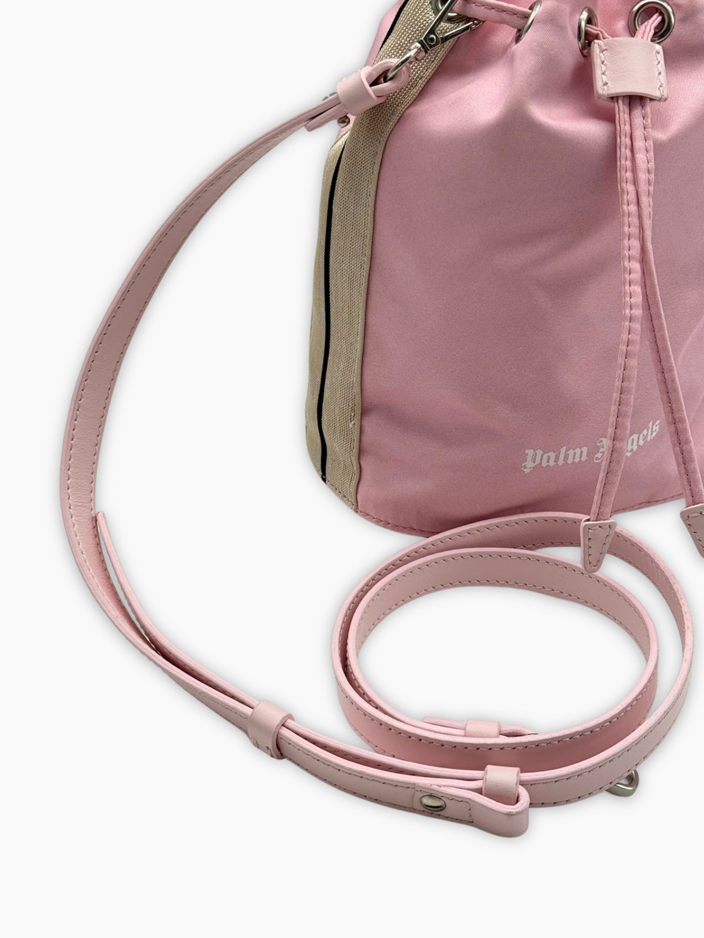 Compact yet bold, this Palm Angels bucket bag combines shiny pink nylon with beige details and tonal leather trim. The design is enhanced by the white logo print on the front and a drawstring closure, while the adjustable leather strap allows you to carry it over the shoulder or crossbody. An urban-chic accessory perfect for elevating your everyday look.