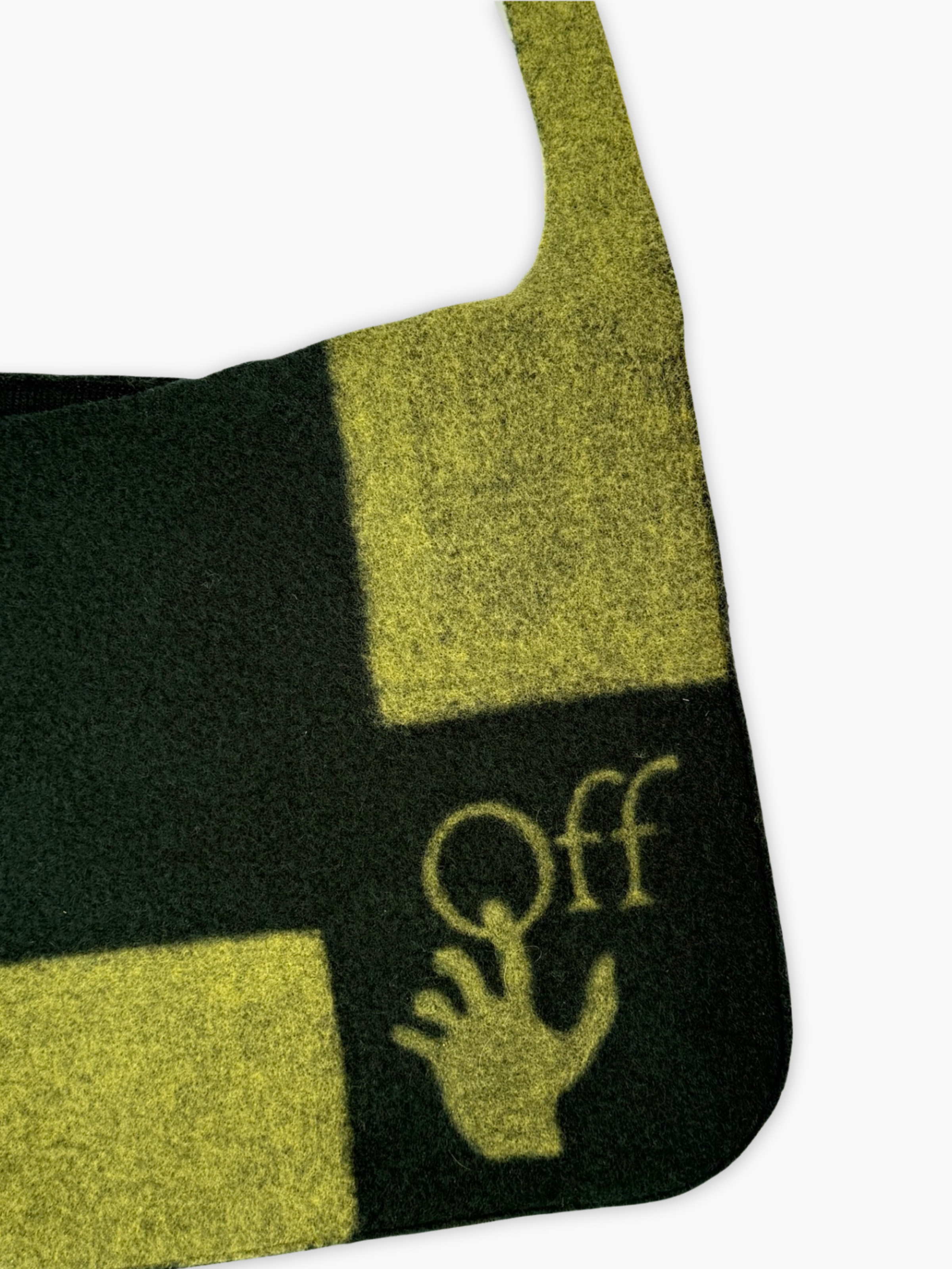 Add an urban, graphic touch to your look with this maxi Off-White bag. Crafted from a felt-effect fabric, it features a printed "Off" hand logo on a green geometric background. The soft, drawstring bag shape with a single handle makes it easy to carry over the shoulder, perfect for everyday wear.