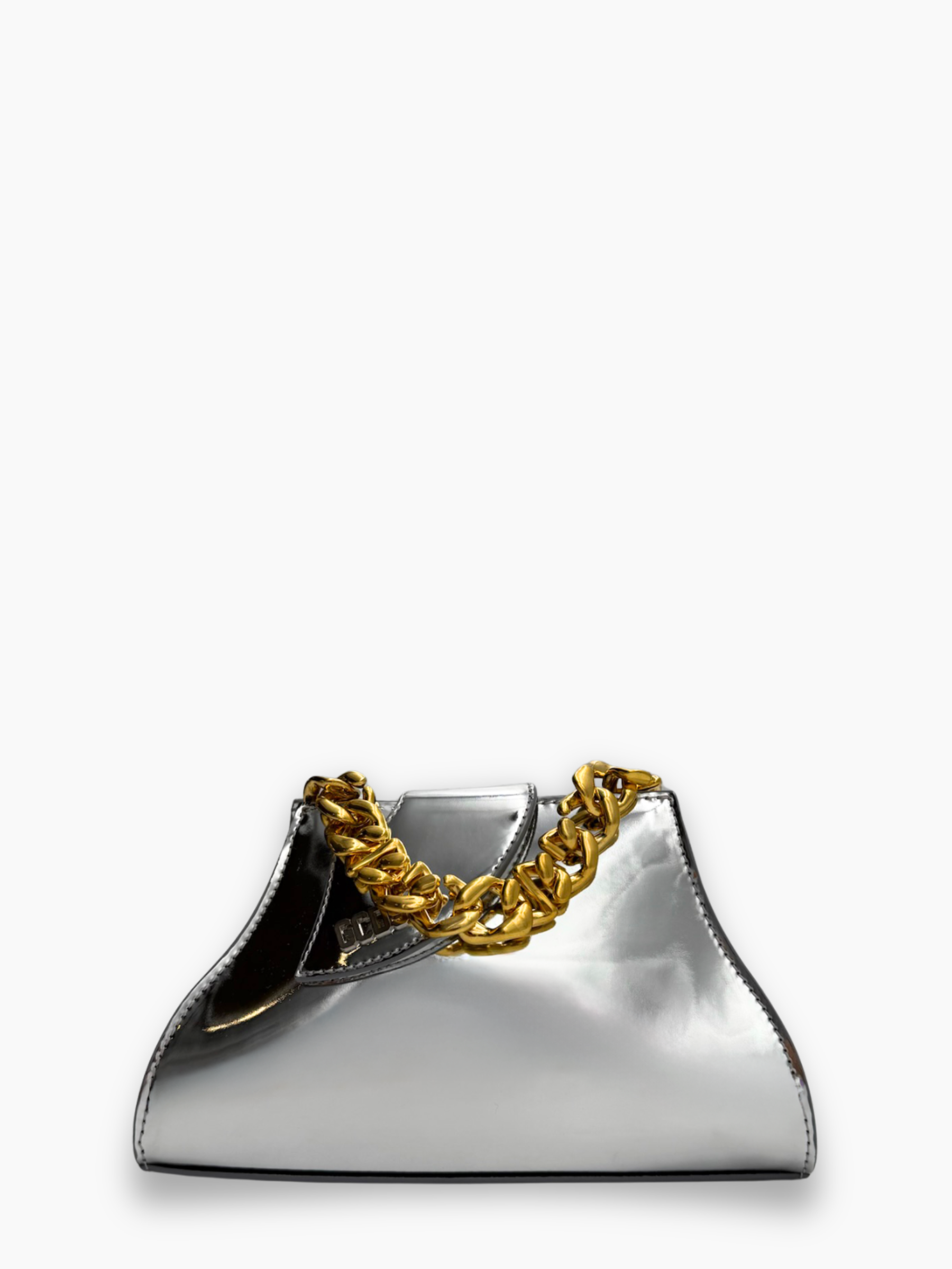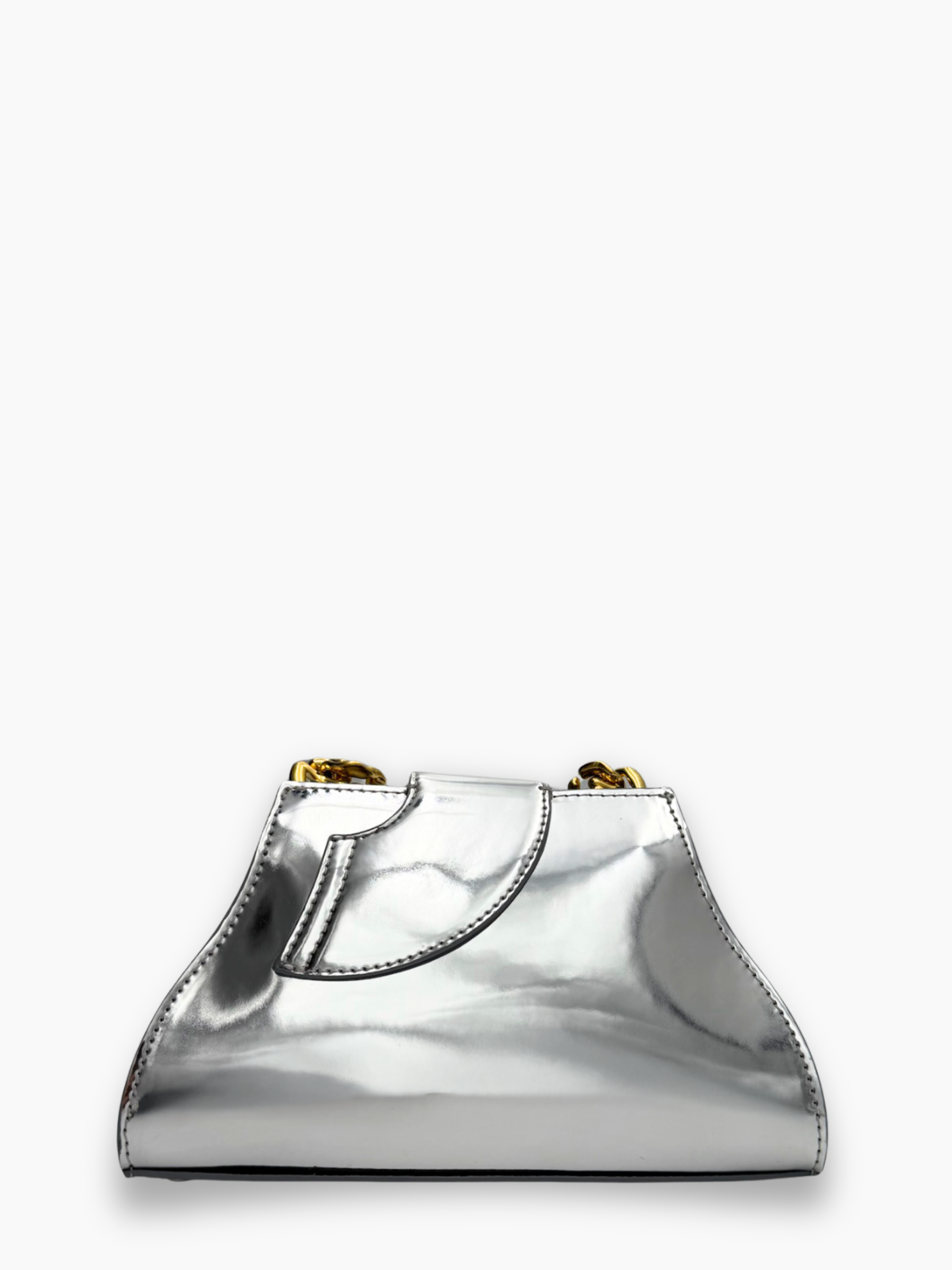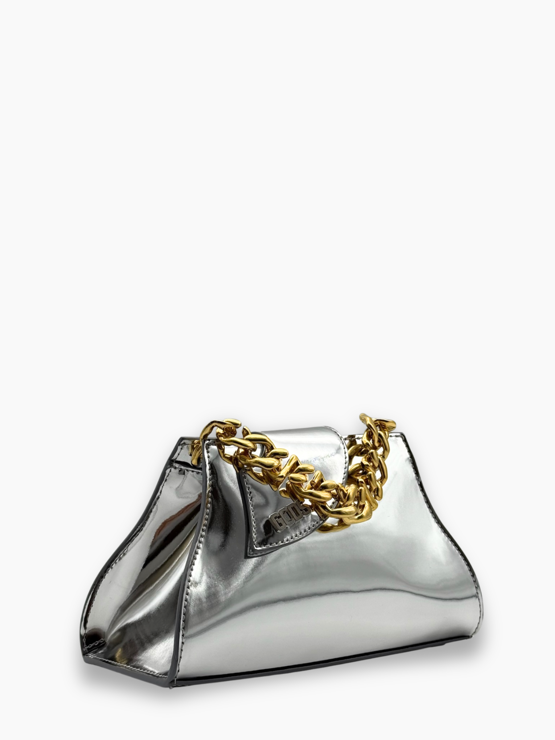 Borsa GCDS in pelle metallizzata argento, caratterizzata dal design strutturato a trapezio e dalla catena rigida in metallo dorato che aggiunge un tocco bold e contemporaneo. Il finish lucido effetto specchio e il logo GCDS in metallo rendono questo modello perfetto per look da sera e outfit d’impatto.