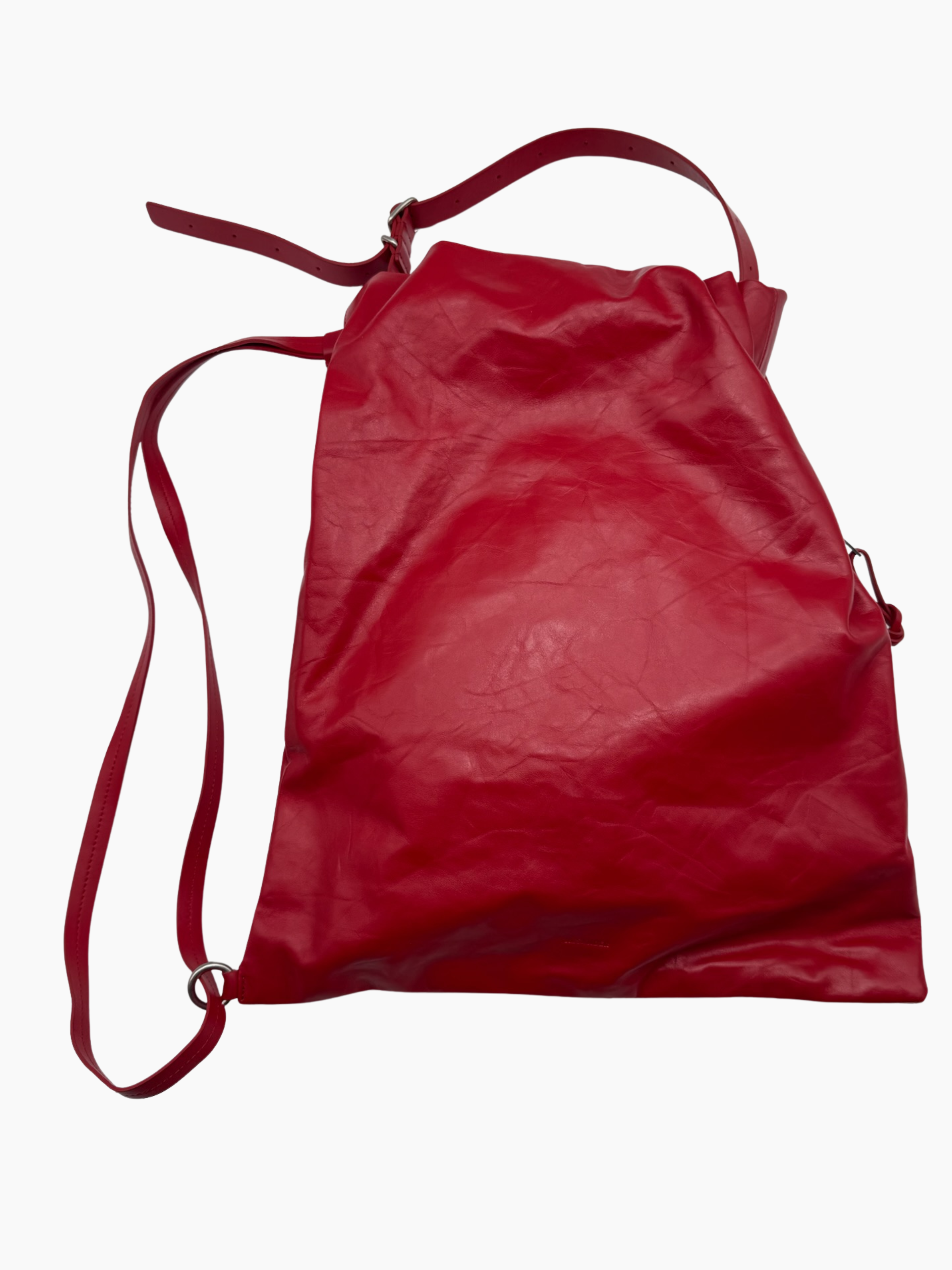 Borsa Jil Sander in pelle rossa dal design morbido e minimalista. La struttura destrutturata, le linee pulite e gli spallacci regolabili conferiscono a questo modello un’estetica contemporanea e funzionale, ideale per look quotidiani ricercati.